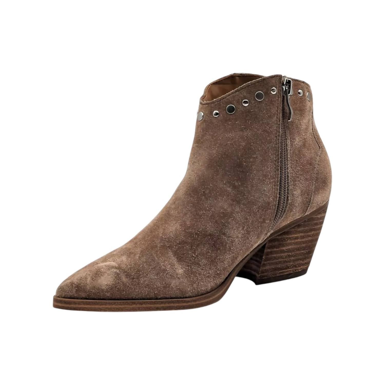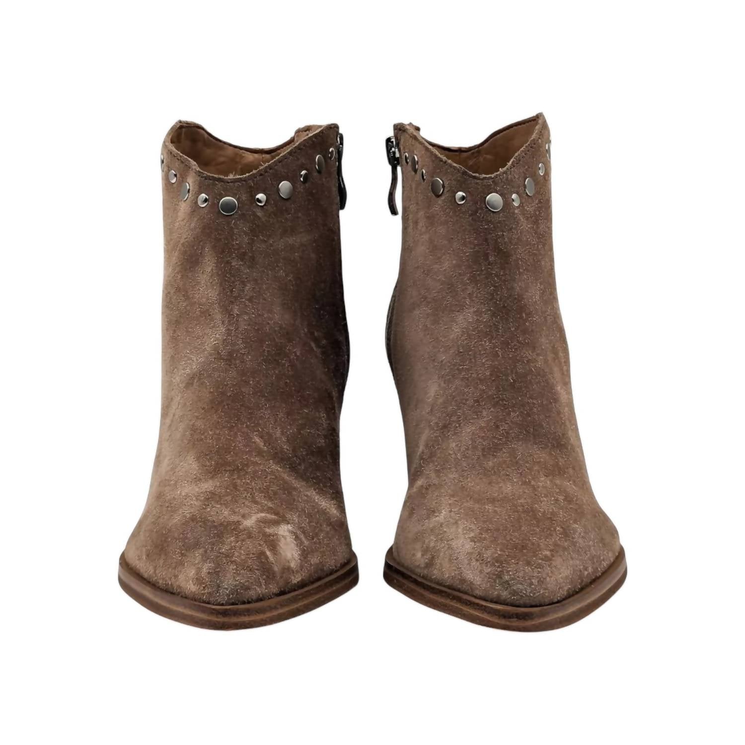 Introducing the Women's Deni Cowboy Boot by MARC FISHER, a stylish blend of western flair and modern elegance. Crafted from medium brown suede, these ankle boots feature a chic pointed toe and a comfortable medium shoe width. Designed with a trendy block heel, they provide stability and a touch of elevated sophistication. Perfect for those looking to add a rustic charm to their wardrobe, these boots stand out with their timeless design and versatile appeal.