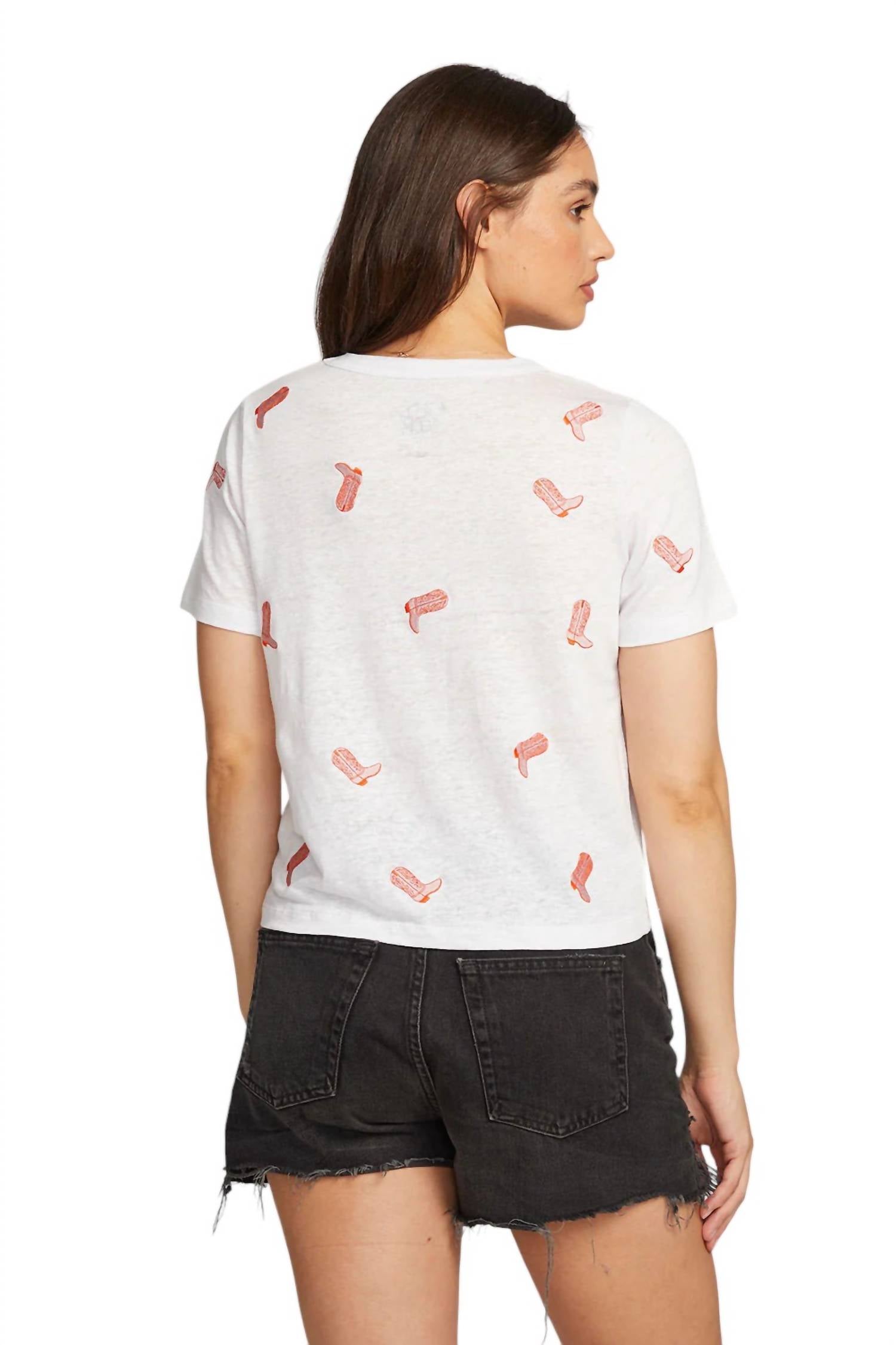 Introducing the Allover Cowboy Boot Top by Chaser, a unique blend of casual comfort and standout style. This women's white short-sleeved tee is crafted from 97% linen and 3% spandex, offering a breathable and stretchy fit. The crewneck design and attention-grabbing graphic pattern celebrate your love for country music. With a pull-on closure, this cropped tee is perfect for both everyday wear and making a statement, tailored for active lifestyles.