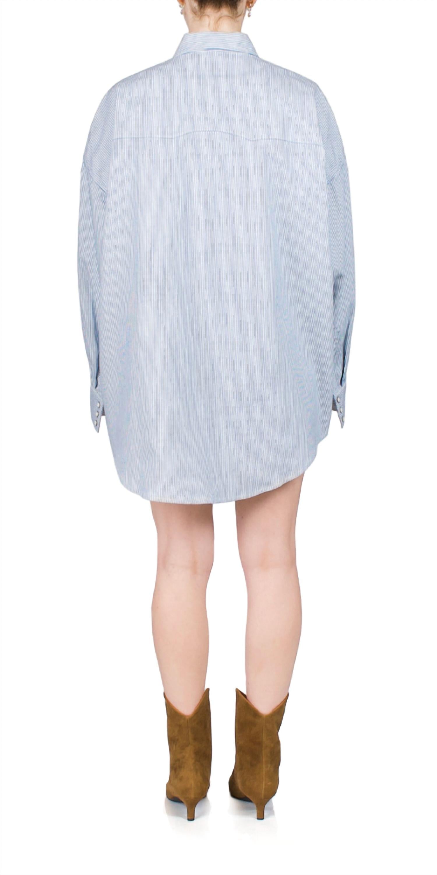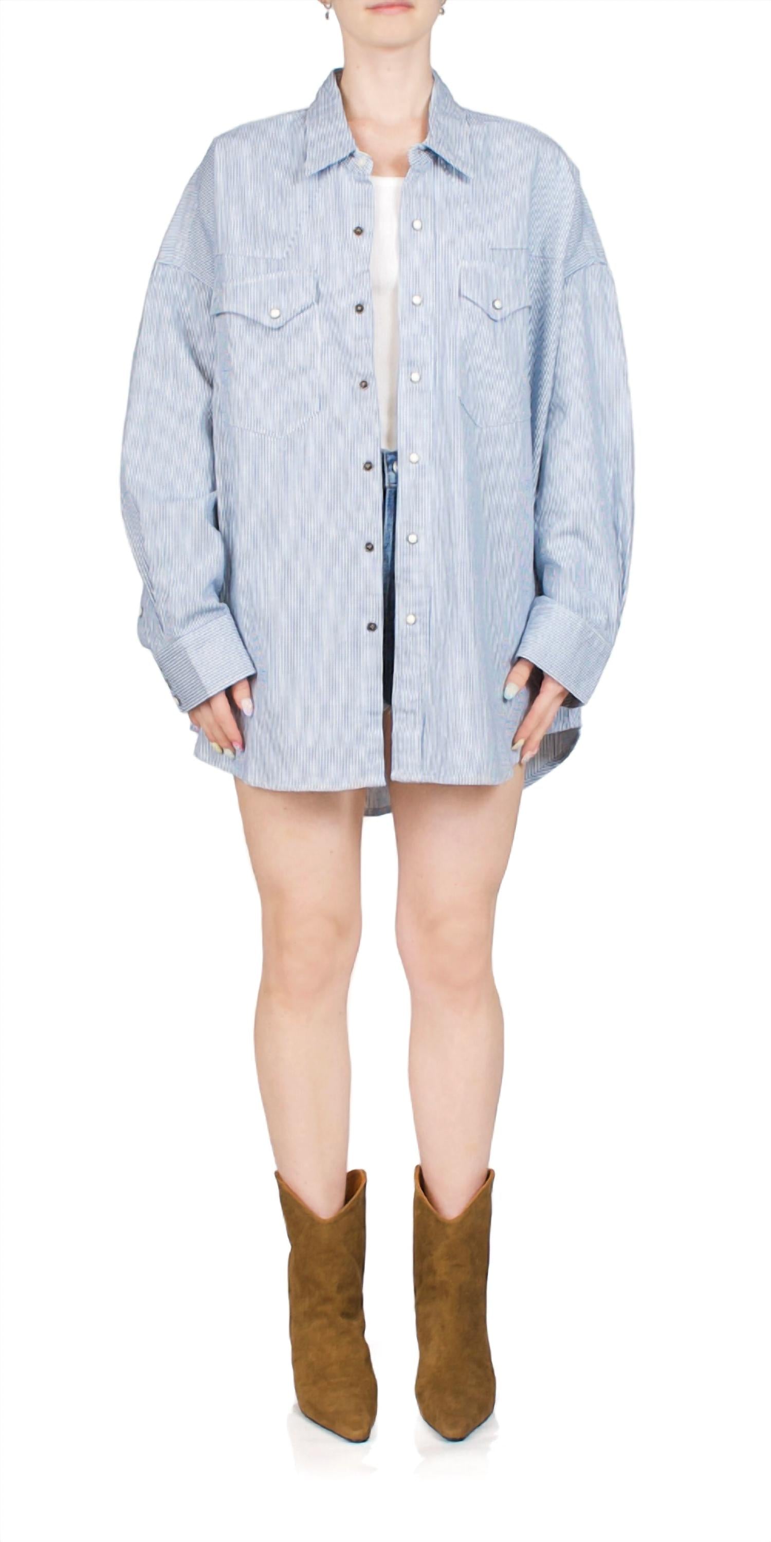 The Denimist Cowboy Shirt brings timeless style with its oversized silhouette and classic railroad stripe. Featuring snap button closures, snap cuffs, and two chest pockets, this shirt is crafted from 100% cotton for lasting comfort. Designed for an oversized fit. Model is 5'5" and wears size XS.