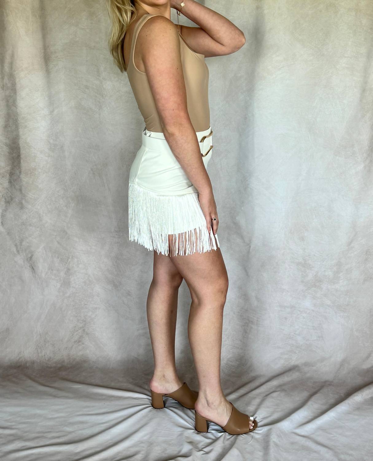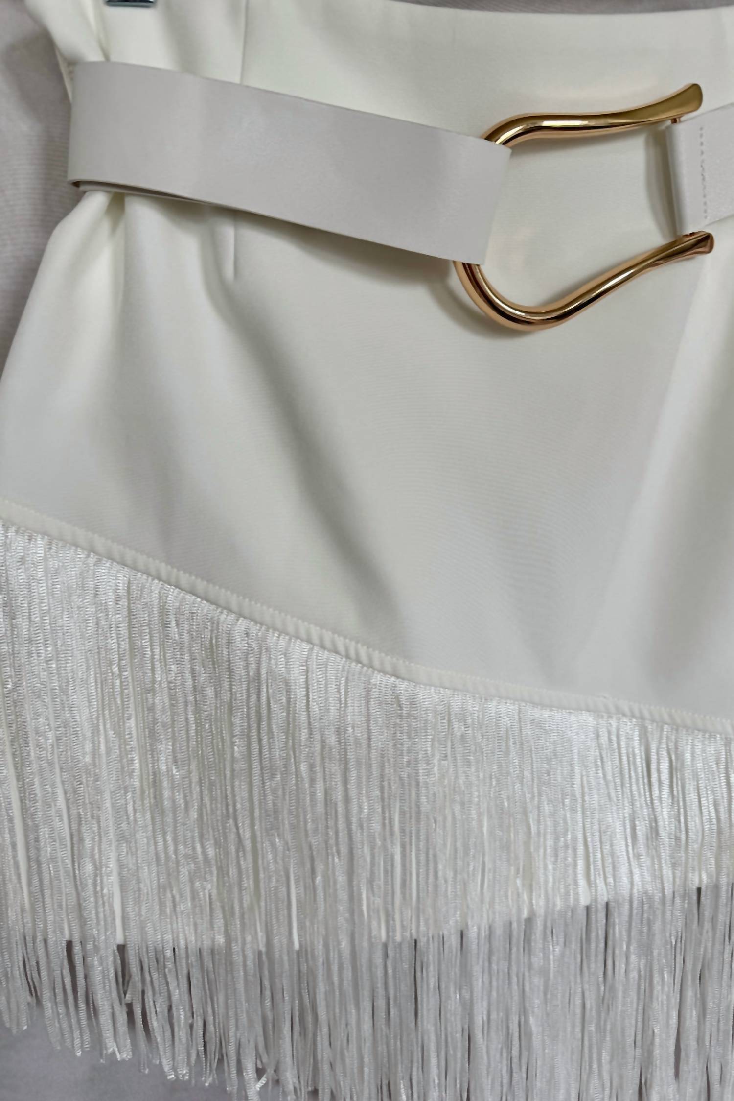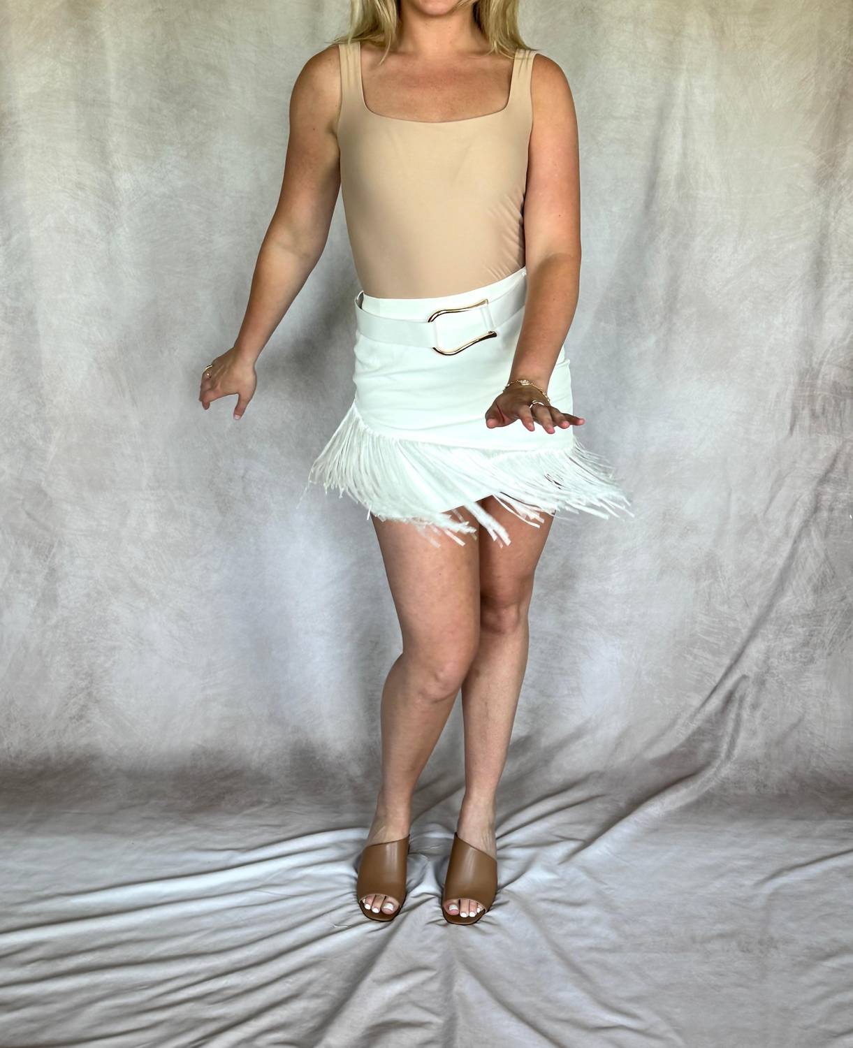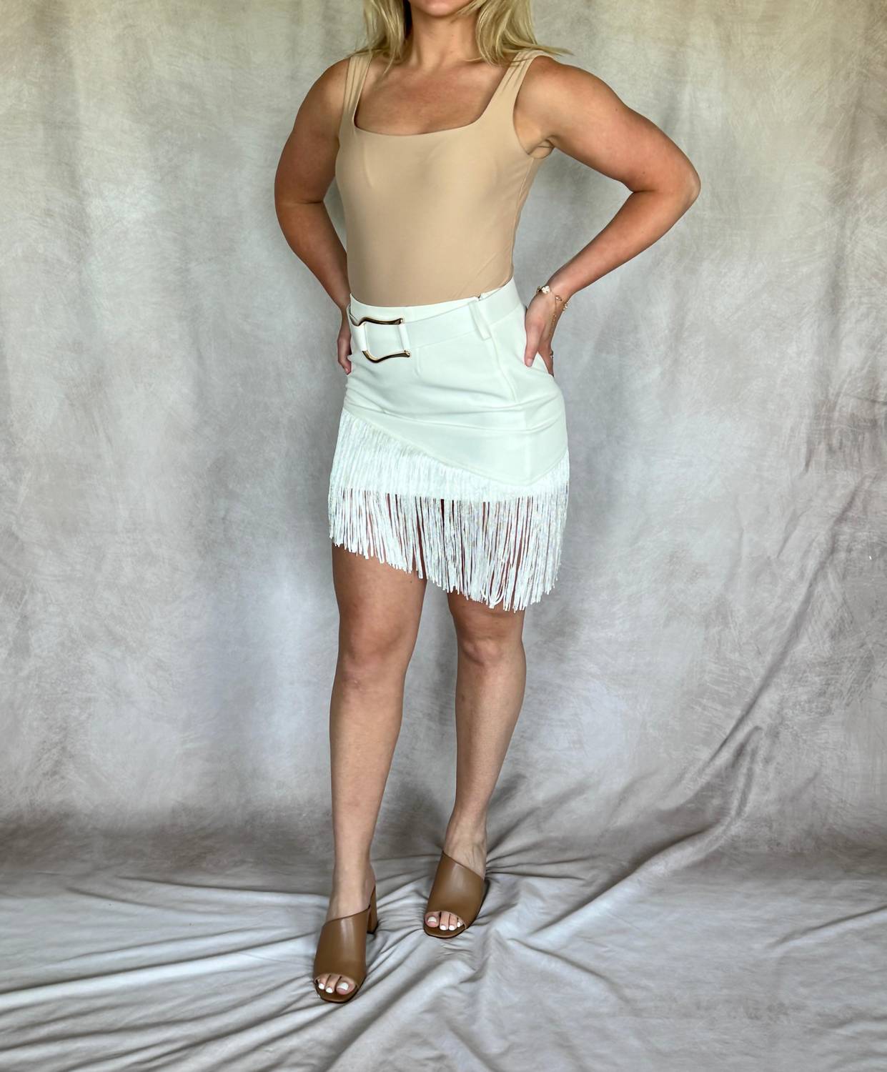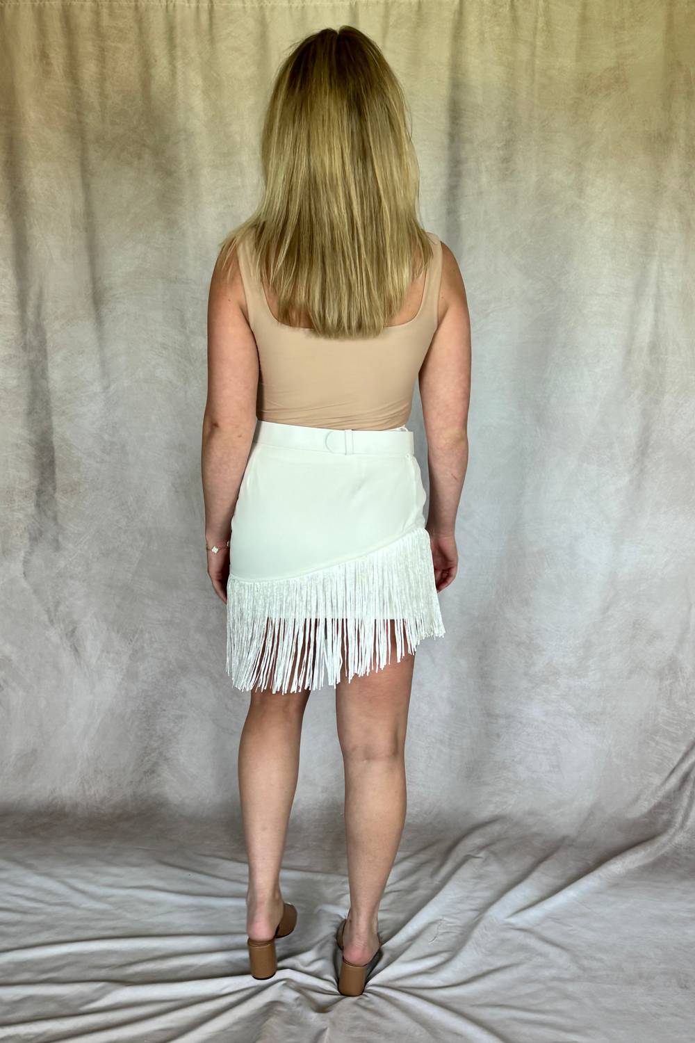 The perfect mini skirt does exist. Elevate your dinner party attire with the Rodeo Fringe Skirt by INA Fashion, a chic addition to any wardrobe. This mini skirt in timeless white features an asymmetrical fringe design, complete with a belt and lined interior for a polished look. Crafted from a blend of 60% Polyester, 35% Rayon, and 5% Nylon, it ensures comfort and style, all secured by a hidden side zipper. Enjoy a flattering fit with a sleek, solid pattern and no pockets, perfect for capturing the "Quiet Luxury" trend this summer.