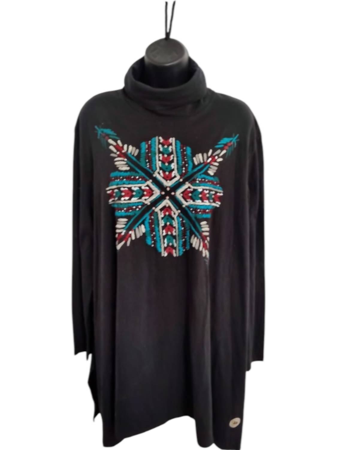 A classic staple that every closet needs. Chic and cozy essential for your fall wardrobe. Black, long-sleeve top showcases a turtleneck collar and features a vibrant, multi-colored pattern inspired by geometric and tribal motifs. With a convenient pull-on closure. Tunic-length piece blends style and practicality effortlessly. Care for it by hand washing to maintain its eye-catching design and quality.