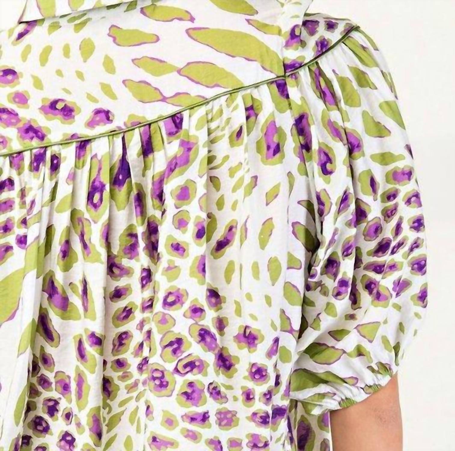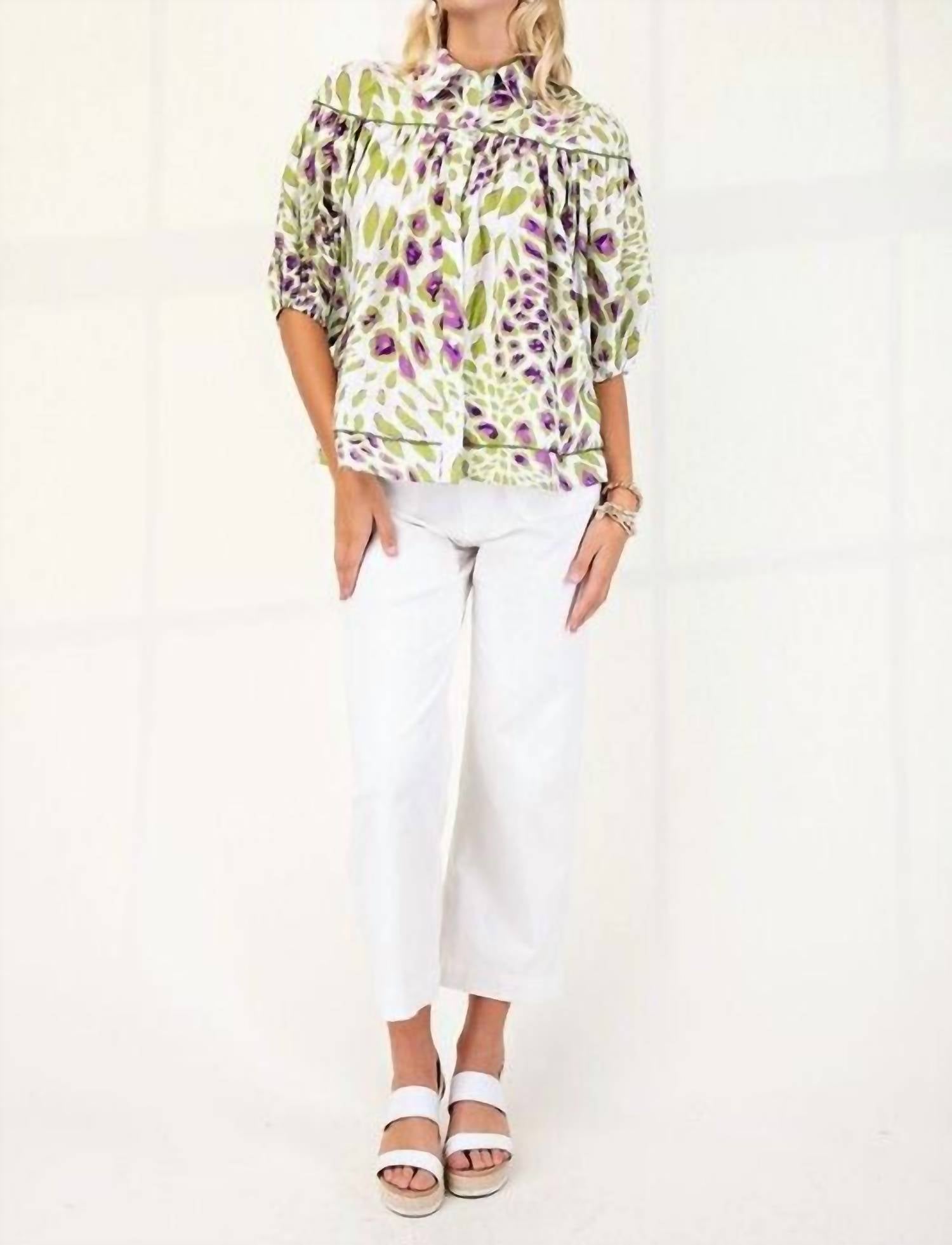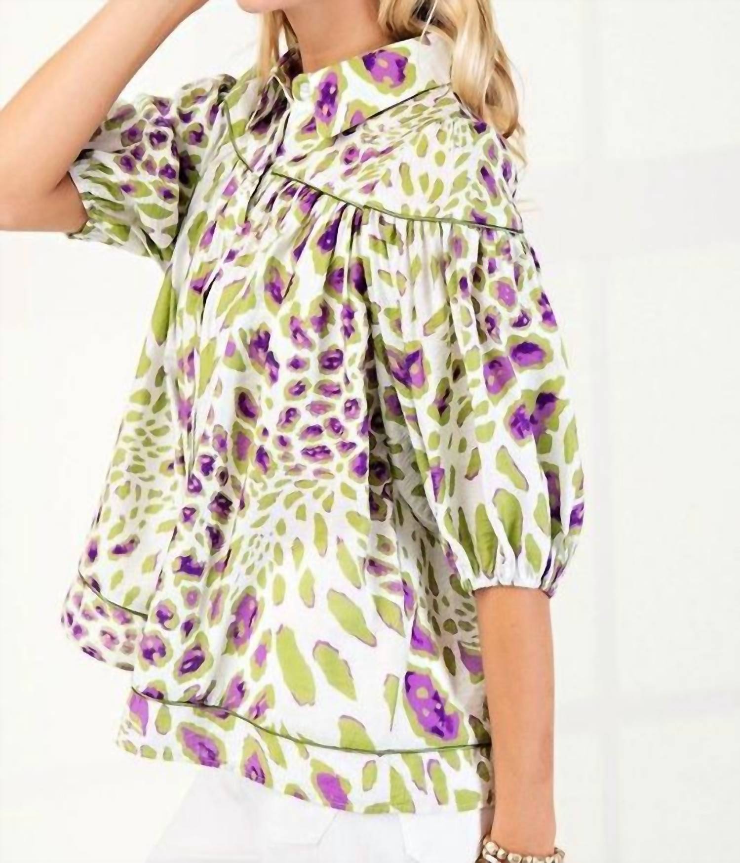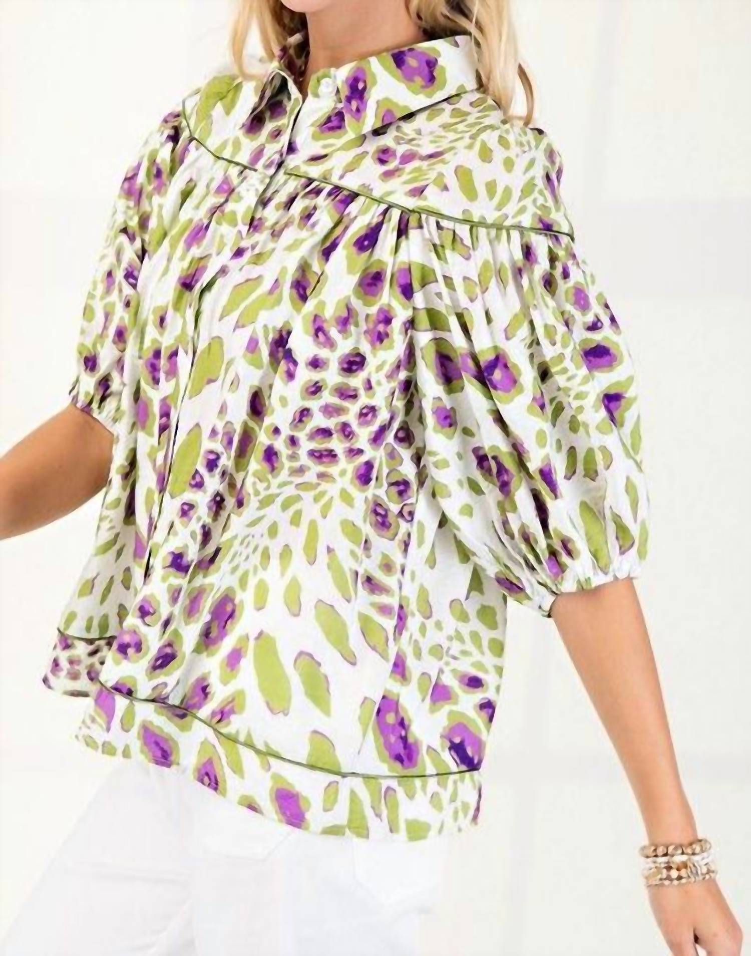 A versatile blouse that works from desk to dinner! Introducing the GiGiO Colorful Cowgirl Leopard Top, a vibrant blouse perfect for adding a pop of color to your wardrobe this Fall. Featuring elbow sleeves and crafted from 88% Rayon and 12% Polyester, this top boasts a unique blue and brown leopard pattern. Designed with a collar and button closure, it brings a playful yet sophisticated flair to any ensemble. Care is simple with machine wash instructions and laying flat to dry, ensuring your top stays vividly chic. Model is wearing a size small (5'9", Bust 32", Waist 24", Hips 28").