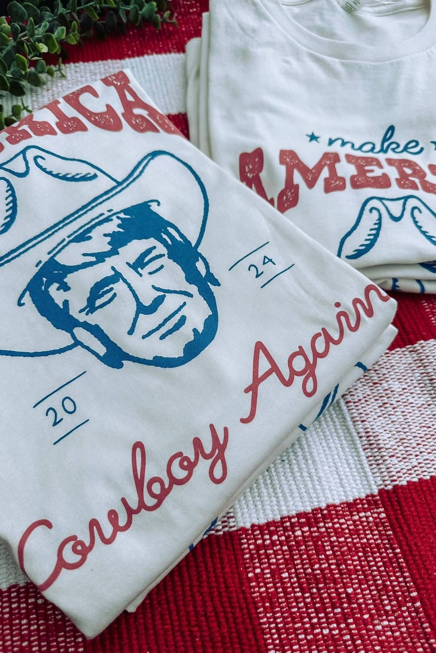 This classic, short sleeve tee will be your go-to staple this season and beyond. Introducing the Make America Cowboy Again Tee by Lure Boutique, an ideal summer staple with a Western trend flair. Crafted from soft cotton, this white graphic tee features a unisex cut with short sleeves and a classic crewneck design. Closure type: Pull on. Perfect for 4th of July celebrations or travel occasions, this tee offers stylish versatility for women.
