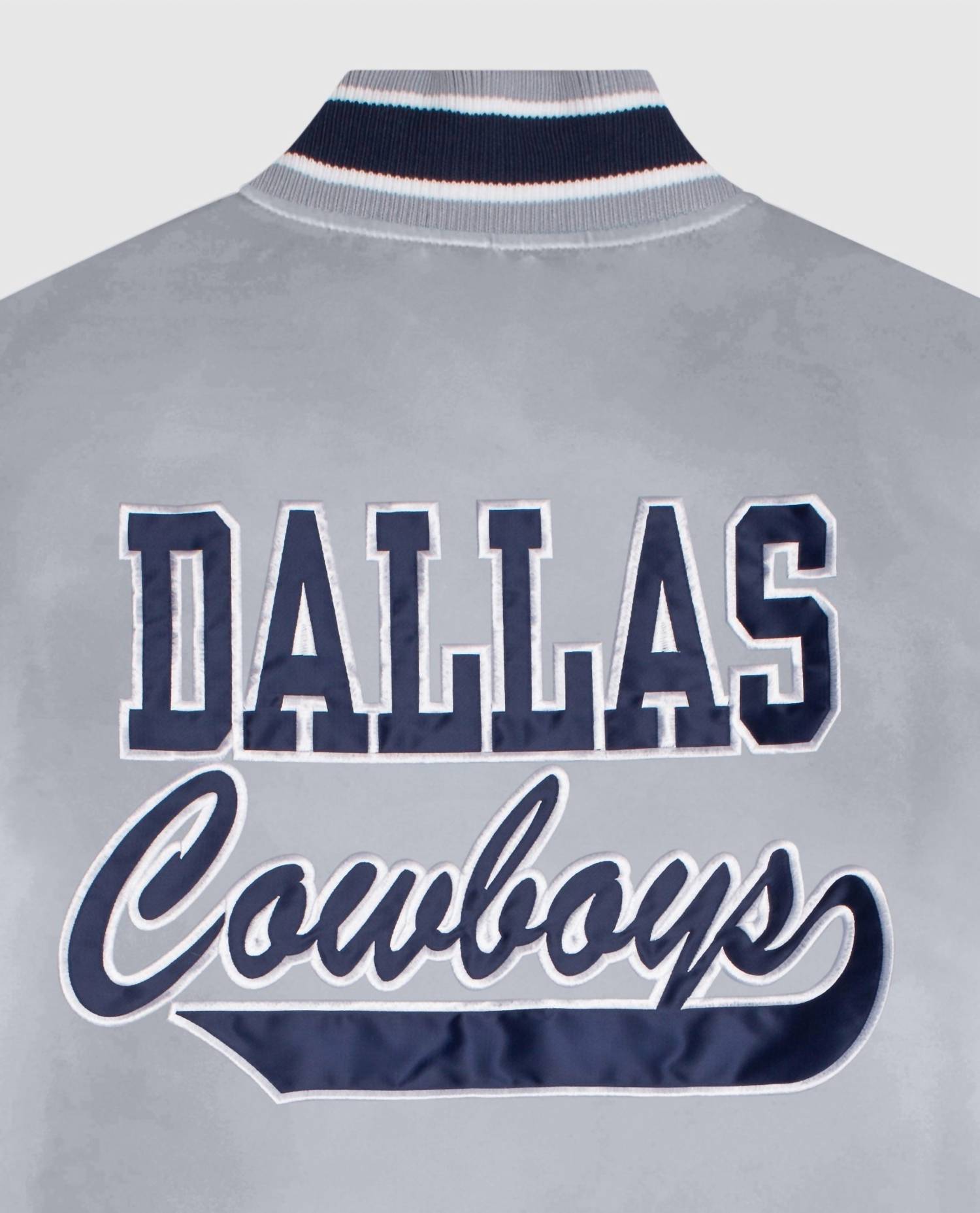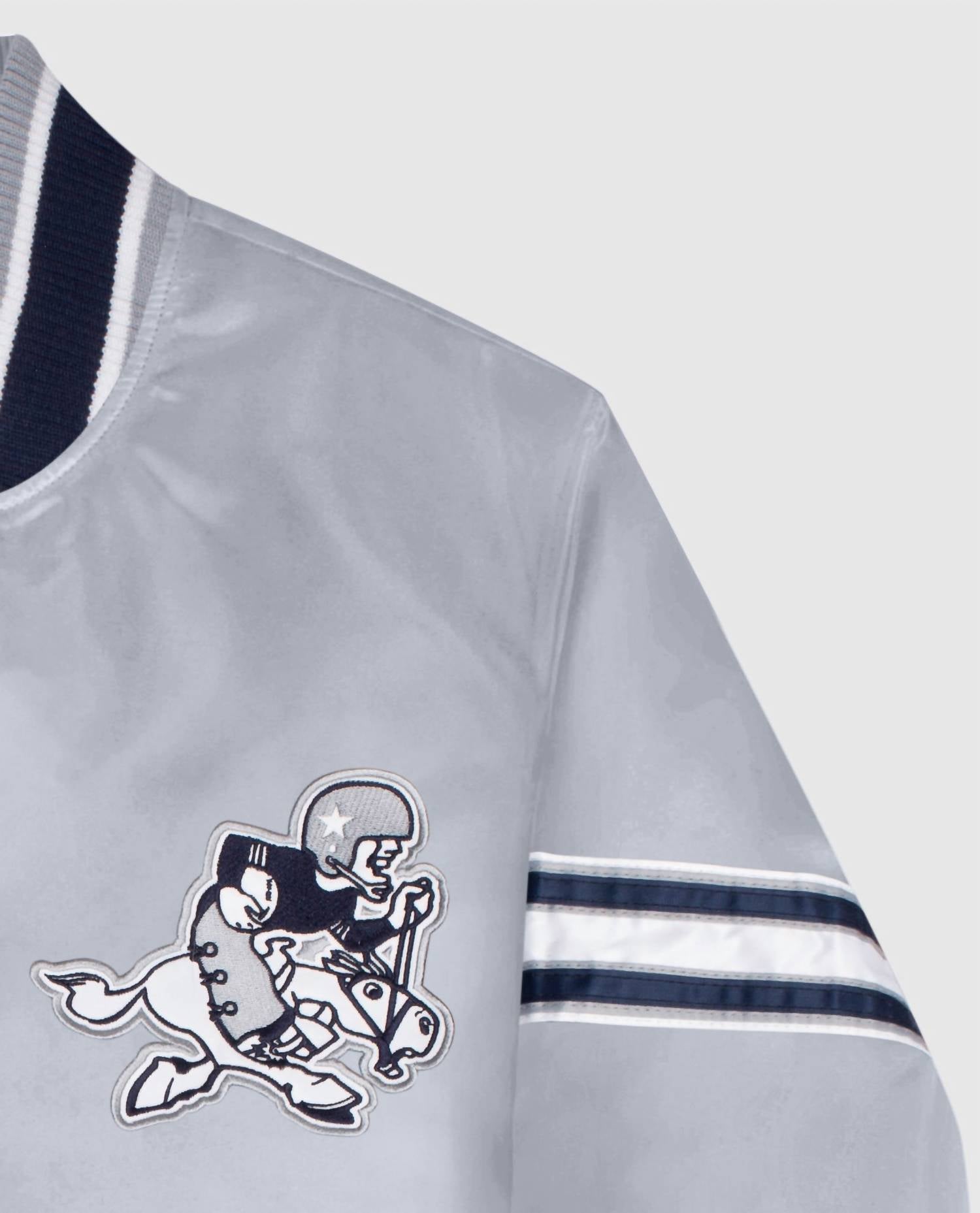 Elevate your game day look with the Men's Dallas Cowboys Satin Full-snap Jacket by Starter. This grey bomber features long sleeves with primary and secondary team color contrast stripes and a striped rib-knit collar, cuffs, and waistband for a bold athleisure vibe. Crafted from 100% polyester, it boasts a snap closure and front pockets, highlighted by retro team logo appliques on the left chest and back. Ideal for homecoming events, this jacket embodies team spirit and comfort.