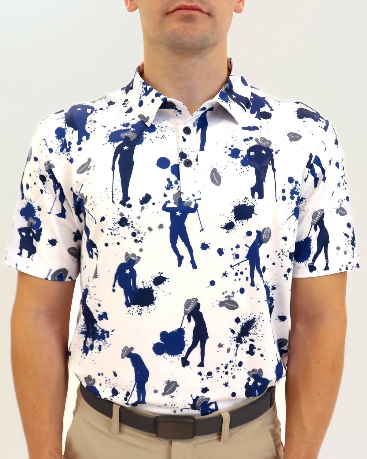 Celebrate your love for Dallas and golf with the Cowboy Up Golf Polo LIMITED EDITION by Yatta Golf. This men's patterned polo in classic white features short sleeves and a comfortable pull-on closure, ideal for activewear. Made with a 4-way stretch, wrinkle-resistant fabric composed of 95% polyester and 5% spandex, it promises supreme softness and moisture-wicking benefits. Care instructions include machine washing in cold water and tumble drying on low, ensuring easy maintenance of this unique piece.