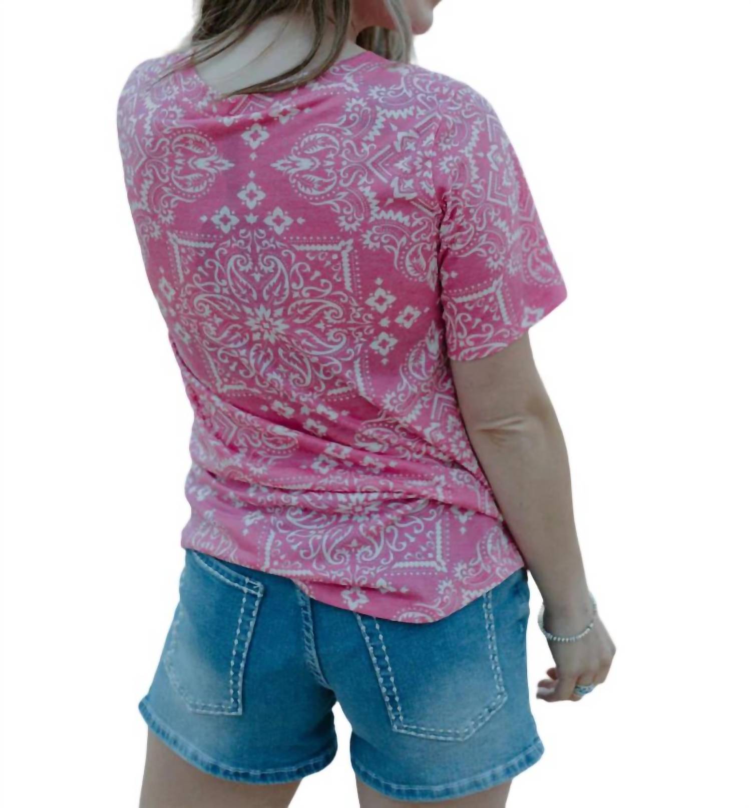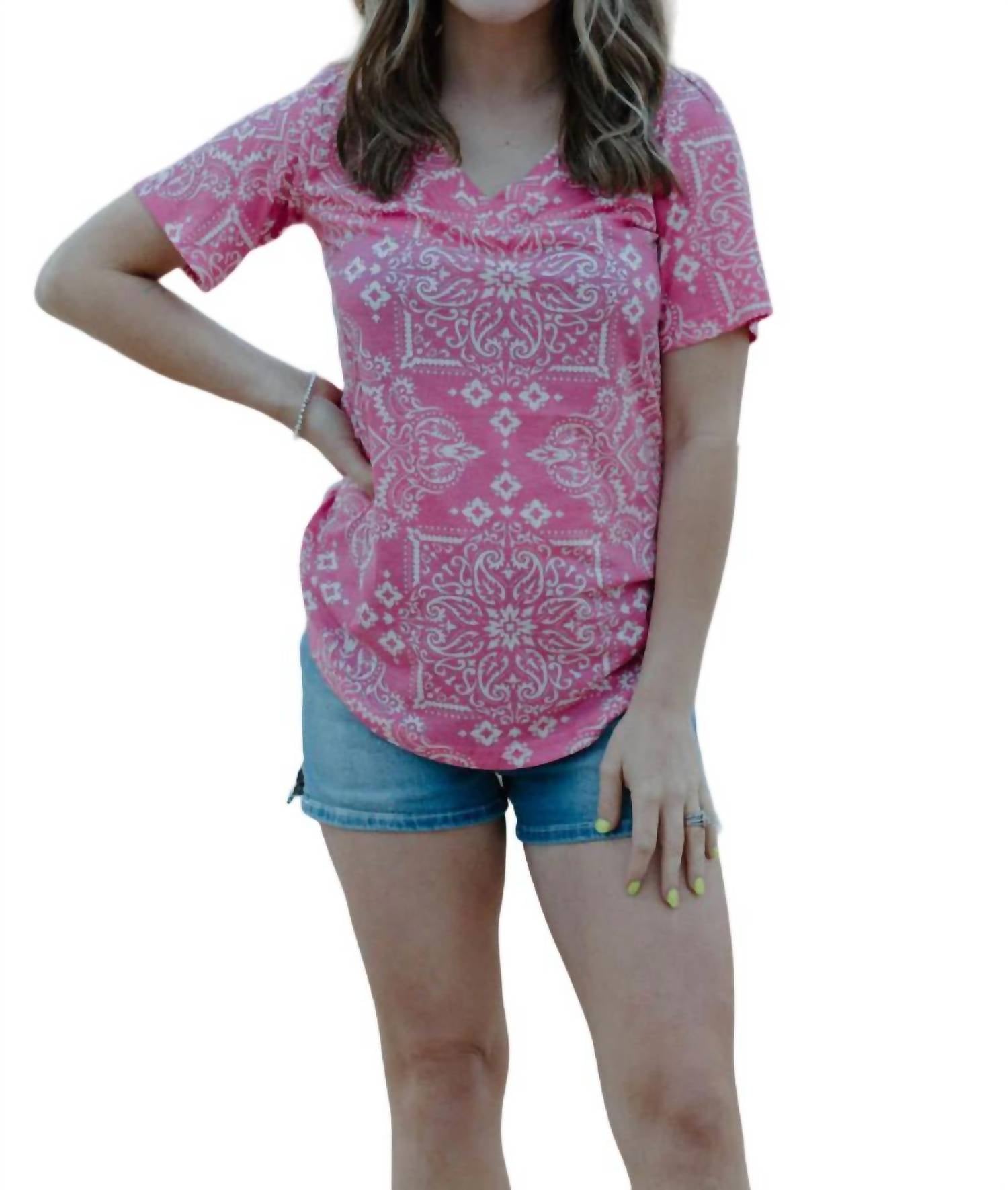 The short sleeve tee you'll want in every color. Featuring a pink V-neck with a bandana pattern, short sleeves, pullover construction. 55% Cotton, 40% Polyester and 5% Spandex. Runs big. For a more fitted look, size down.