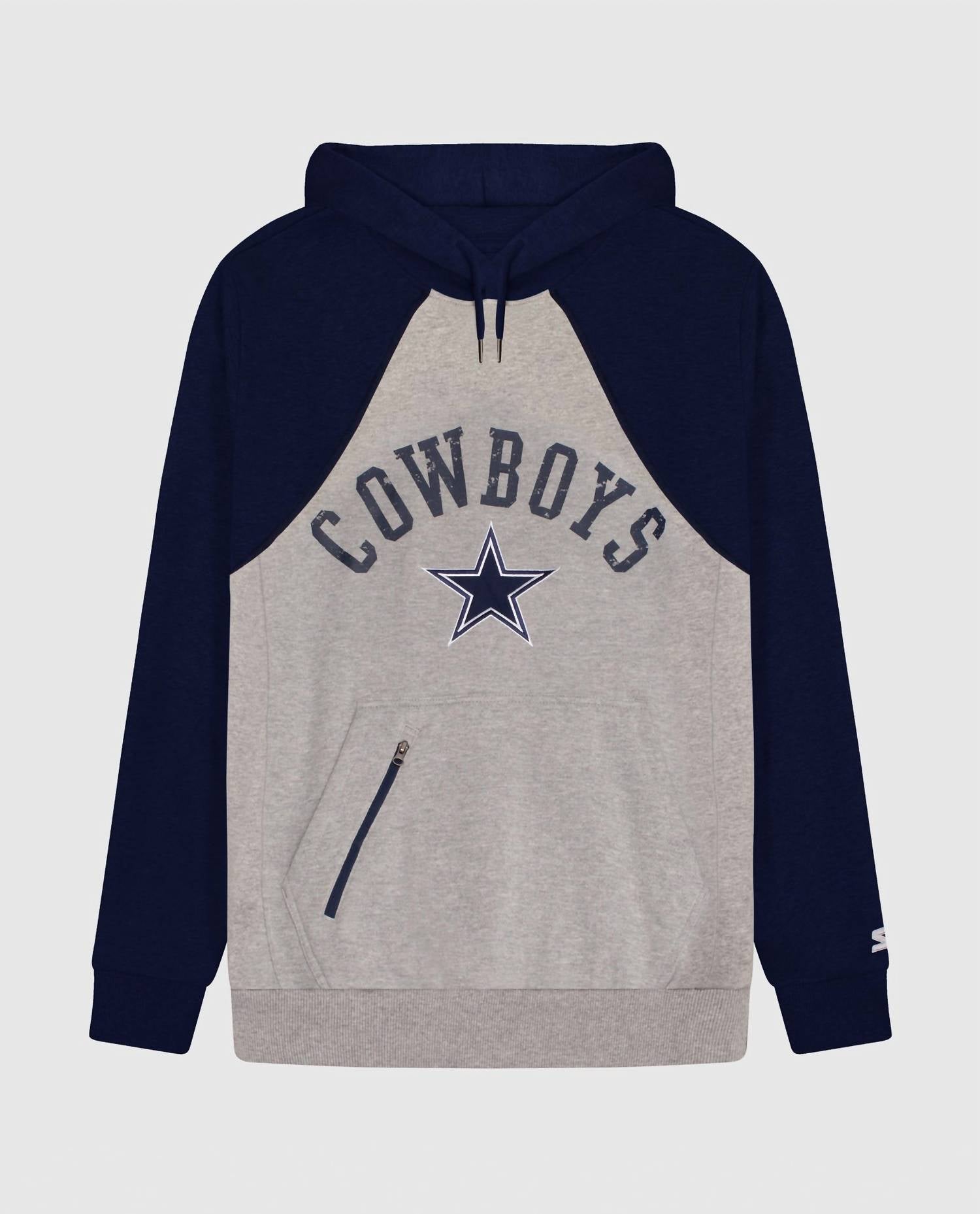 Cozy fabric, impeccable design - Meet the sweatshirt that you'll never want to take off. Elevate your game-day attire with the Dallas Cowboys Front Zip-pocket Hoodie by Starter, featuring a stylish blend of grey and team colors. This pullover hoodie comes with long sleeves and a hooded neckline, adorned with a printed team name and logo applique on the chest. It includes a practical kangaroo pocket with an additional zippered compartment for security. Closure: Pull on. Perfect for fans seeking both comfort and team spirit.