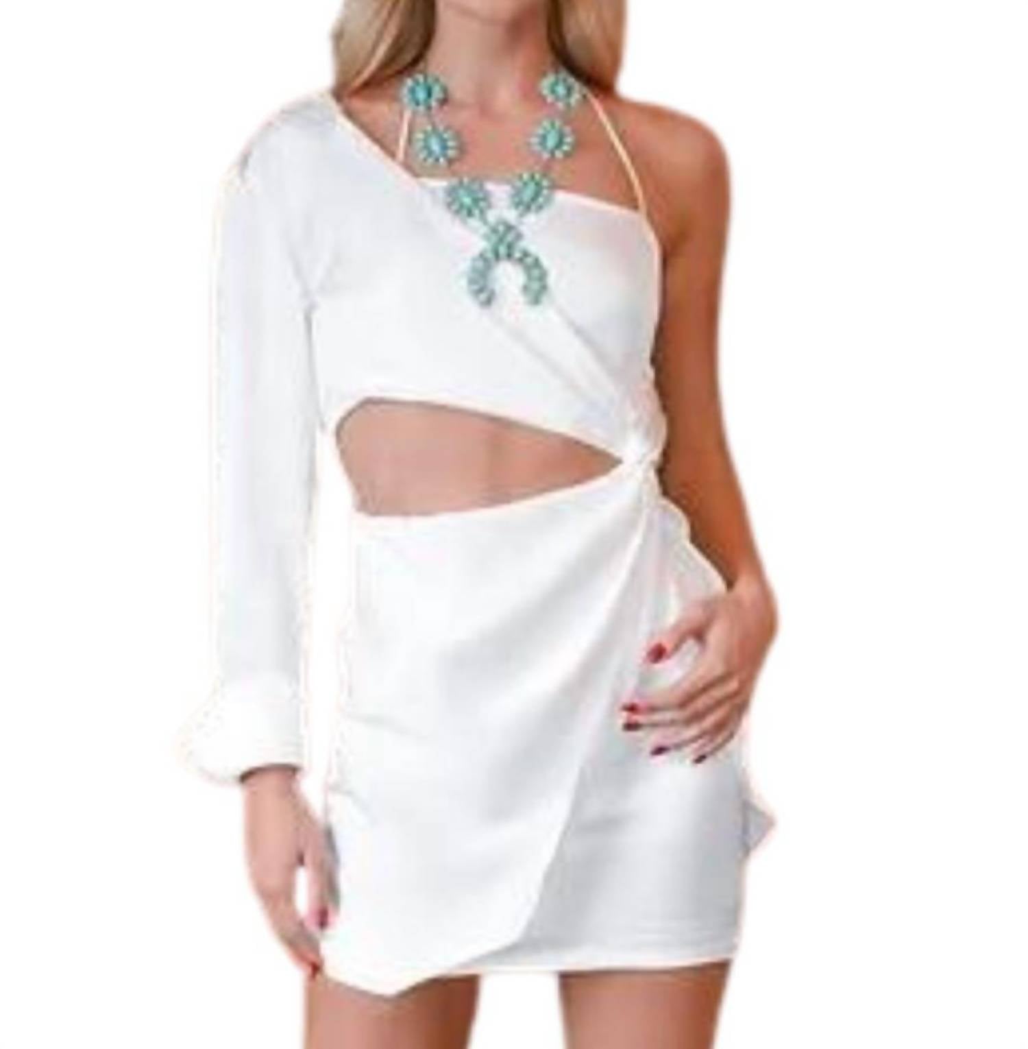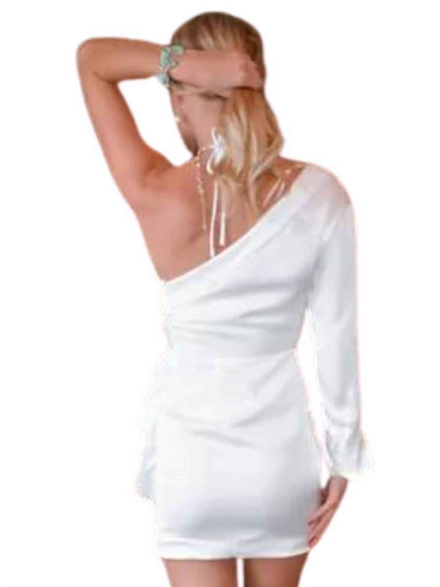 One sleeve asymmetry and waist cutout. Model is 5'11, 33" bust, 25" waist, 34" hips" wearing a size Small. True to size. Hand wash cold. 100% Polyester.