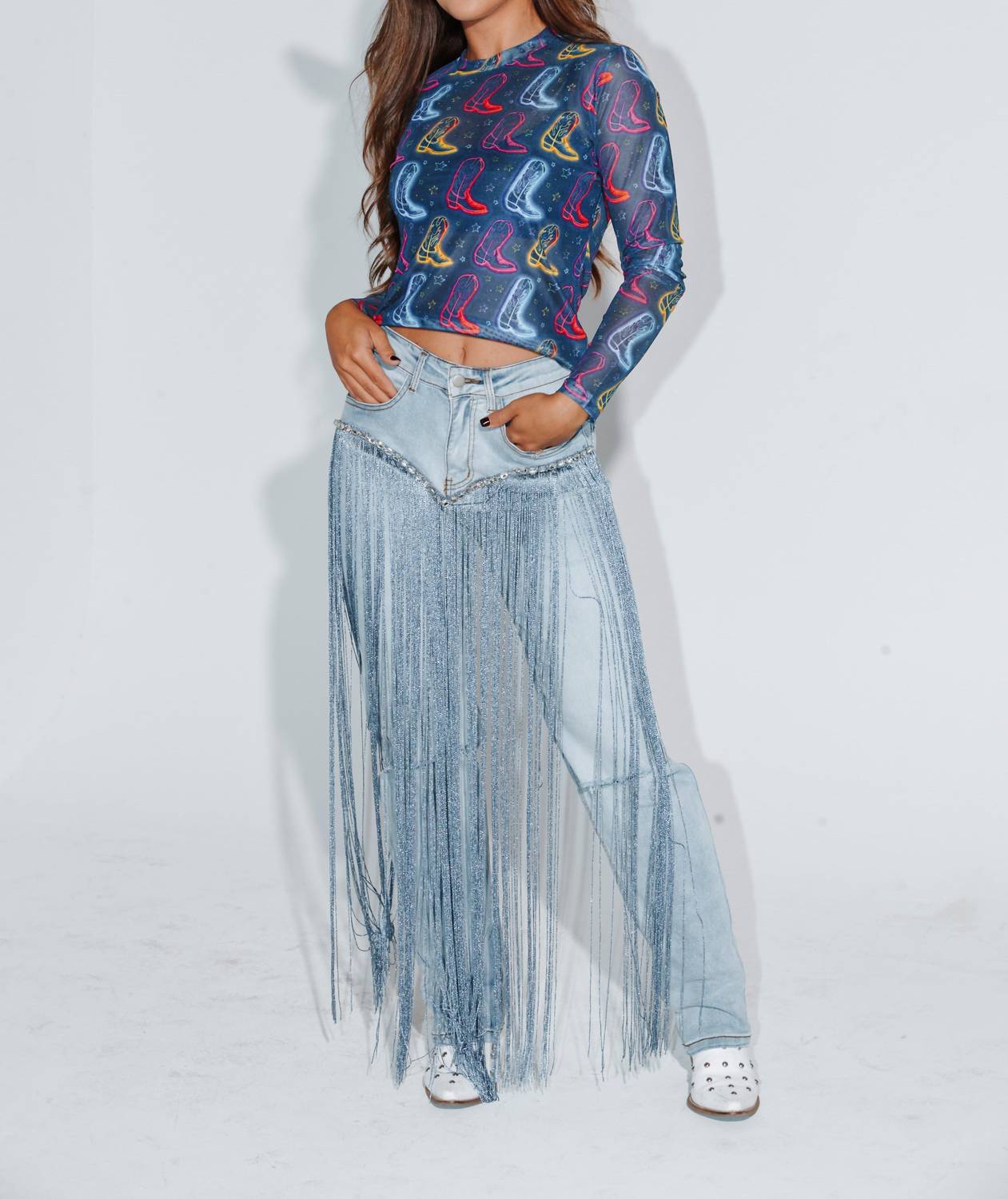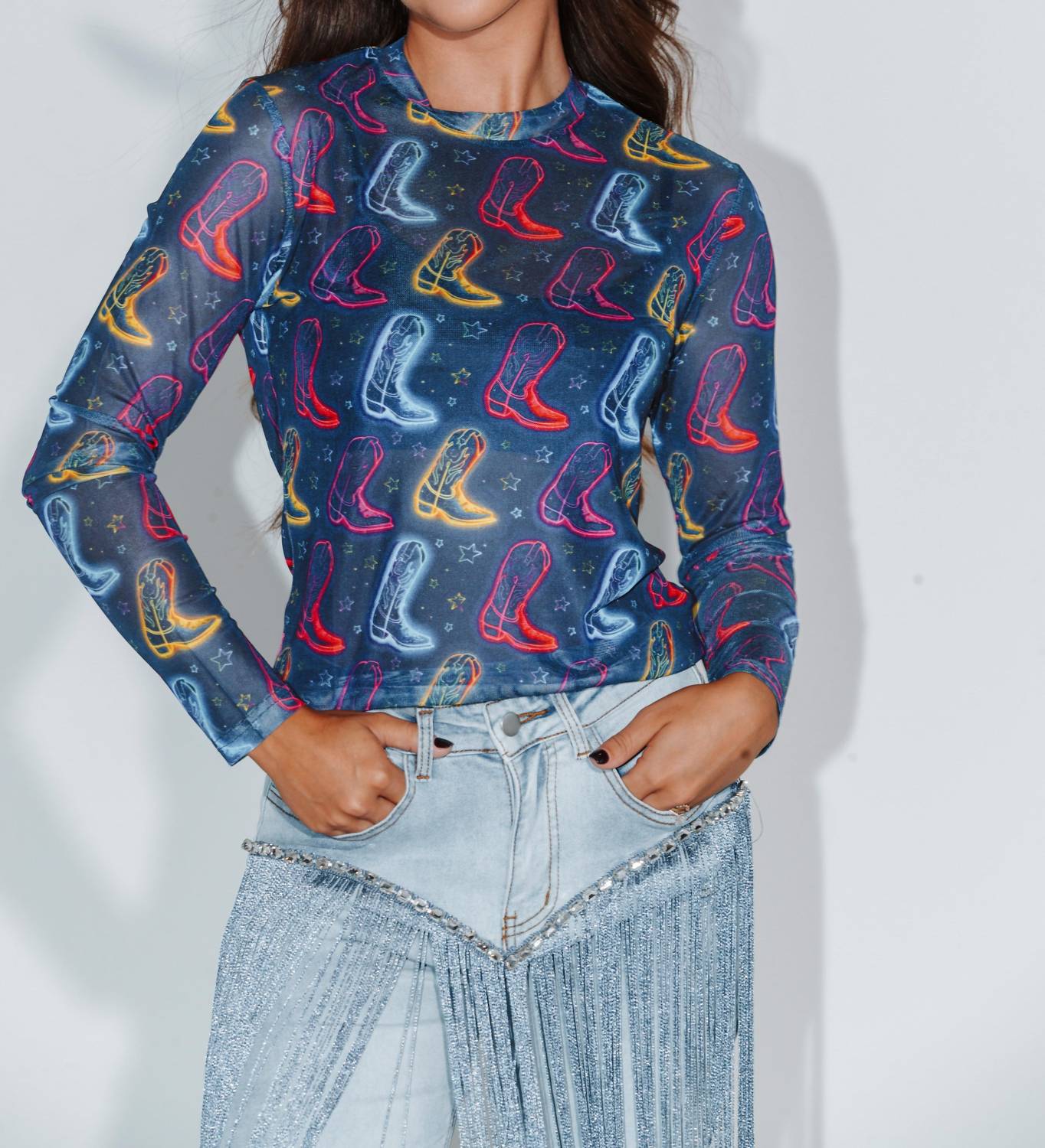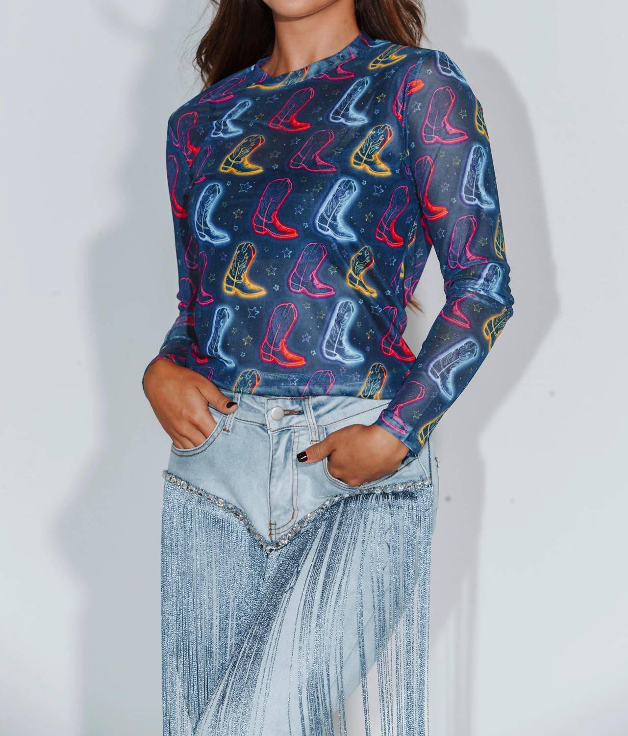 The perfect long sleeve tee that goes with just about anything. Embrace bold style with the Neon Cowboy Mesh Top by Howdy Hannah in navy. This long sleeve tee, crafted from lightweight breathable mesh, features a vibrant pattern of glowing cowboy boots. Its pull-on design and crewneck keep the look effortless, perfect for holiday parties or a night out. Care: Machine wash.