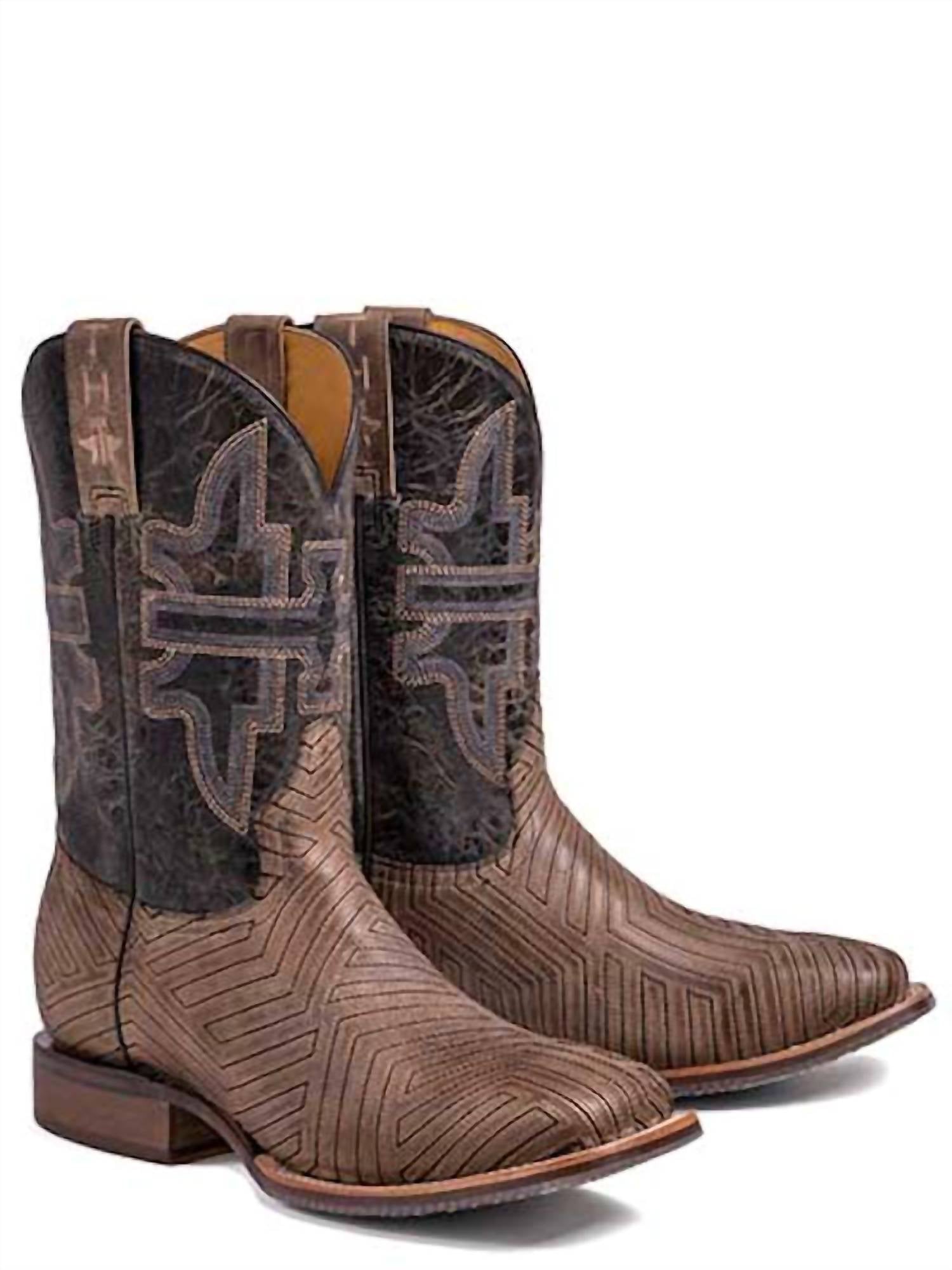 Step into style with the Men's Rowdy With American Rodeo Sole Boots by Tin Haul, crafted for those who love to showcase their American pride. With an 11" crackled black shaft and a square toe geometric stitched brown vamp, these handcrafted boots offer a perfect blend of fashion and functionality. Featuring a double welt and a walking heel, these boots are designed with all-leather lining for durability and a removable Obvious Comfort insole for all-day wear. Embrace the Western trend this summer, ideal for a dinner party or Cinco De Mayo celebration.