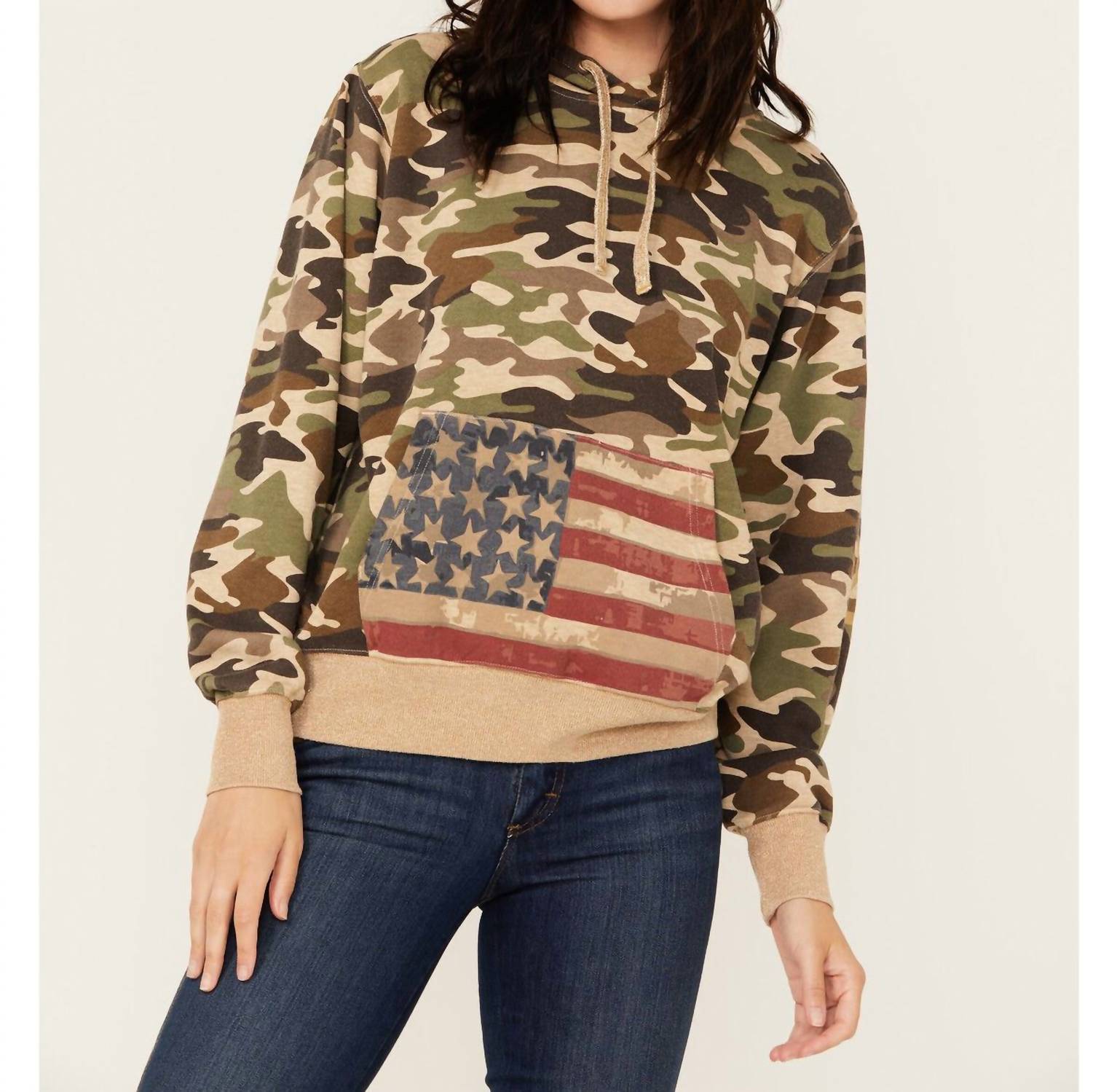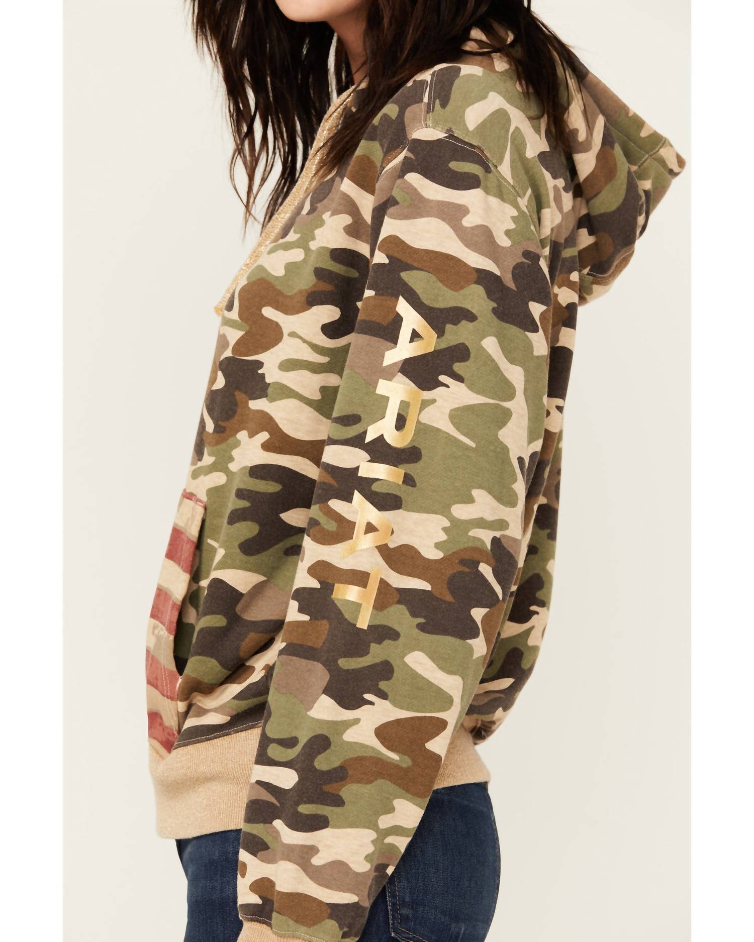 Whether you're running around town or lounging at home, this sweatshirt works for both. This hoodie features long sleeves and an attached hood with adjustable drawstrings, offering both style and comfort. It includes a convenient front kangaroo pocket adorned with a distinctive American flag design, complementing the camo print and the gold Ariat logo on the left arm. Closure: Pull-on style. 52% Cotton, 48% Polyester.