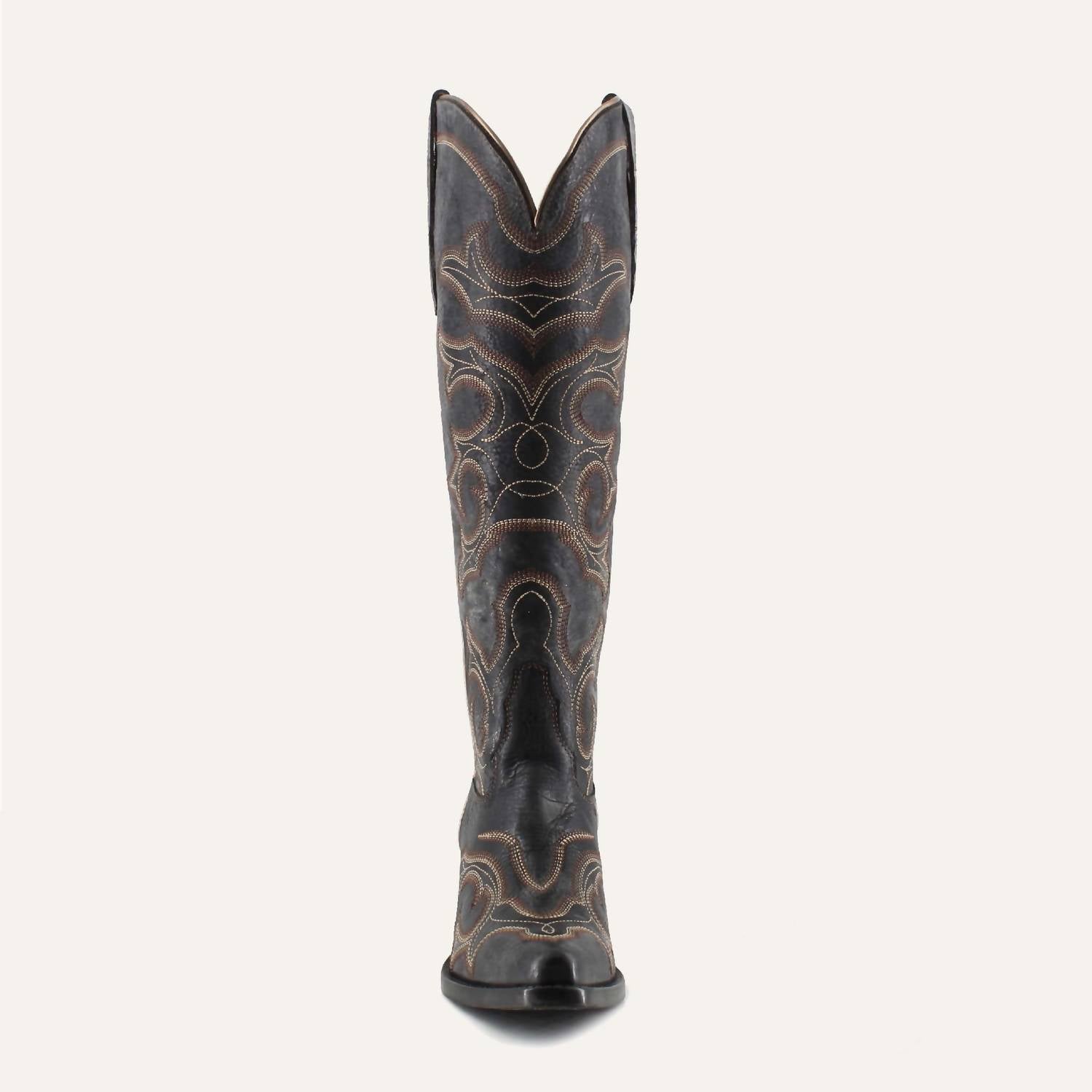 A stylish boot with a comfortable fit and the perfect amount of height. These classic boots are the perfect addition to any outfit and can be worn season after season. Step into sophistication with the Olivia Leather Cowgirl Boots by Buck & Brana, designed to elevate your western-inspired ensemble. This vintage-inspired tall boot in classic black showcases intricate western stitching and a weathered finish, perfectly paired with a pointed toe for a touch of elegance. Featuring a bold block heel, these boots are ideal for music festivals or any summer occasion where you want to make a statement. Crafted for adult women, they effortlessly blend traditional allure with modern style.
