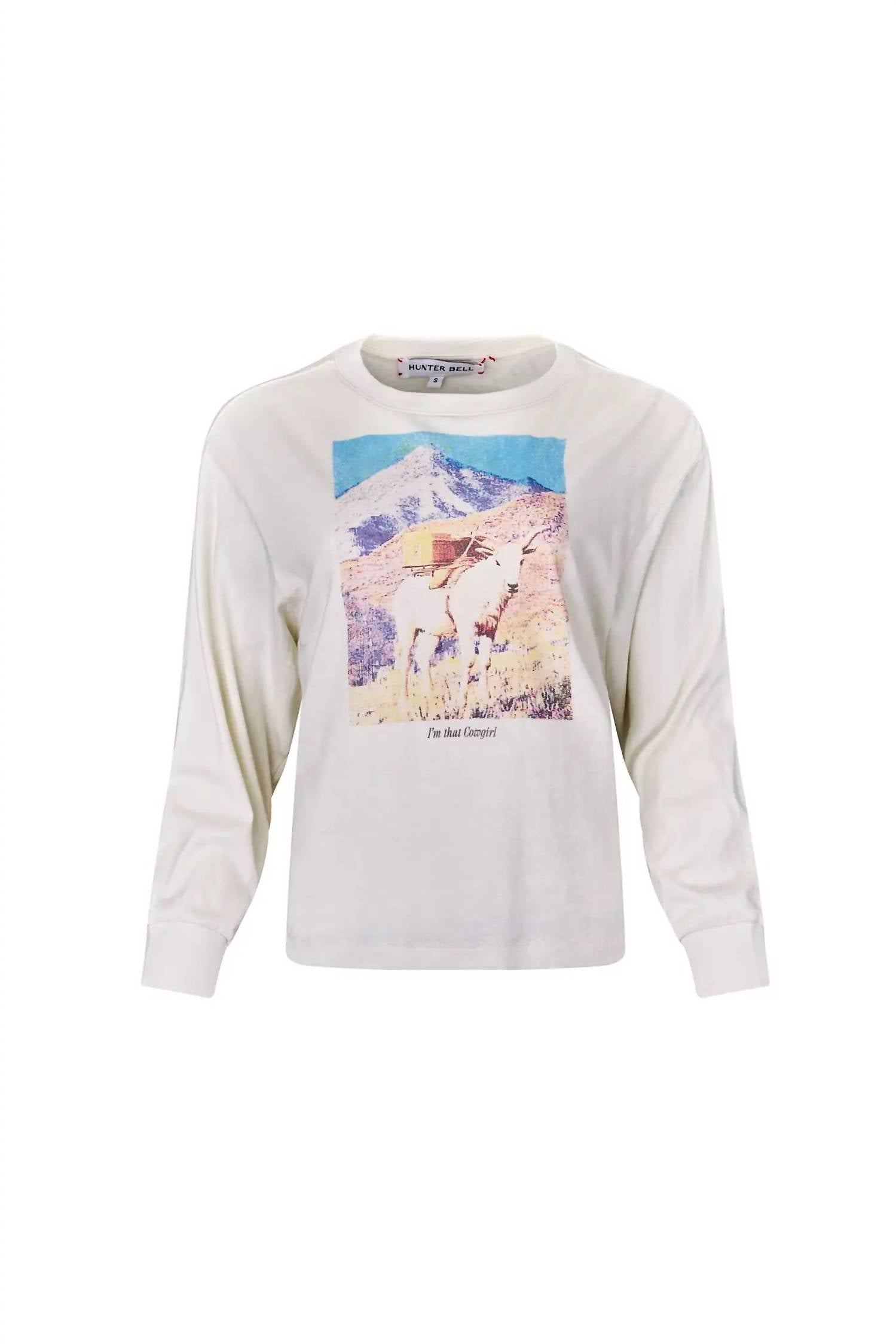 A long sleeve top you can wear with denim, skirts, well... just about anything! Introducing the I'm That Cowgirl Long Sleeve Tee by Hunter Bell, a playful addition to your wardrobe. Featuring long sleeves and a vintage-inspired crewneck, this tee is crafted from a soft cotton jersey for exceptional comfort and is 23 inches from the top of the shoulder. Its bold graphic print adds a fun twist to any casual look. Closure is a simple pull-on style, and for best care, machine wash cold and lay flat to dry.
