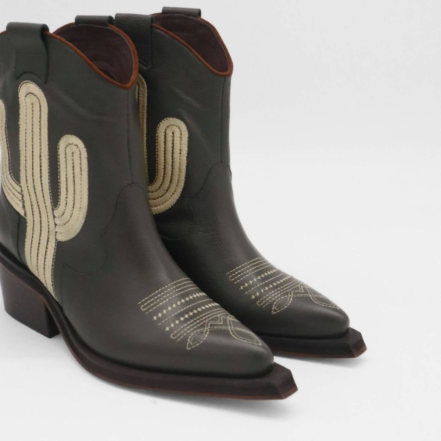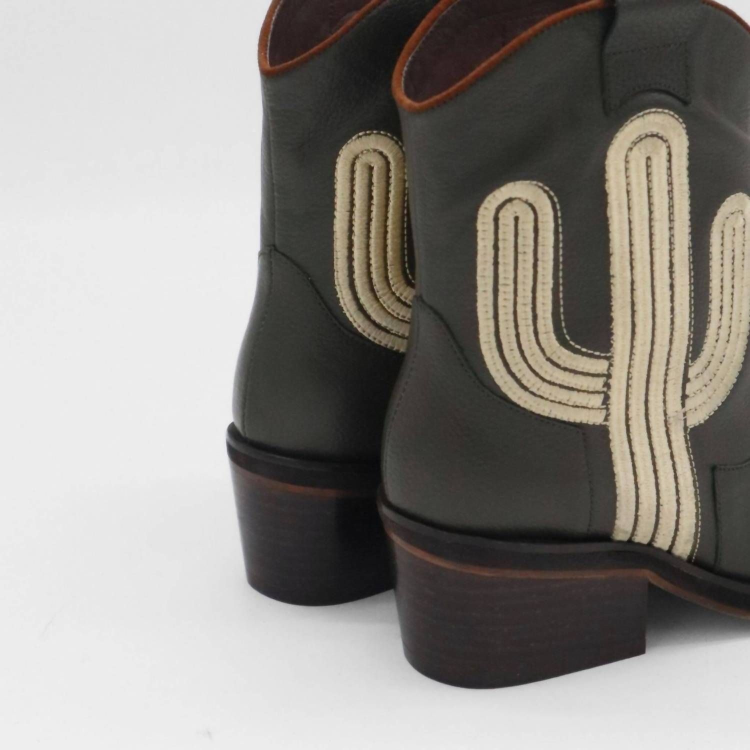Say hello to the perfect, most versatile boot. The ankle height makes this style easily transition from day to night. Wear them with your favorite skinny jeans and tee for a more laid back look, or pair them with your favorite mini dress and jacket for a night out on the town. Step into rugged elegance with the Women's Oasis Western Cowboy Booties in olive by Stivali New York. Ethically handmade in Colombia, these booties boast smooth leather construction and a unique cactus detail, complete with expert topstitching for a handcrafted touch. Featuring a Western pointed toe design and a comfortable block heel measuring 2.38" (6.05cm), they offer a bold desert-inspired flair. These ankle boots are designed for medium width, perfect for fall vacations, and support artisan families, enhancing their quality of life.
