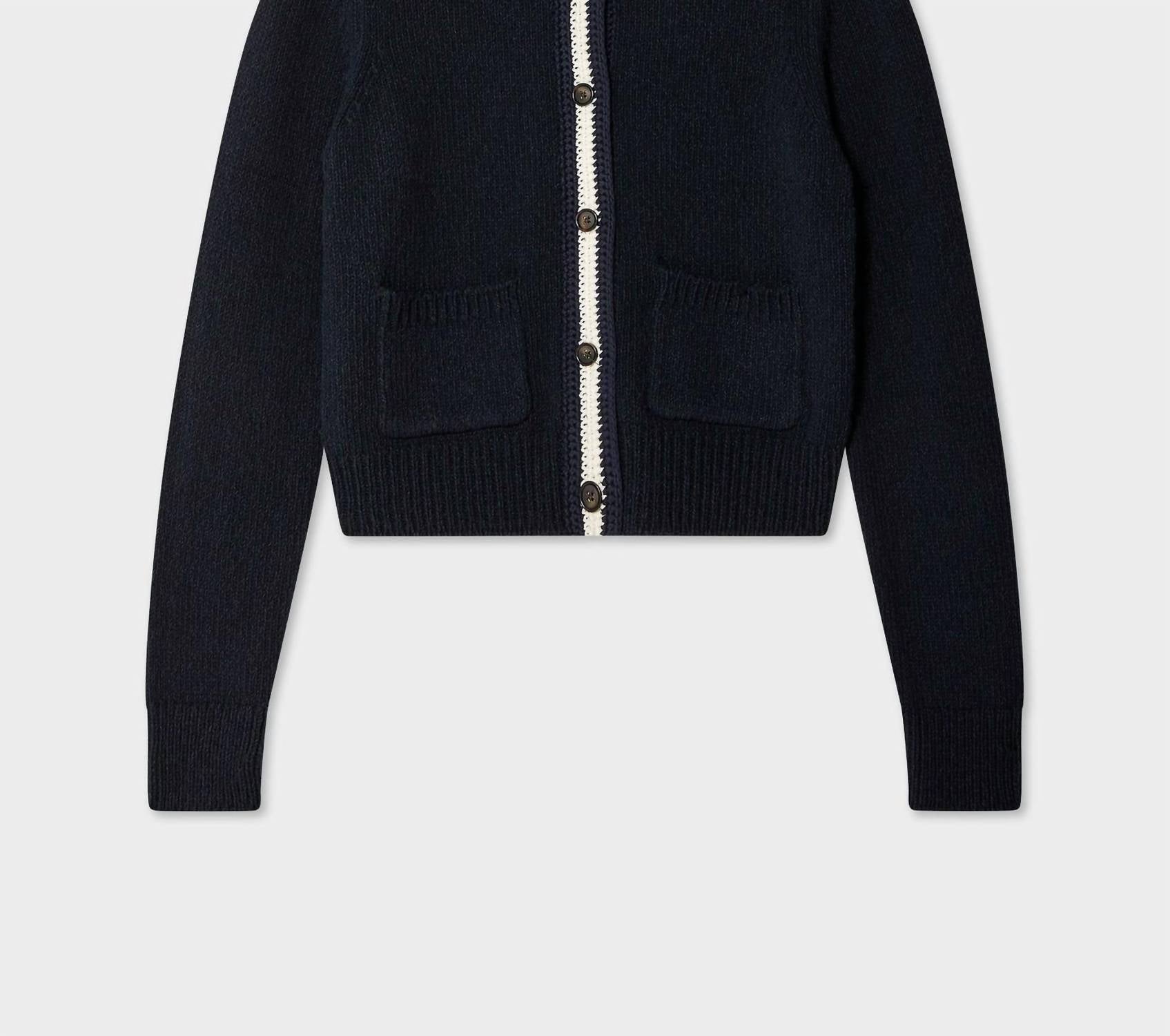 Wrap yourself in the Lofty Cotton Crochet Trim Cardigan by White + Warren, a perfect blend of comfort and style in Ivory/Navy Teal. This cardigan features long sleeves and a straight fit with a hip-grazing length of 19" for easy layering. Crafted from 79% Cotton, 18% Polyamide, and 3% Elastane, it offers a textured look with a touch of stretch, complete with button closure. Care instructions include dry clean only; model is 5'10" wearing a size small, embracing minimalist fashion for the fall season.