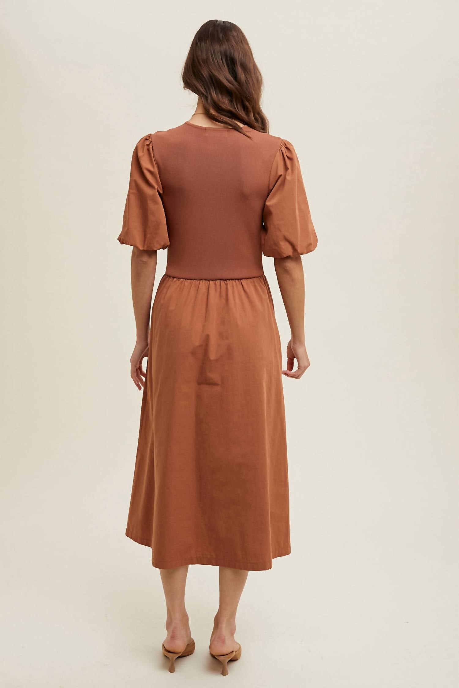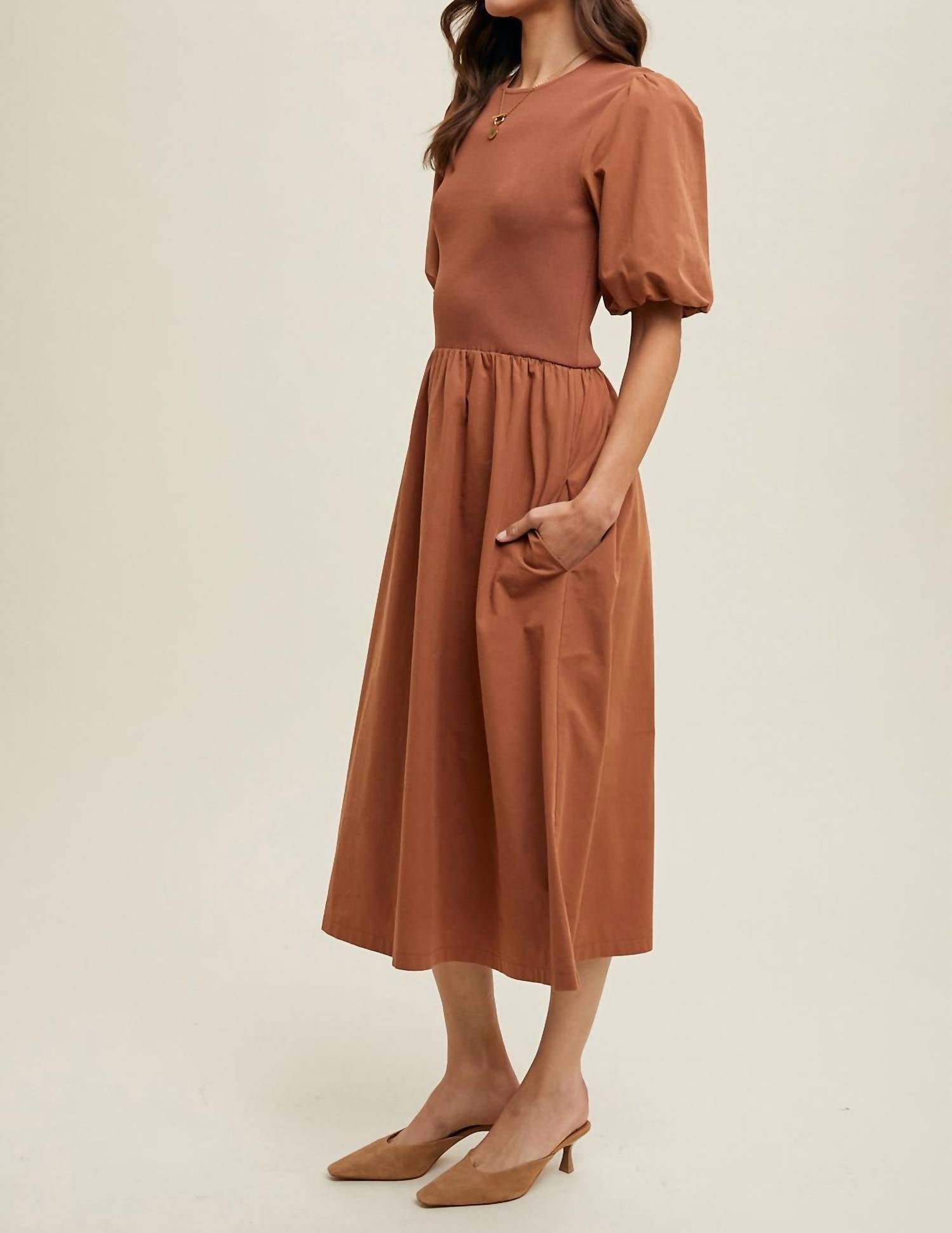 Just add slides or mules and you are good to go. Elevate your fall wardrobe with the Kiara Midi Dress by WISHLIST, featuring elegant elbow balloon sleeves for a sophisticated touch. Crafted from a blend of 100% cotton, 65% rayon, 35% nylon, and fully lined with 100% polyester, this monochrome dress offers a stunning A-line silhouette. The midi-length design, with dimensions of 48.5" to 49.5" depending on size, ensures a flattering fit, while the convenient side pockets add practicality. The dress has a pull-on closure and should be hand washed for best care.
