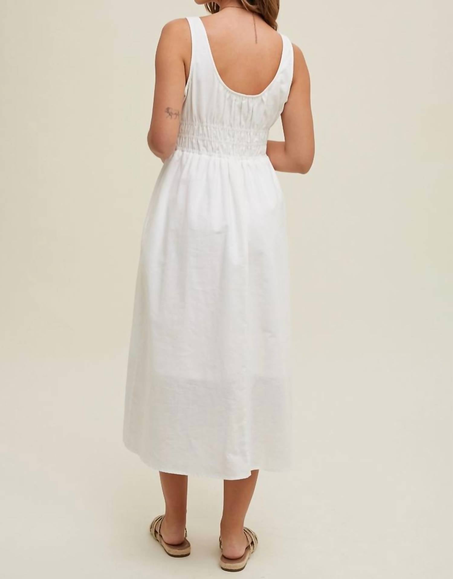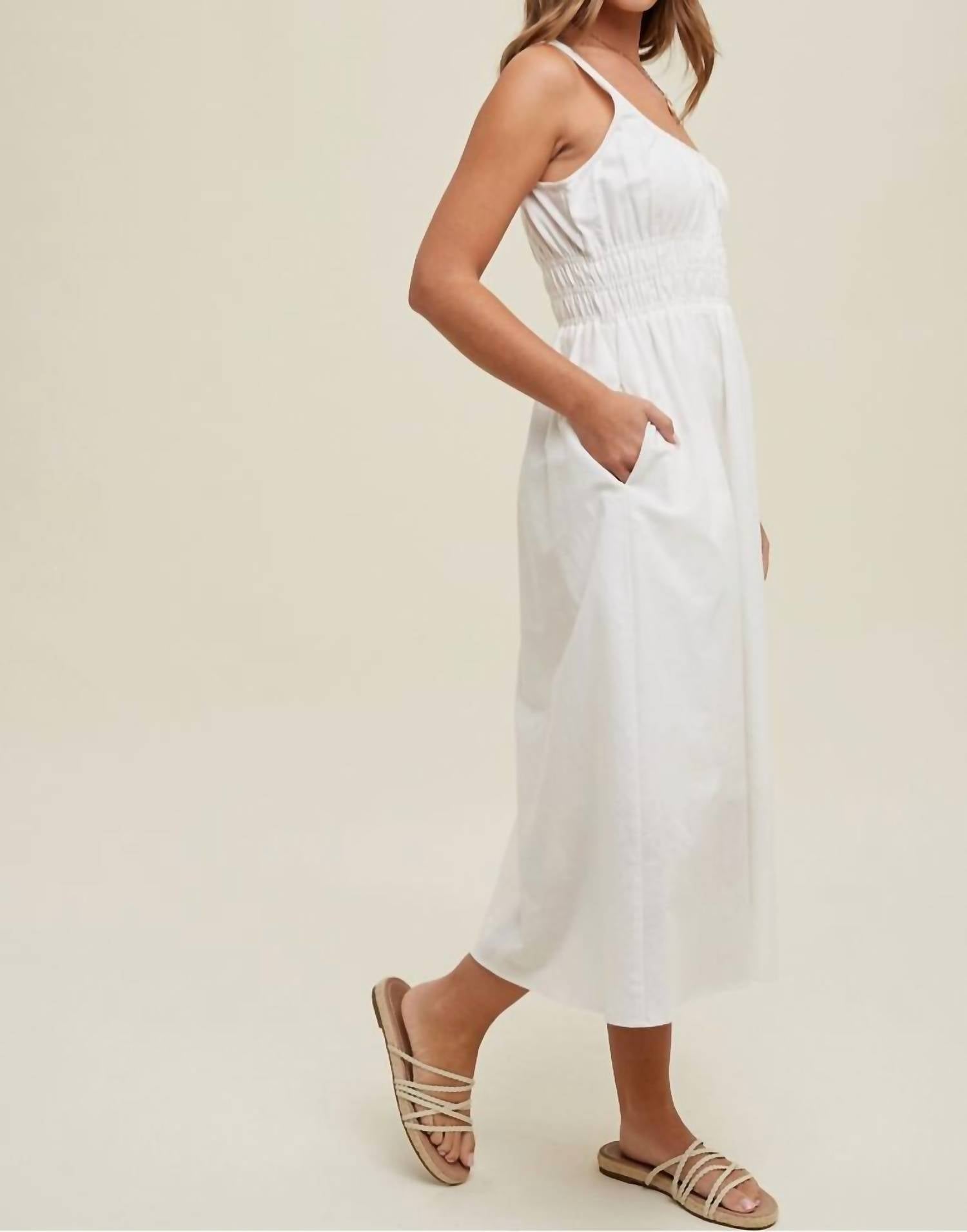 A midi dress so versatile, your options for wearing it are endless. The Linen With Smocked Waist Detail Midi Dress by WISHLIST is your ideal choice for a holiday party or a minimalist Thanksgiving gathering. This women's A-line dress in a solid ivory shade flaunts a sleeveless design and a flattering squareneck, exuding summer charm. Crafted from a linen blend with a smocked waist detail, the dress features side pockets and is lined with 100% polyester for added comfort. Designed for ease, it has a pull-on closure, making it both stylish and convenient.