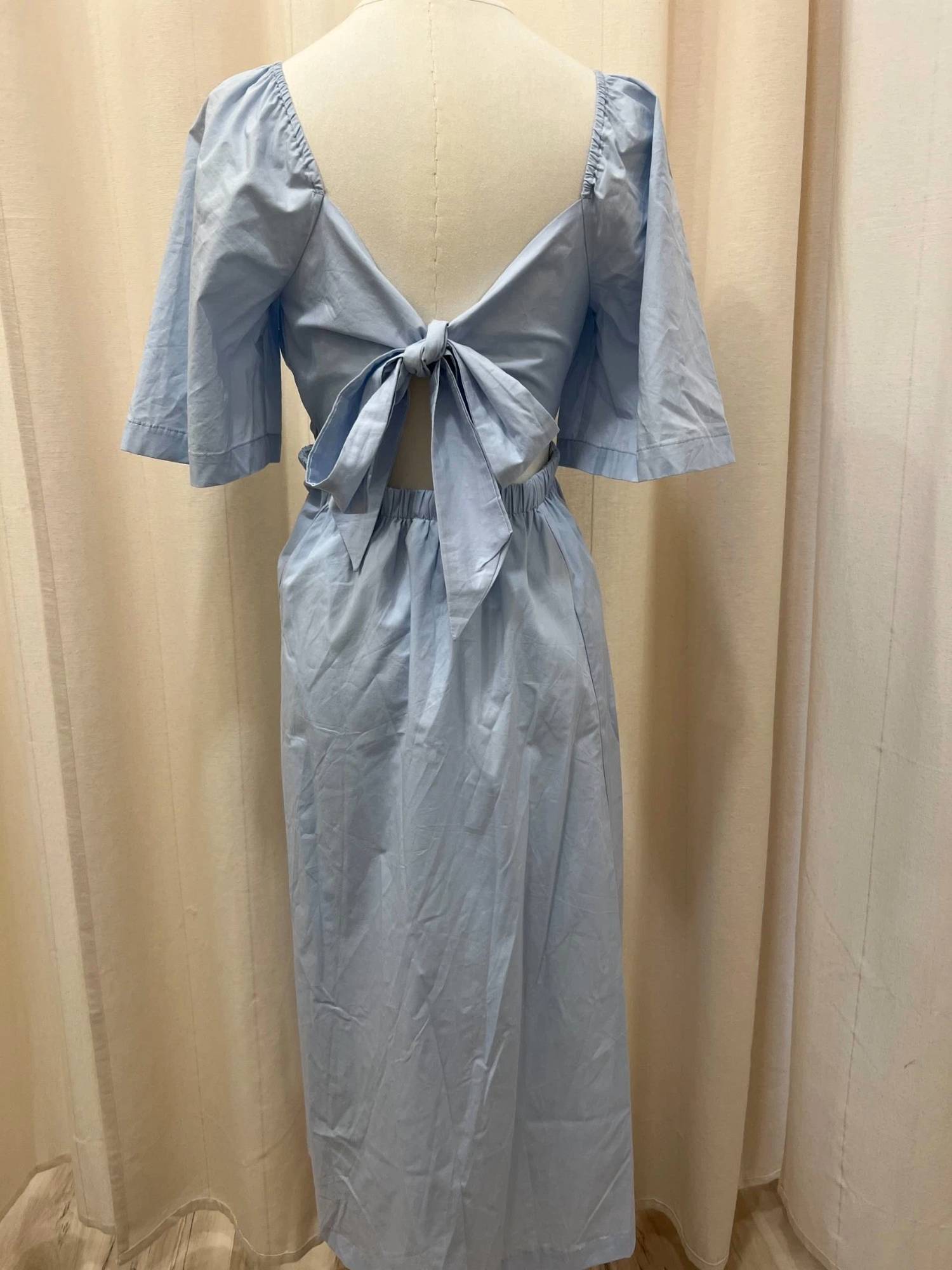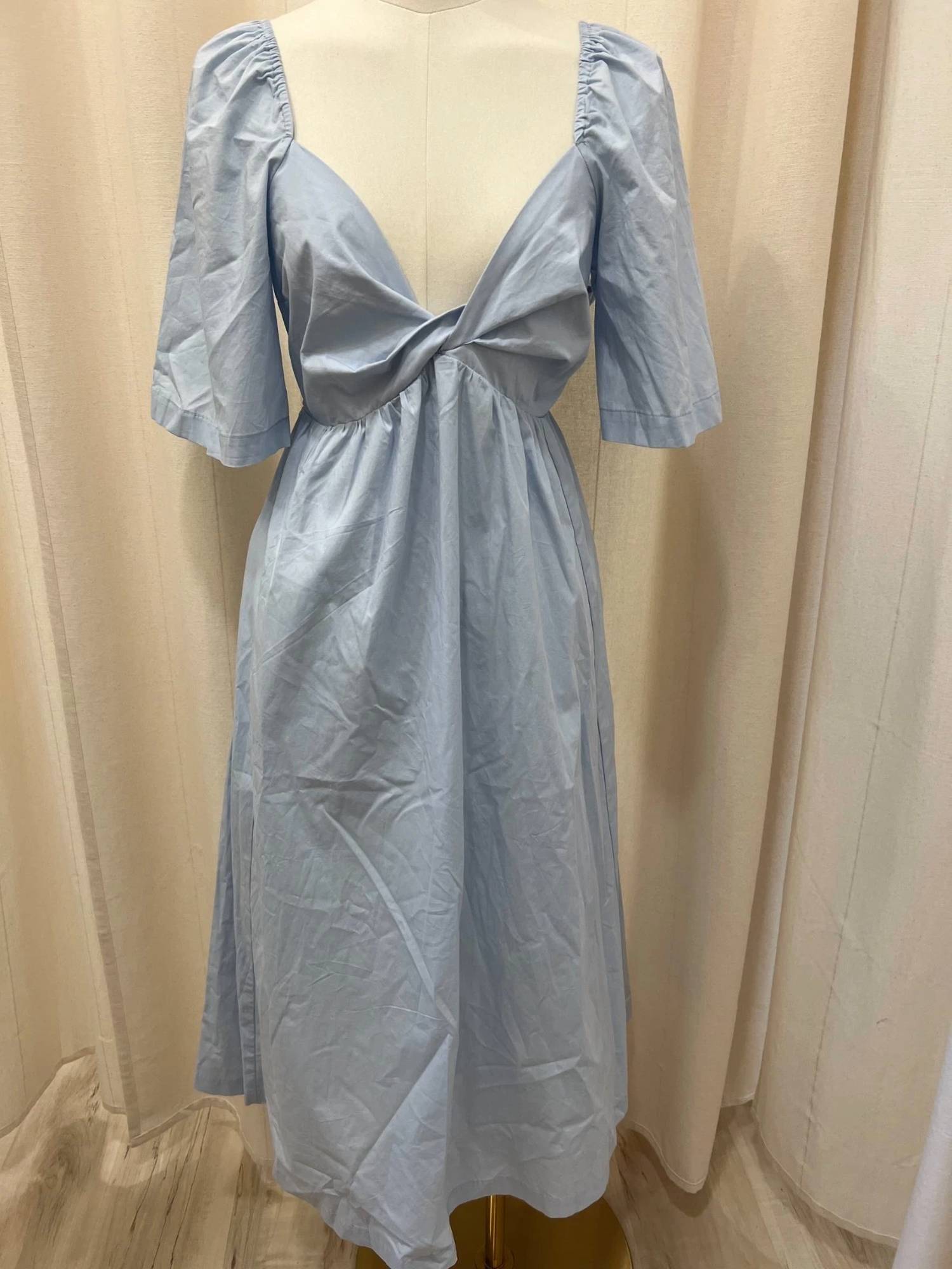 The perfect length dress does exist. Introducing the Women's Midi Dress With Front Twist by WISHLIST, an effortlessly chic choice for a summer vacation. Designed in a versatile light blue solid color, this A-line silhouette features short sleeves and a trendy sweetheart neckline. The dress's unique front twist adds an eye-catching detail, complemented by an open back with a tie closure. Perfect for minimalist lovers, this piece boasts a comfortable and stylish fit with a summery vibe.