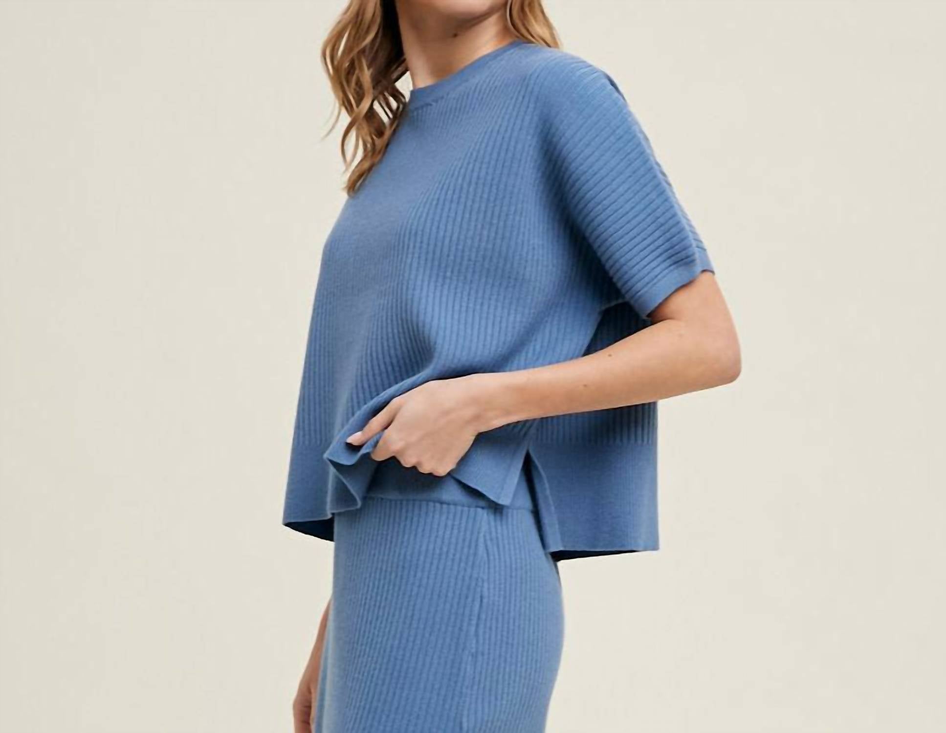 Look no further, you just found your perfect tee! Discover the Vienna Knit Top by WISHLIST, a ribbed knit sweater in Denim Blue perfect for summery days. With short sleeves and a boxy fit, this top features a round neckline and side slits for a modern touch. Crafted from a blend of 50% Viscose, 28% Polyester, and 22% Nylon, it ensures style and comfort. Closure: Pull-on. Care: Hand wash. Available dimensions: Bust - Small 48", Medium 50", Large 52"; Length - Small 19.5", Medium 20", Large 20.5".