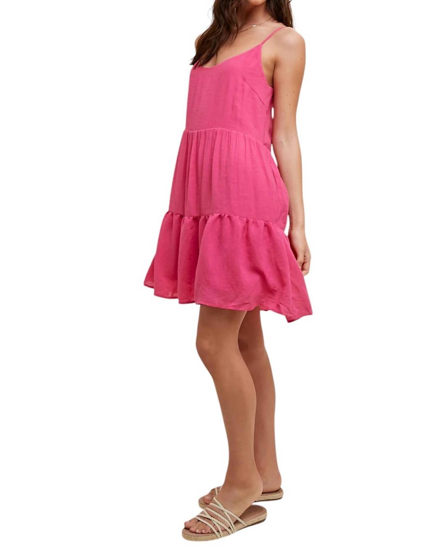 Mini dress with adjustable straps and a feminine tie detail in the back. Features a tiered bottom and side pocket. Made of 65% Rayon and 35% Polyester.