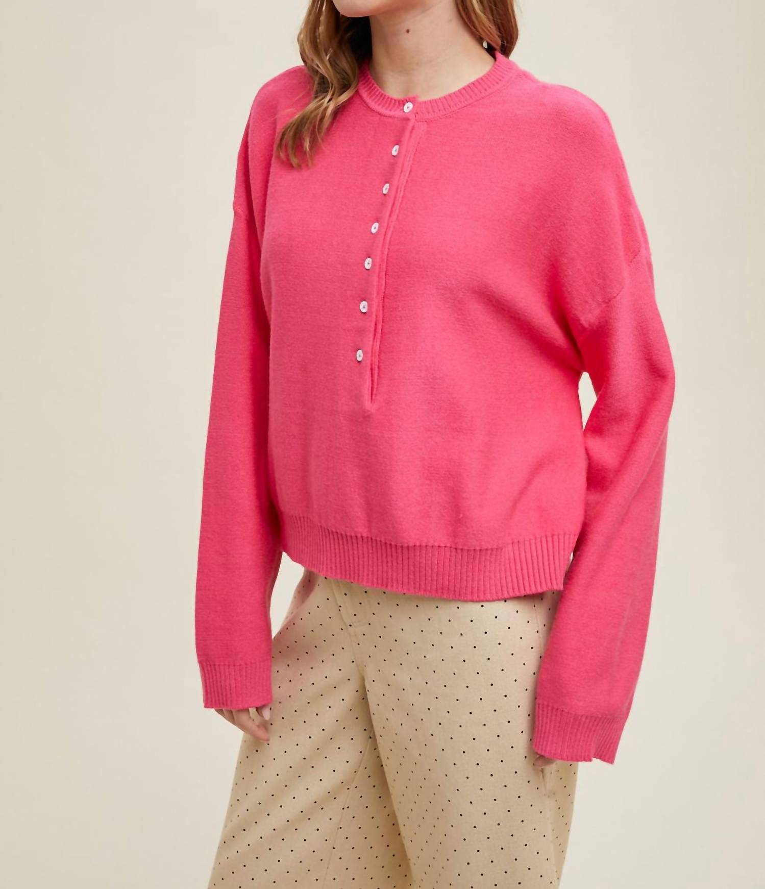 The ultimate go-to sweater, expertly crafted to provide the perfect combination of warmth and style. Its classic design and soft fabric make it a must-have addition to your wardrobe. Elevate your winter wardrobe with the Rhea Pullover Sweater by WISHLIST, a vibrant magenta Henley-style pullover crafted for both style and comfort. Featuring long sleeves and a boxy fit, this piece includes ribbing detail on the hem for added texture. The sweater is made from a cozy blend of 50% Viscose, 28% Polyester, and 22% Nylon, with a button closure adding versatility. Easy to maintain, simply hand wash to keep it fresh. Available in bust sizes 44" (S), 46" (M), and 48" (L), with lengths of 22" (S), 22.5" (M), and 23" (L).