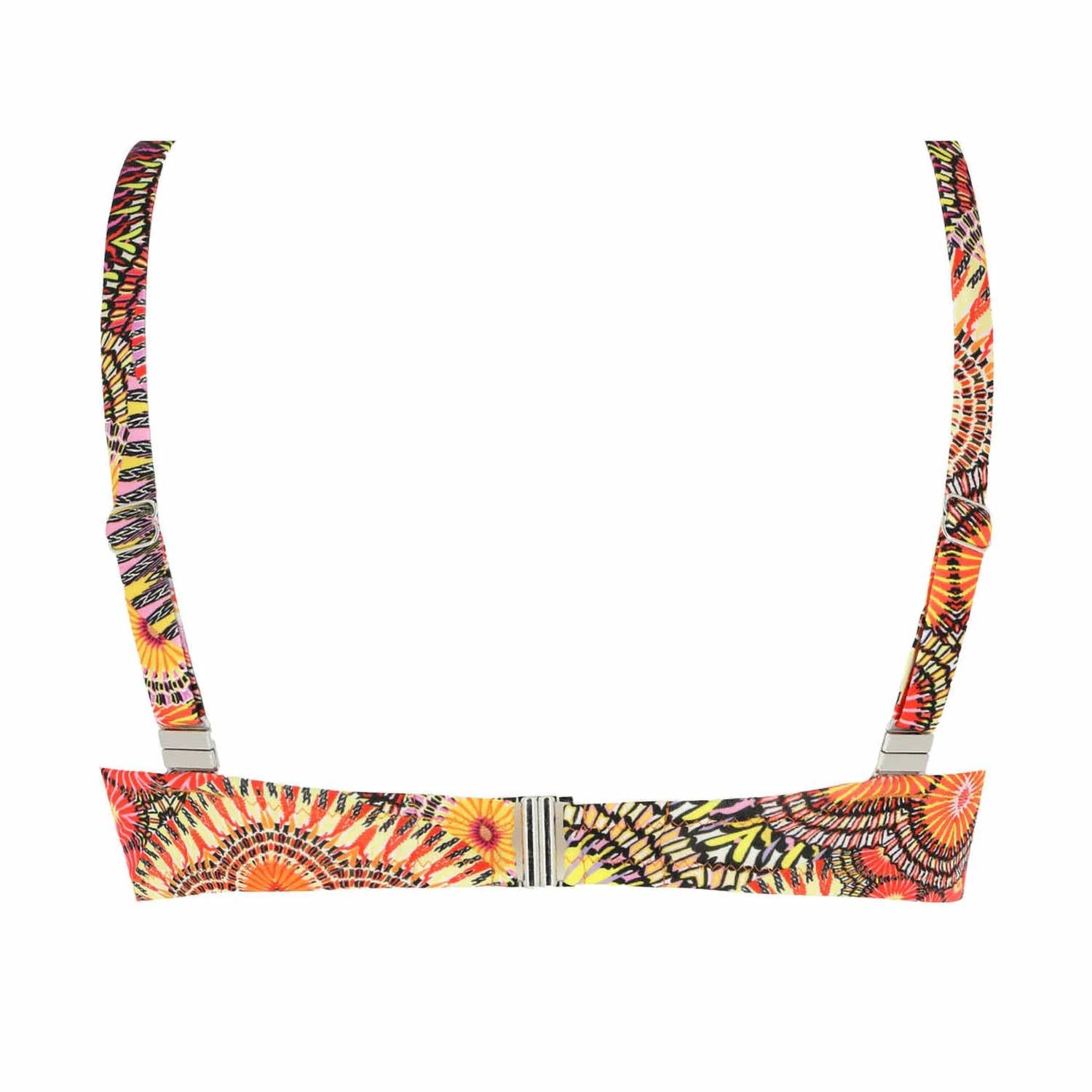 Dream of your next beach getaway in this cute little number. Pair with strappy sandals, a floppy hat, and an oversized tote to complete the perfect vacation look. Elevate your swimwear collection with the Shell Bikini Top by Lise Charmel, featuring a vibrant batik-inspired print in predominantly orange tones with accents of yellow, fuchsia, and red. This women's bralette swim top, crafted from 46% polyamide, 27% polyurethane, 16% polyester, and 11% elastane, ensures a harmonious curve with integrated shell cups and light padding. Designed with adjustable, wide straps for support, it offers a chic closure with a silver buckle at the back. Care for this patterned bikini by hand washing it to maintain its hippie-chic charm.