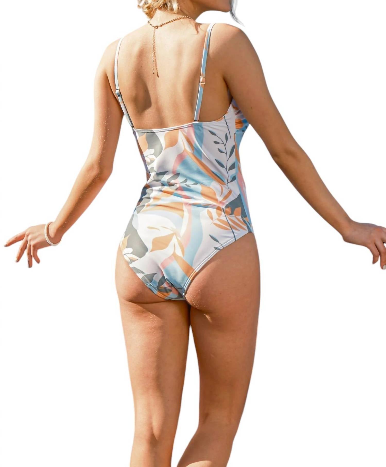 This one-piece swimsuit features a wire V-neck front and adjustable straps for a customizable fit. It is made from 85% polyester and 15% spandex, with a lining composed of 95% polyester and 5% spandex.
