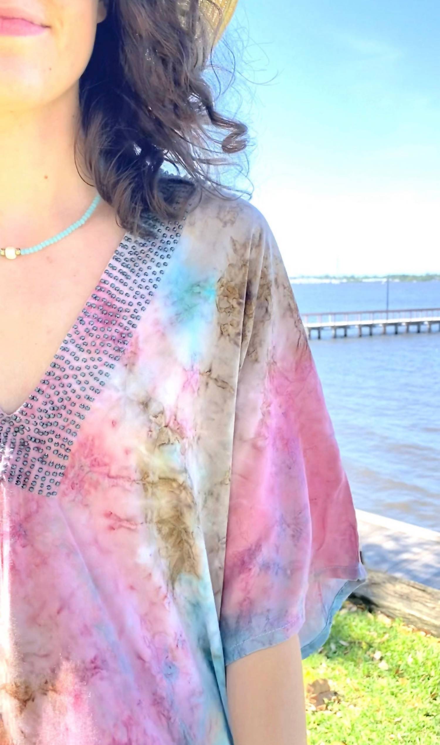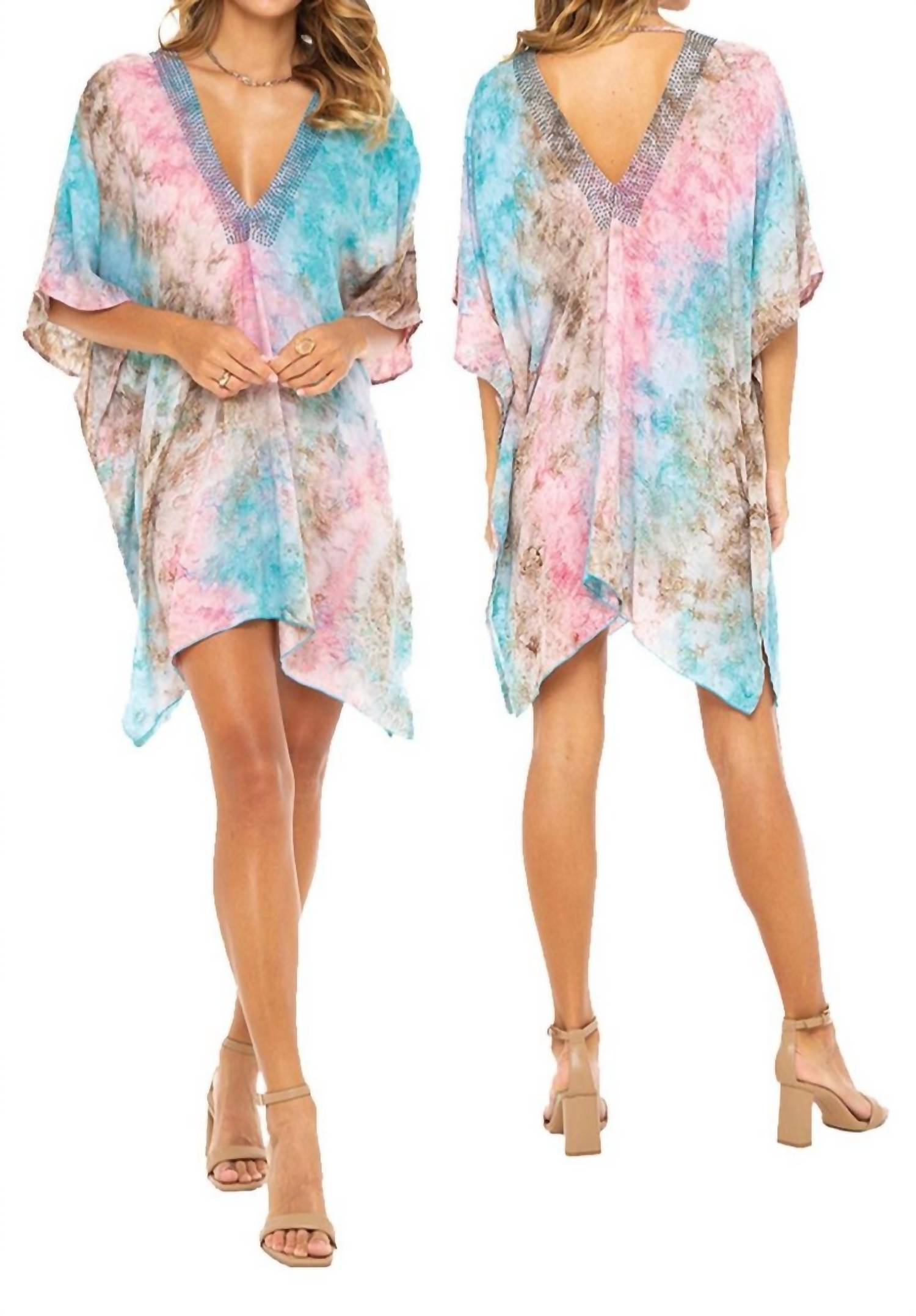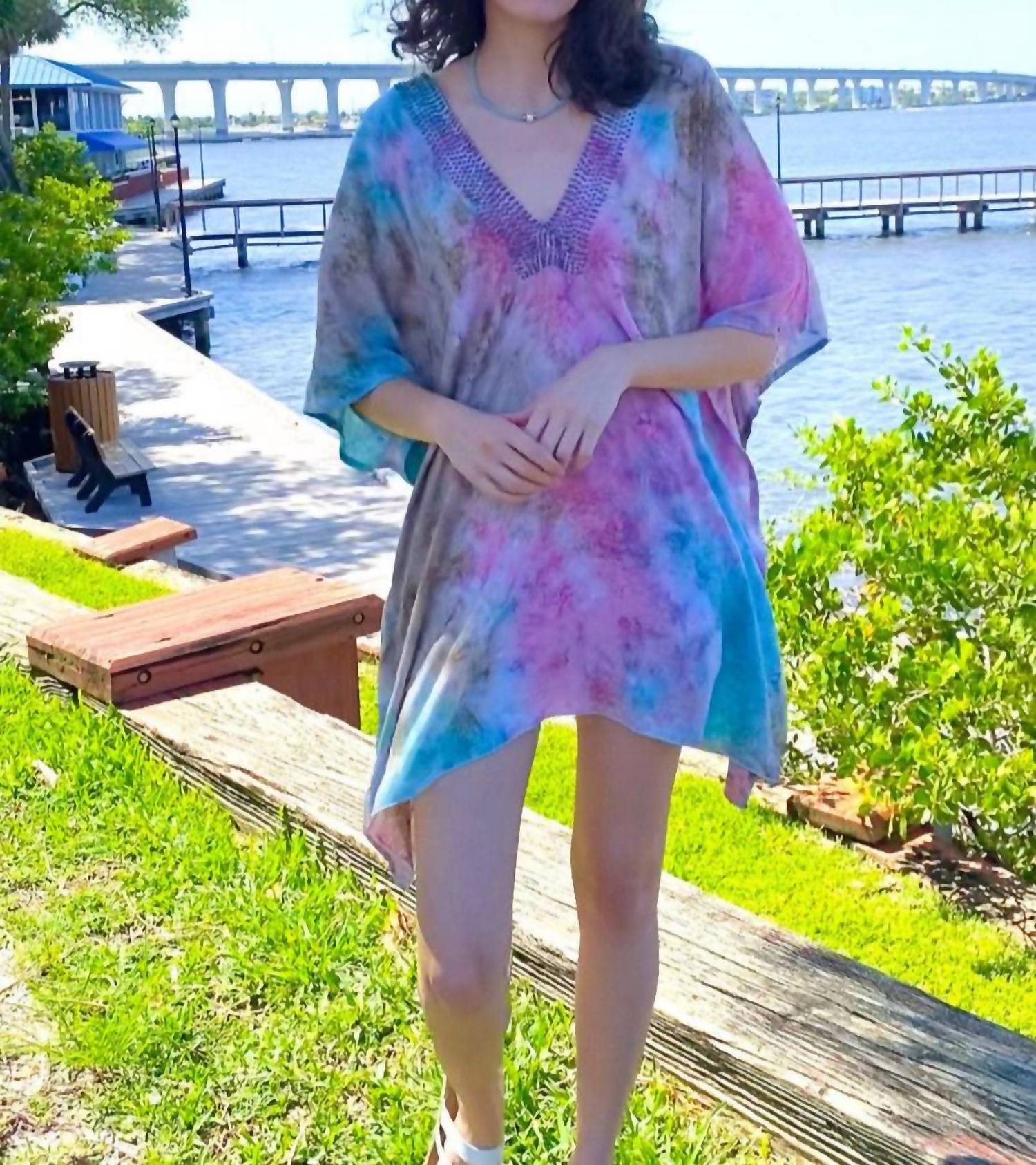 You're going to want to pack this for your next vacation! Introducing the Sunkiss Caftan by Khush, a dreamy multicolor coverup that's perfect for sunny escapades. Designed with flutter sleeves and a V-neck, it's adorned with exquisite beading and a vibrant tie-dye pattern. Crafted from 100% soft, lightweight rayon, this piece offers full coverage and comfort. Make a statement at the beach or pool with this standout caftan.