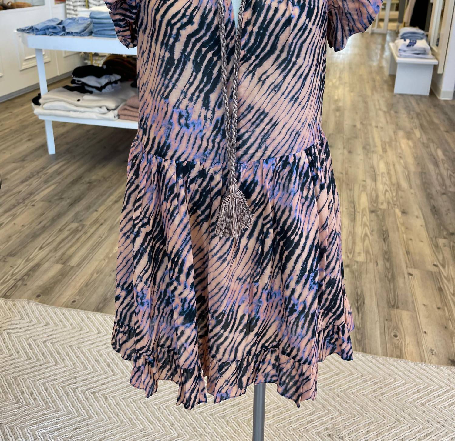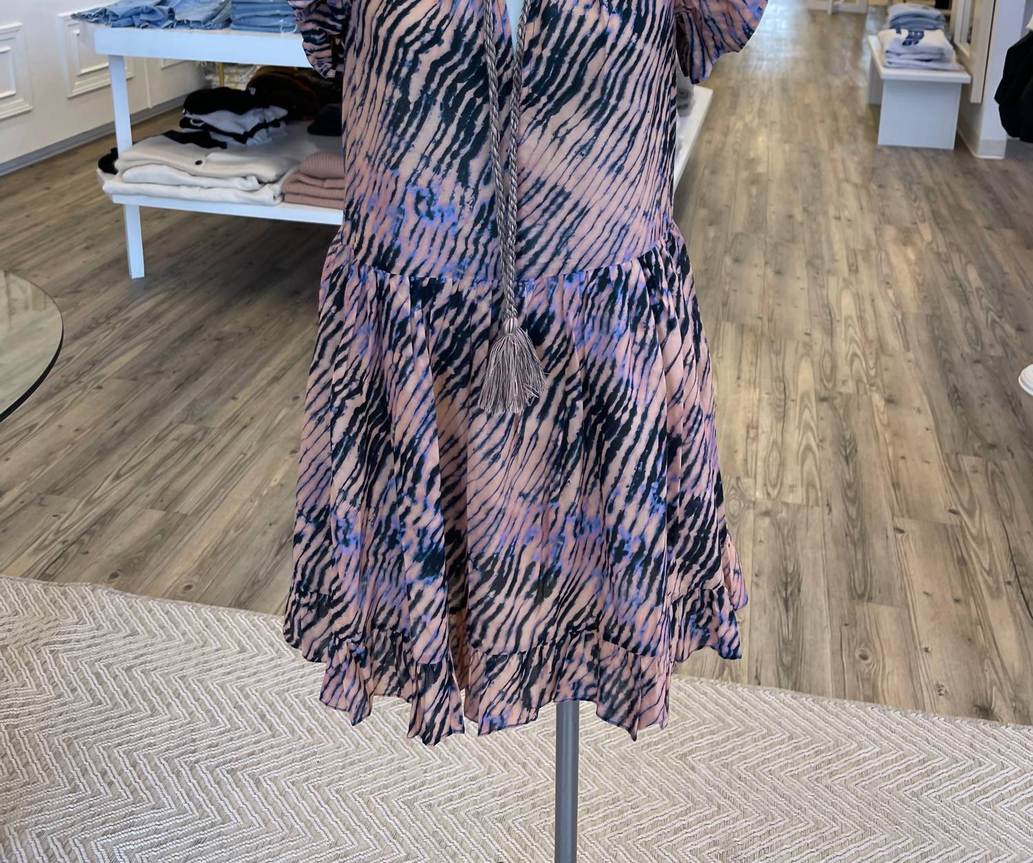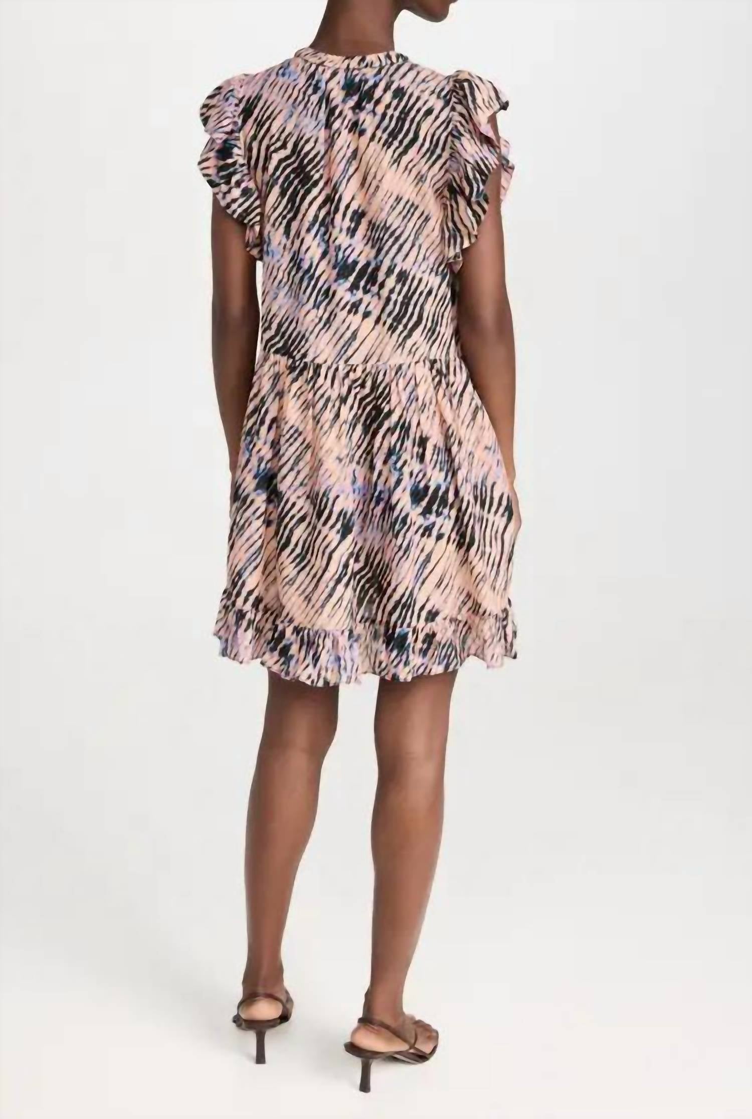 You're going to want to pack this for your next vacation! Shell: 55% cotton/45% viscose. Fabric: Lightweight, non-stretch weave. Pleated neckline with split V and braided tassel tie. Gathered waist and ruffle hem. Flutter sleeves. On-seam hip pockets. Stripe tie-dye print. Pullover design, no closure. Dry clean. Imported, China. Measurements from size S: Length: 34.5in / 87.5cm, from shoulder. Model is wearing size Small [Height5'11" / 180cm, Bust31" / 78cm, Waist24" / 60cm, Hips35" / 88cm]