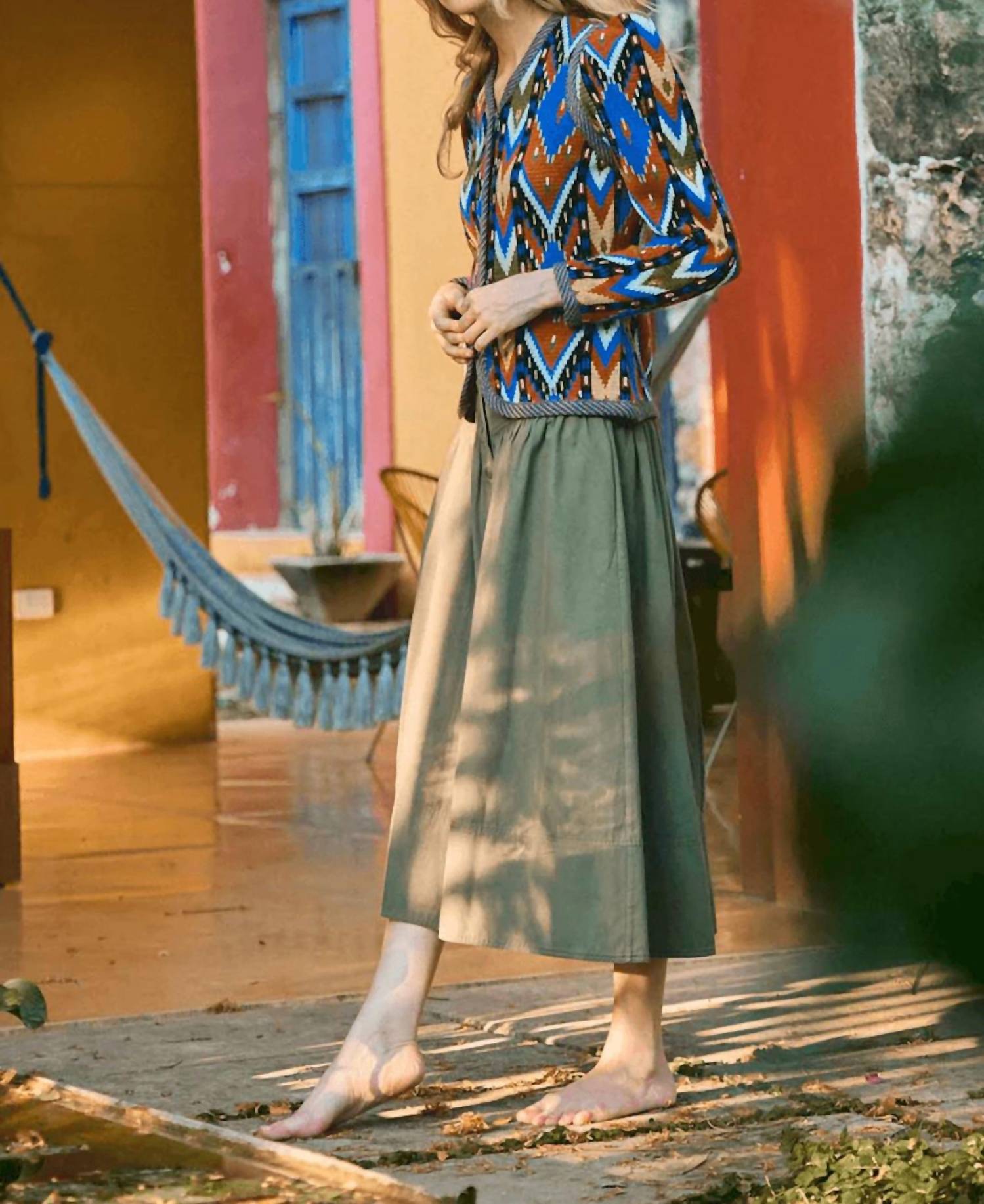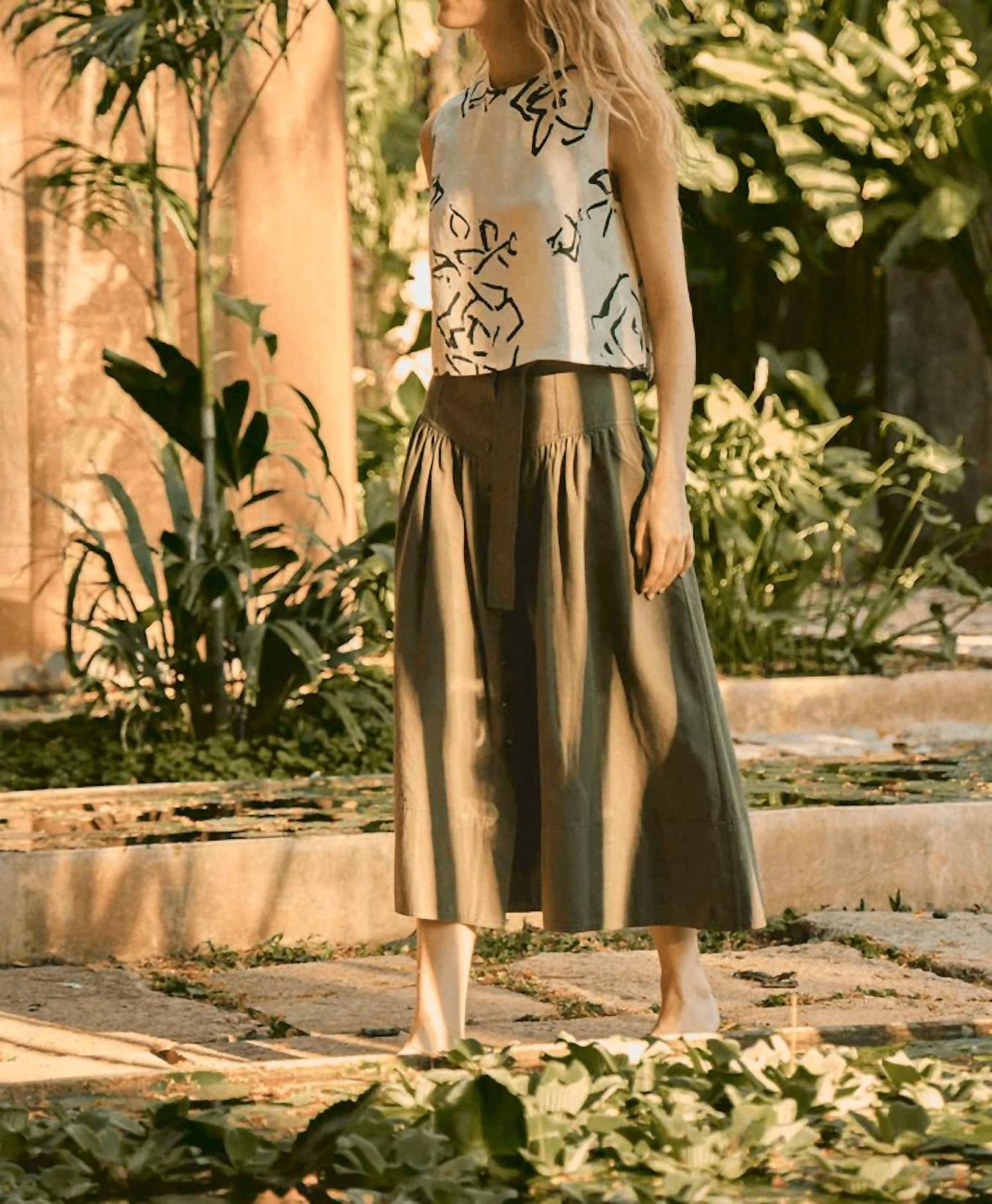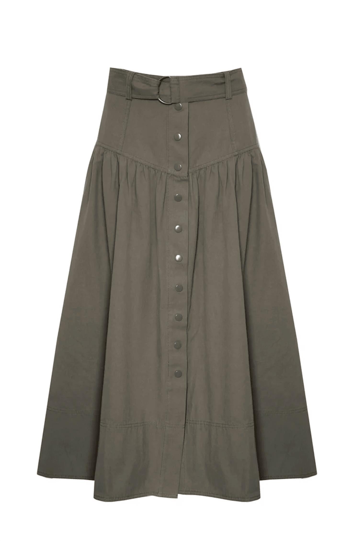 Meet the Delaney Midi Skirt by Hunter Bell, a stunning addition to your fall wardrobe in Army Green. Crafted from 100% Cotton, this solid pattern A-line skirt features a midi length of 40 inches and is perfect for seasonal gatherings. Designed with functional side seam pockets and a snap front closure, it includes an optional antique brass D-ring closure belt for added style. Care is easy with machine wash instructions.