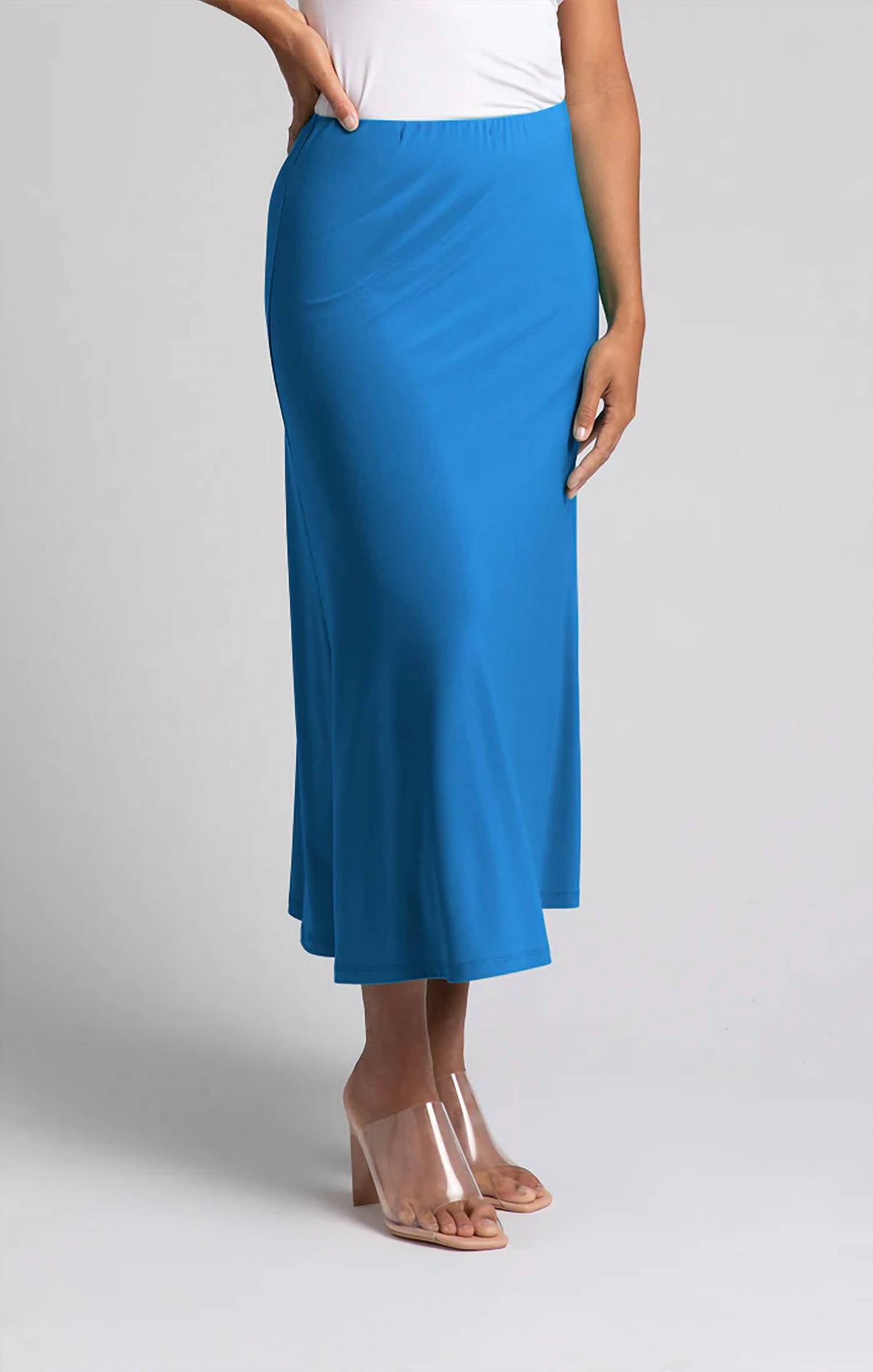 Discover the Essential A-Line Skirt by Sympli, a stylish staple in a captivating solid marine hue that's perfect for spring. This women’s piece, crafted with 94% polyester and 6% spandex, offers comfort and flexibility with its pull-on closure. Designed in a long calf-length A-line silhouette, it effortlessly combines tradition with modern grace. Proudly originating from Canada, this skirt requires machine wash in cold water and line dry to maintain its pristine condition.