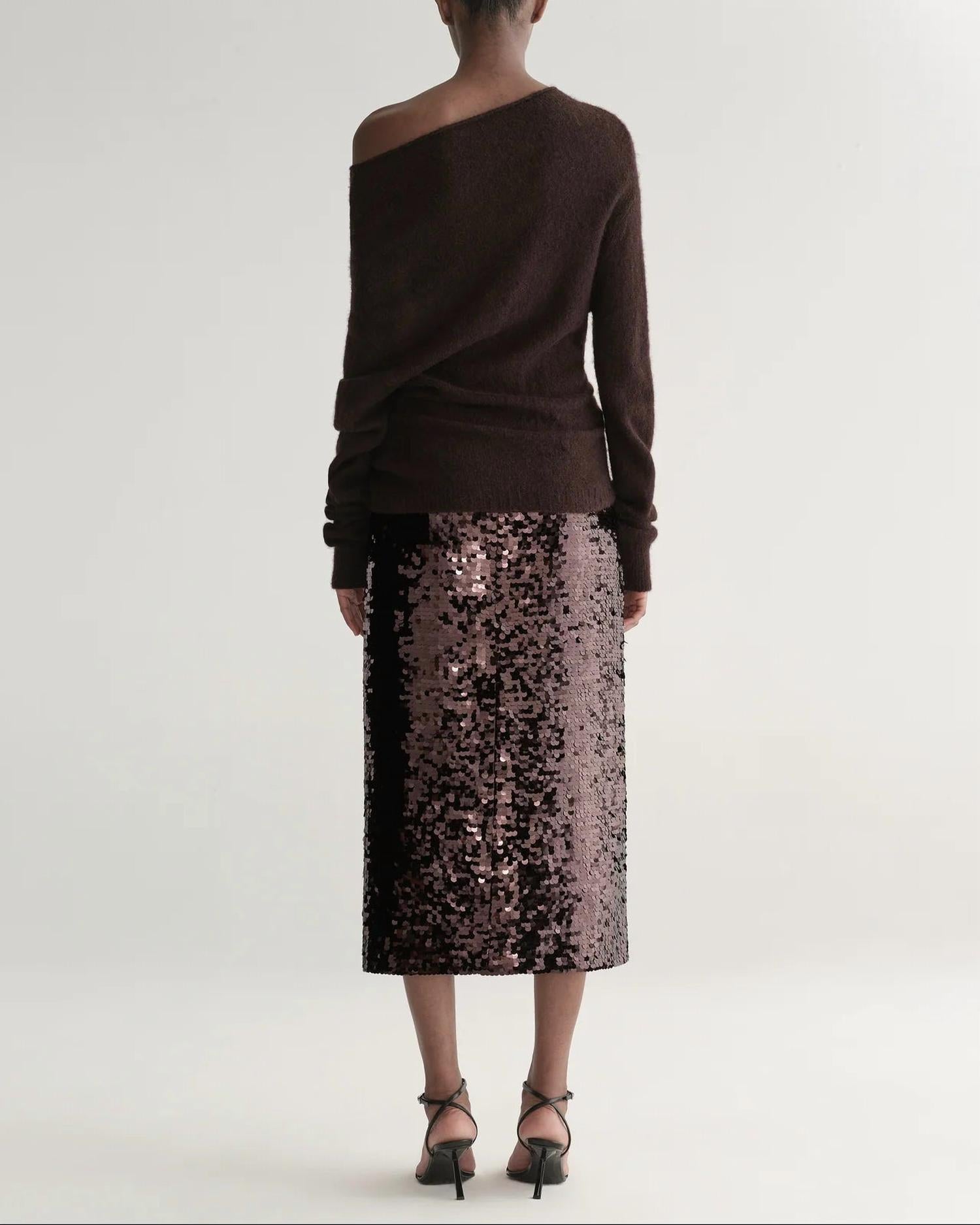 Elevate your evening attire with the Kali Sequin Midi Skirt by A.L.C., a stunning piece in an eye-catching merlot hue perfect for sophisticated gatherings. This mid-length skirt features a straight silhouette adorned with paillette sequins, offering a shimmering, textured appeal. Crafted from 100% Polyester with a contrast of 70% Triacetate and 30% Polyester, it closes with a discreet side zipper and is fully lined for comfort. Measuring 32.5 inches in length, this skirt is best maintained by dry cleaning, promising a polished look for any cocktail party or New Year's Eve celebration. Model is 5'11" wearing size 2; waist 23", hips 34.5".