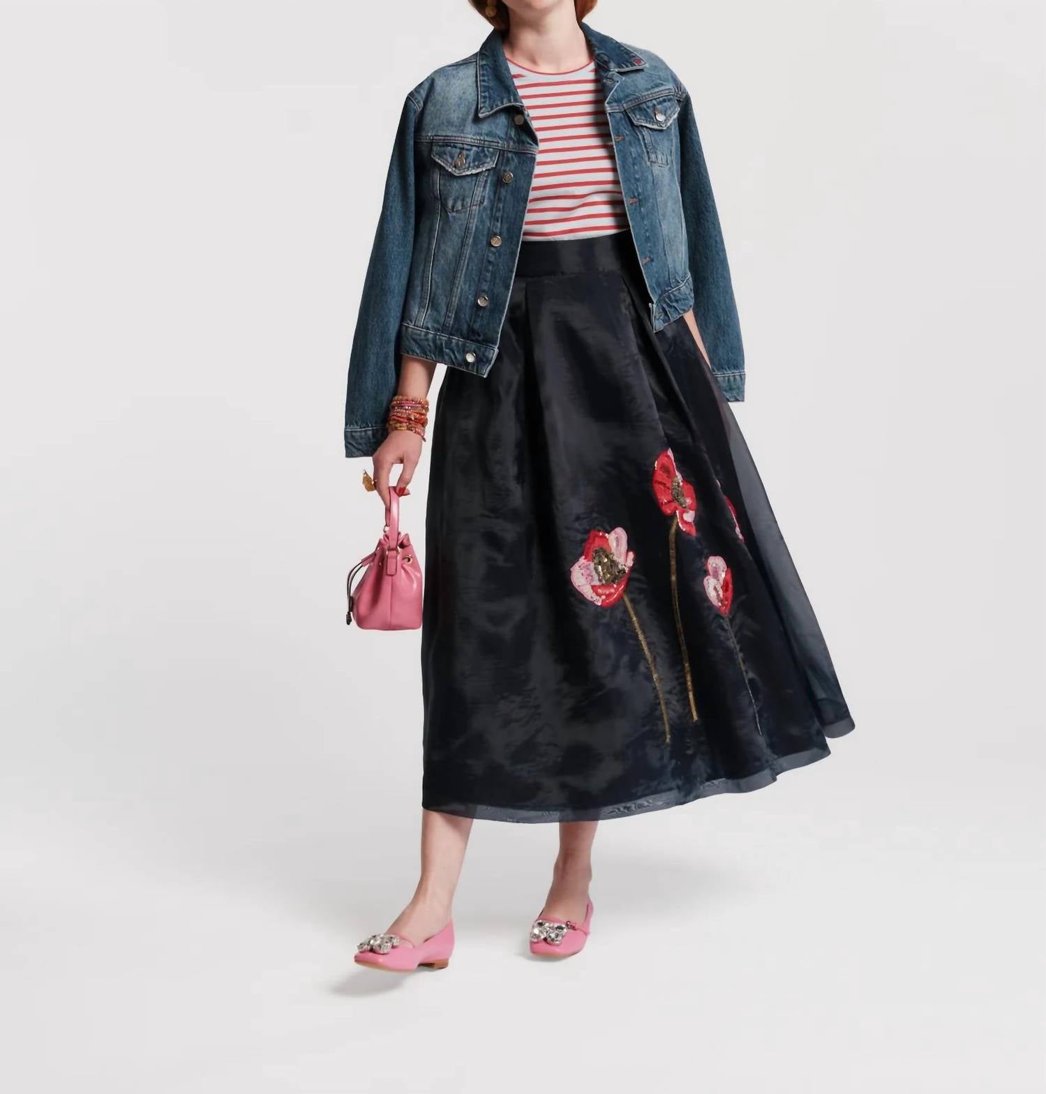 Talk about a standout. The Shea Maxi Skirt brings just the right dose of drama. A full skirt cut in a rich night-sky navy and finished with four sequened poppies, it’s a wearable work of art. The silhouette is easy and elegant, made to move with you. Bonus points for a comfortable elastic back and, yes, pockets. Flattering A-line silhouette for an effortlessly chic look Elastic back detail for added comfort and flexibility Features side zipper for easy wear & pockets Made from 100% Polyester for a lightweight, durable feel Made in Turkey
