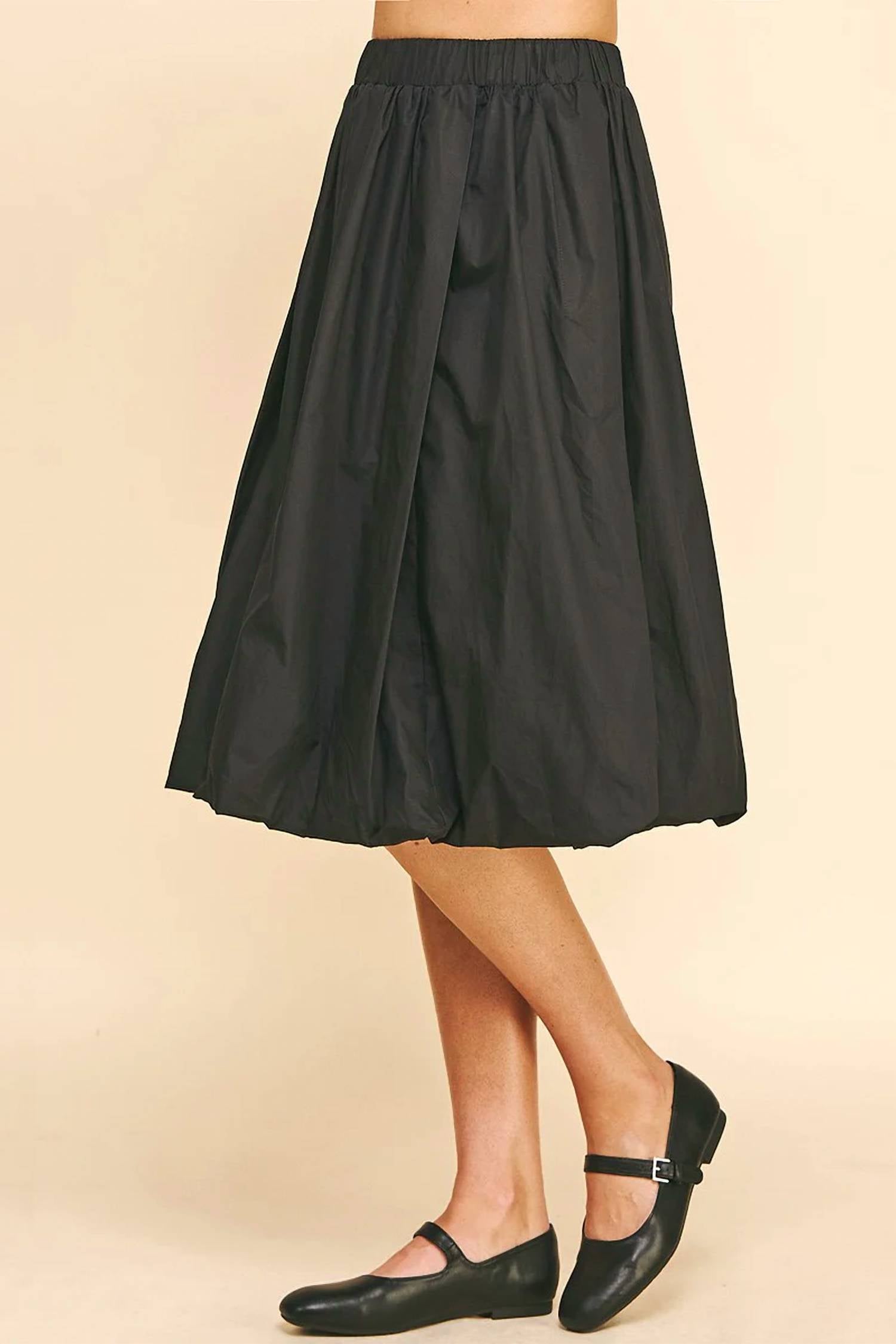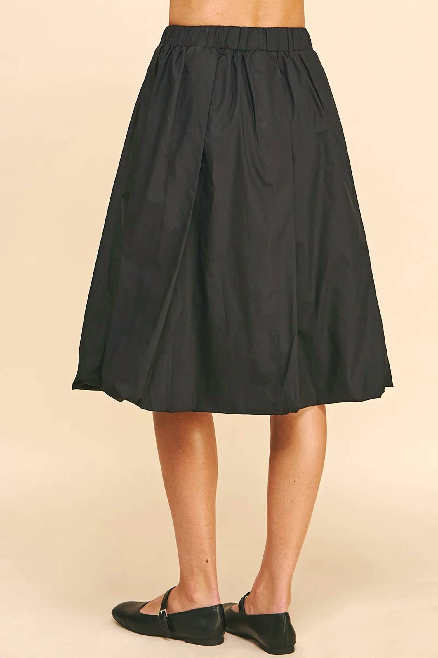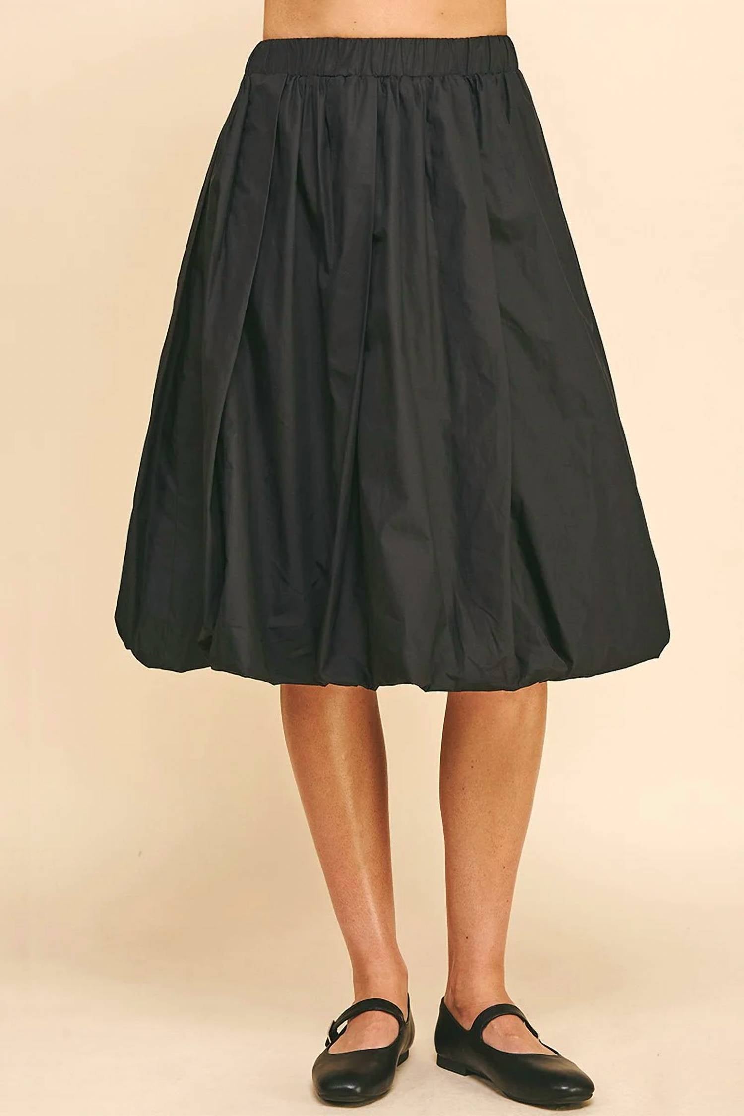 This knee-length A-line skirt features a bubble hem, elastic waistband for comfort, and is crafted from 100% cotton, offering a relaxed yet stylish silhouette; the model is wearing a size small.