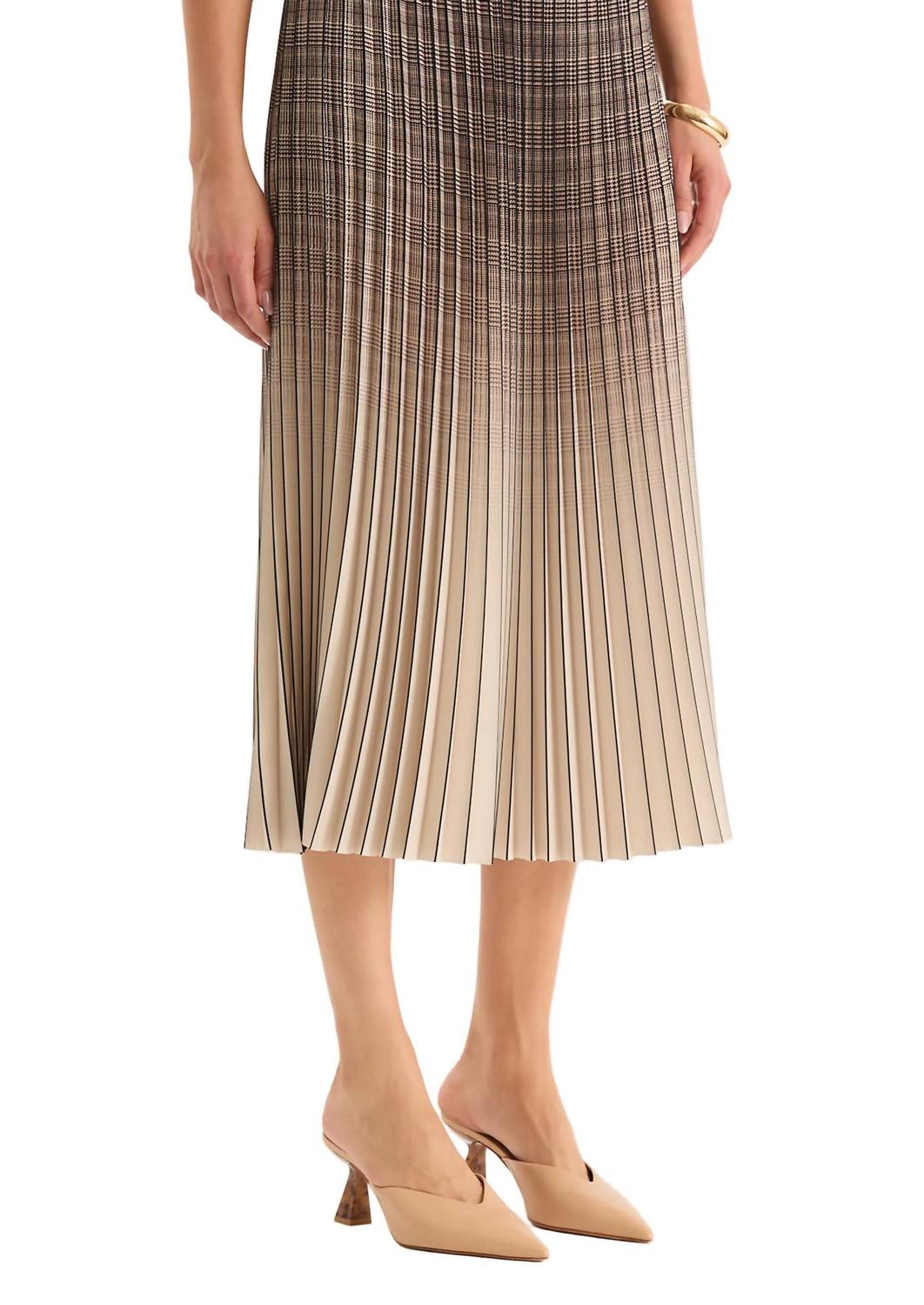 The Cara Skirt by Tyler Boe is an elegant piece perfect for a dinner party, showcased in a chic hombre beige. This A-line skirt features an elasticized waistband and allover pleats for a flattering silhouette. Crafted entirely from 100% polyester, it offers a patterned design with guaranteed comfort. Care for this sophisticated garment by dry cleaning only.