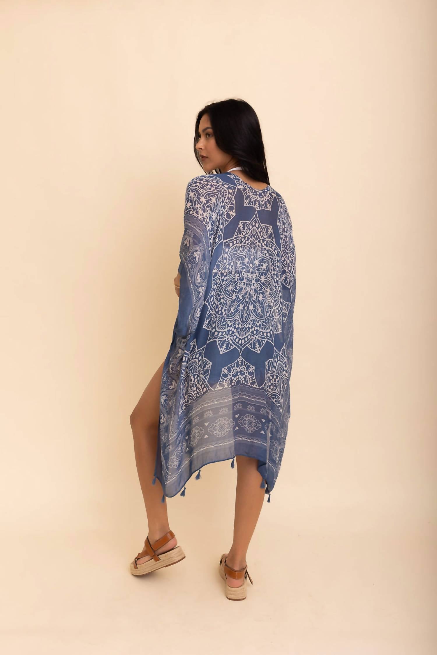 Add this to any outfit for a perfeclty polished look. Introducing the Boho Festival Lightweight Mandala Kimono by LETO, a stylish piece in sophisticated navy. With a stunning design, this garment features an intricate mandala pattern and playful tassels that bring a sense of movement to its lightweight viscose fabric. Made from 100% Viscose, this kimono offers a versatile and chic layering option. Embrace its bohemian charm and enhance your wardrobe with this elegant addition.