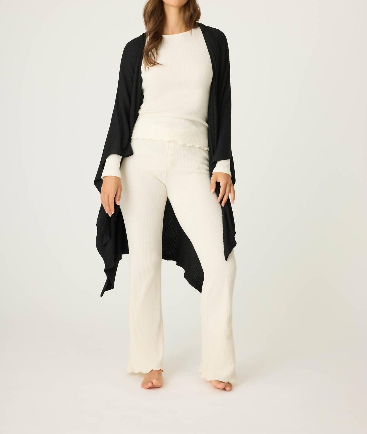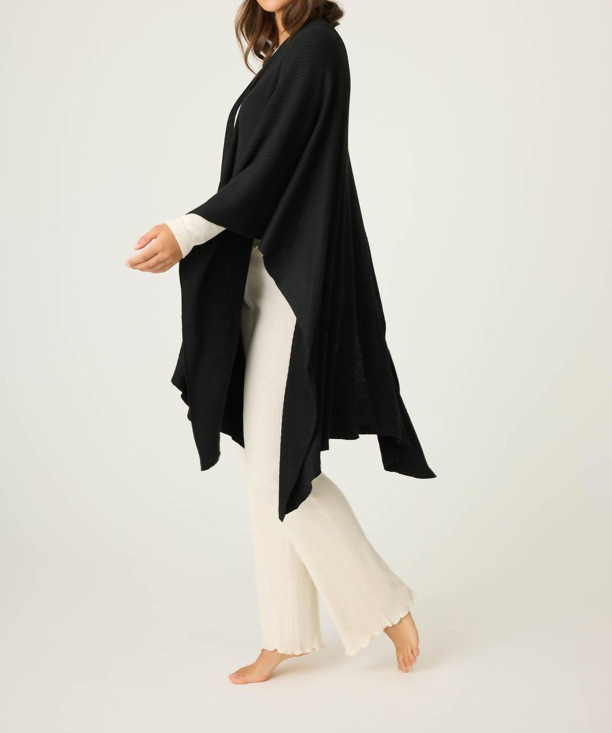 Both classic and versatile with the endless ways you can wear it. Discover the Jet Set Luxe Rib Wrap by PJ Salvage, an elegant choice for both lounging and casual outings. This women's wrap is crafted from an ultra-soft Viscose Blend, offering a ribbed texture that adds sophistication to your wardrobe. With its sleek design and open front, it's ideal for layering over loungewear or pairing with jeans. Available in classic Black for effortless style.
