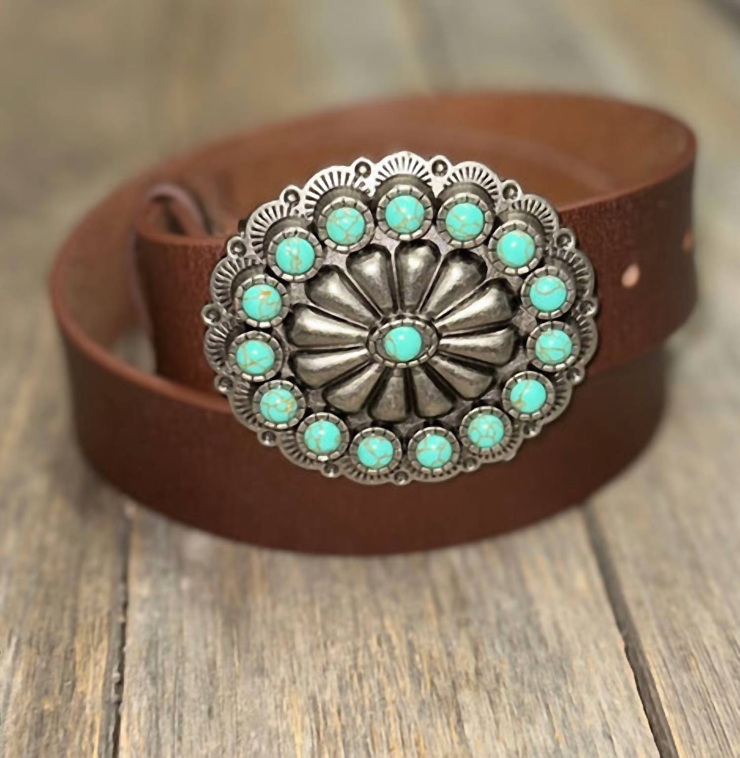 Add a touch of western flair to your outfit with the Women's Western Turquoise Buckle Belt by Anzell. Designed with a striking turquoise buckle, this belt is crafted from high-quality leather. It features a wide width of 1.35 inches or 35 mm, and offers strap lengths from buckle front to middle hole: S: 33", M: 36", L: 39". The belt also includes an additional length of 6" from the middle hole to the tip end, ensuring a good fit for various styles.
