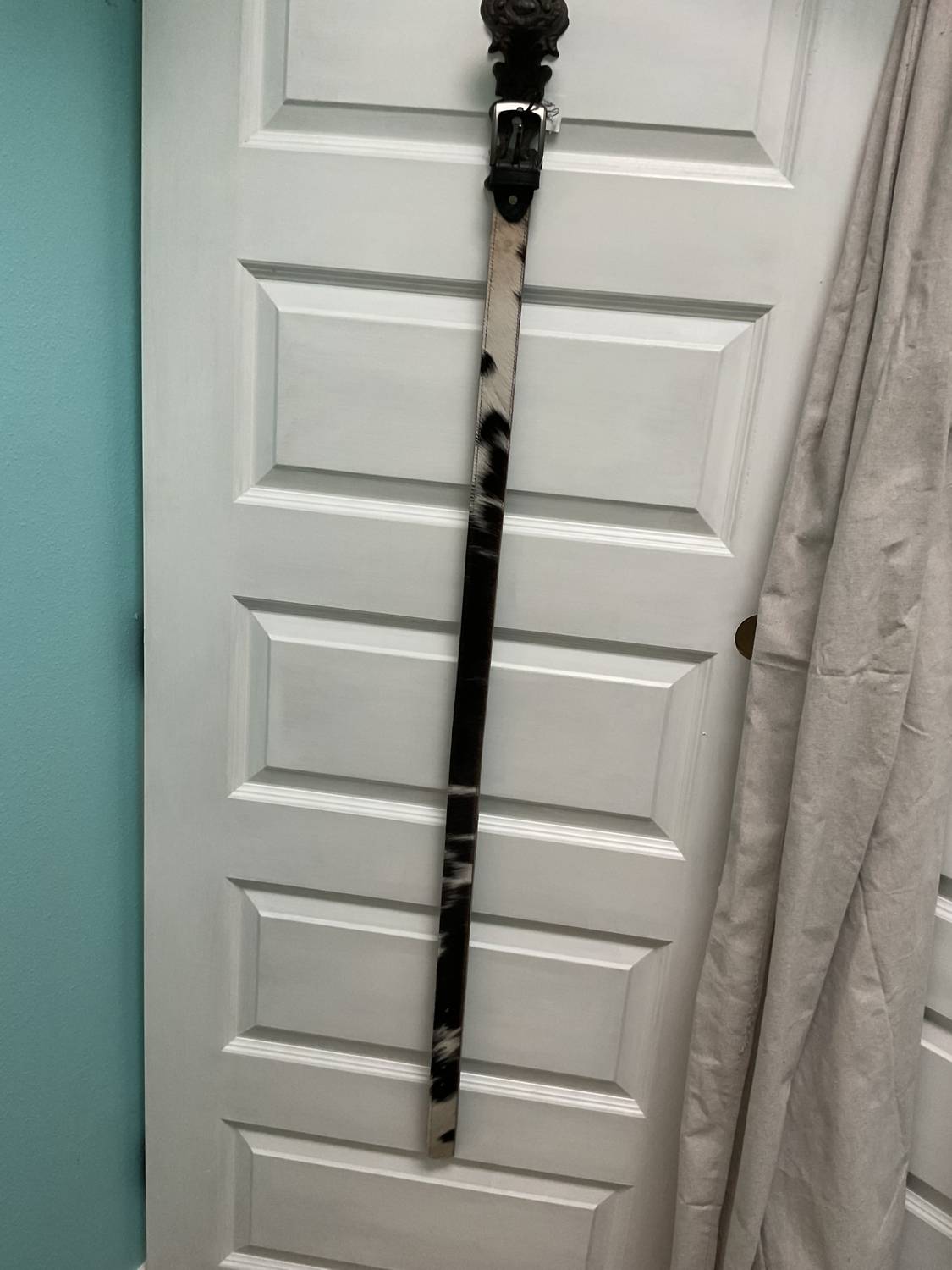 Accentuate your wardrobe with this stylish women's belt, expertly designed to offer a perfect balance of fashion and function. Besides, you can never have too many belts, right? It features a black and white cowhide pattern.