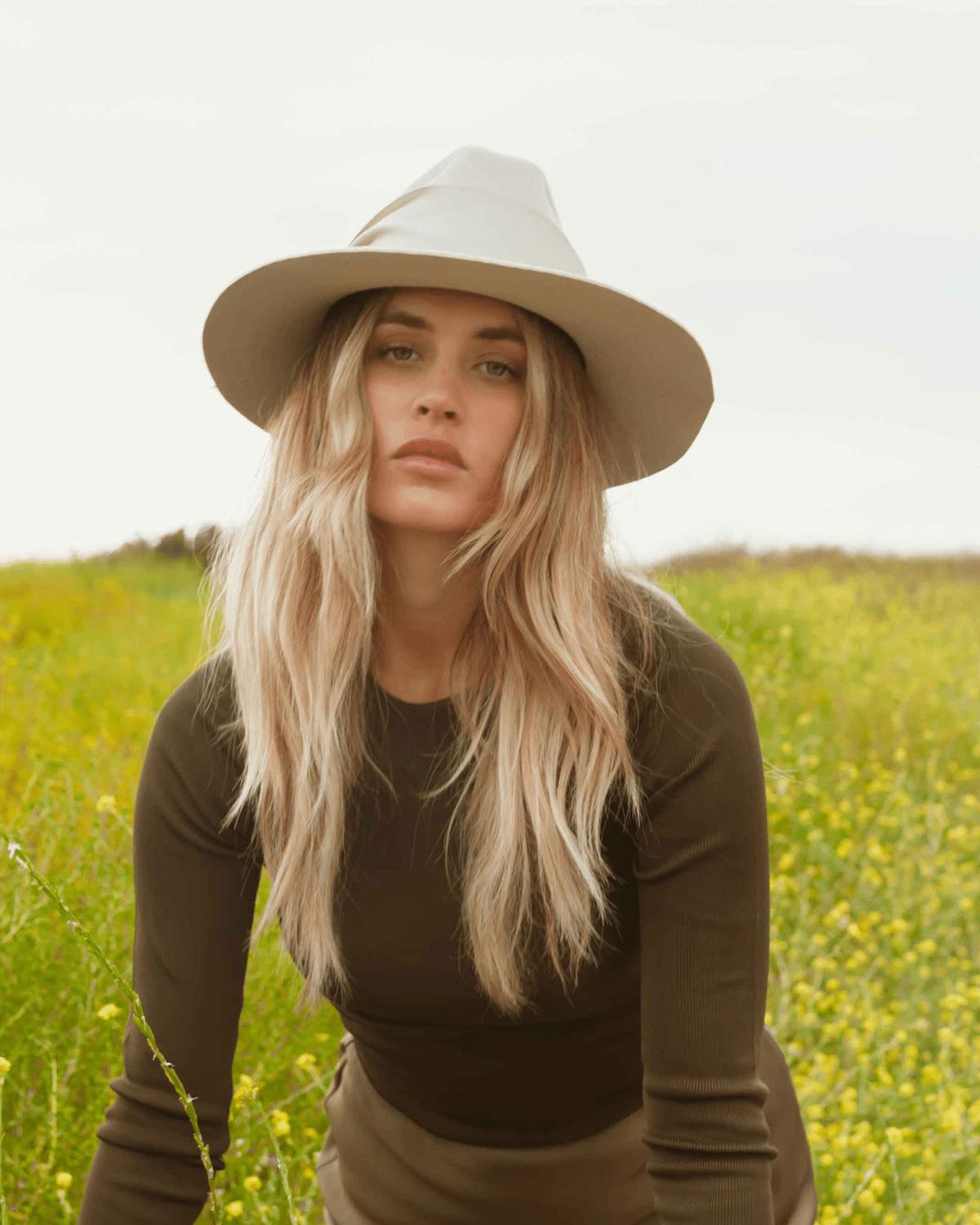 Elevate your ensemble with the Women's Gardenia Felt Hat by Freya, a chic taupe fedora adorned with an oversized caramel grosgrain ribbon accent. Crafted from wool felt, this hat showcases a broad 8.5 cm brim for a modern flair and comes in two sizes: Small/Medium (57-58cm) and Large (59cm). Handmade in Ecuador, each piece is unique, celebrating the natural beauty and variation of its artisanal process.
