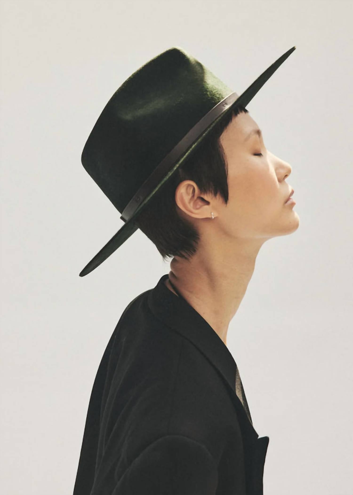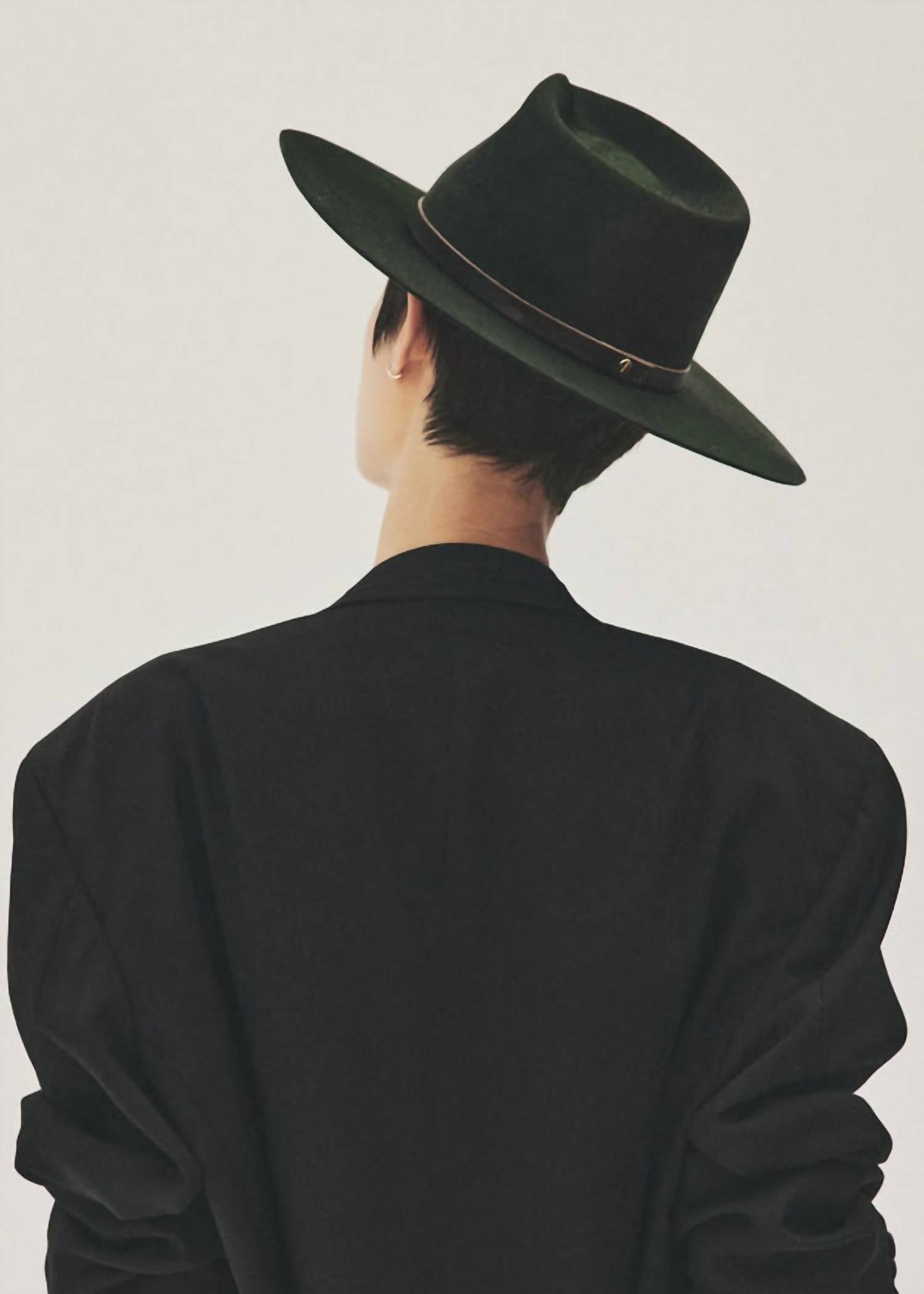 Introducing the Janessa Leone Women's Wynn Hat, a stylish choice in a deep green hue. Crafted from 100% sustainable wool, this hat features a 1/2" brown leather band and a distinctive hand-pinched front. Made in the USA, the hat's design is further enhanced with a brim measuring 3.25" and a crown of 4". The size medium measures approximately 55cm, offering a sophisticated accessory for your wardrobe.