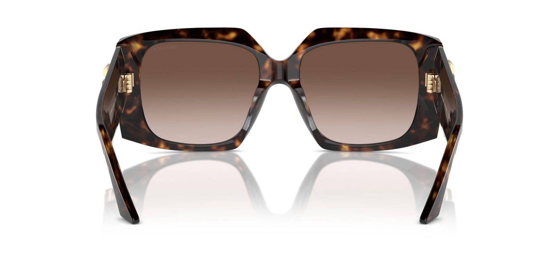 Blending fashion and practicality, these stylish shades are chic and mandatory. Stand out from the crowd and safeguard your vision with these stand-out sunglasses. Enhance your accessory collection with the Women's JC5006U 500213 Sunglasses by Jimmy Choo, combining high-fashion with sustainability. Crafted in Italy, these square frame sunglasses feature a recycled acetate construction paired with bio-nylon gradient brown lenses for a chic look. Offering 100% UVA and UVB protection, the design is completed with the iconic Jimmy Choo emblem at the temple. Dimensions include an eye size of 58mm, bridge of 18mm, and temple of 140mm, perfect for adding a touch of elegance to any outfit.