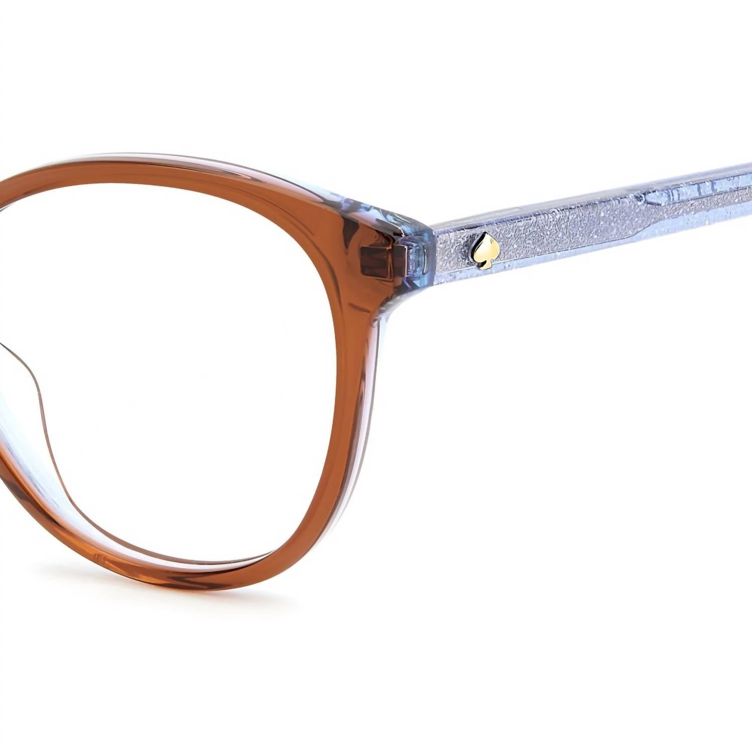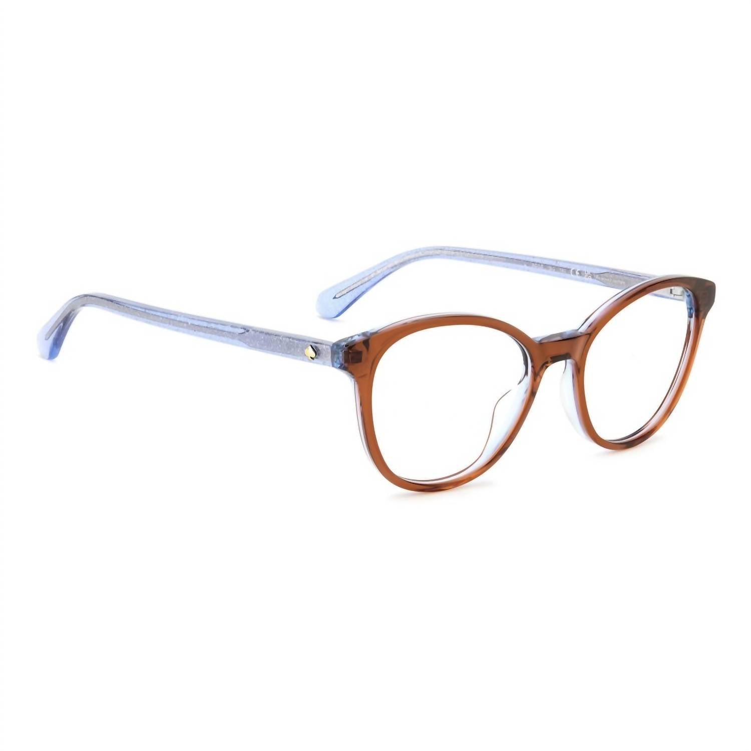Make a statement and shield your eyes in these fashionable, yet practical sunglasses. Grab these adorable shades for your next vacation and elevate your accessory game. Discover the Women's Aggie 3LG Eyeglasses by Kate Spade, blending contemporary style with eco-friendly materials. The frames are crafted from Eco Acetate, featuring a sophisticated Brown and Blue color combination. Designed with a standardized bridge width of 17mm, and rods measuring 140mm, they offer comfort and durability. The lenses are transparent demo lenses in a rectangular shape, with specifications of 50mm in length and 42.1mm in height.