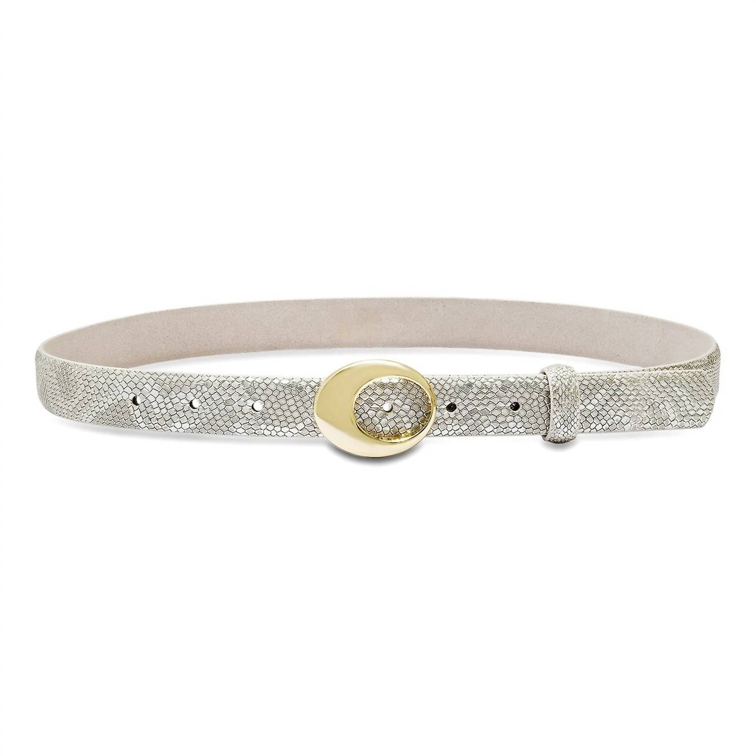 Introducing the Women's Luxe Metallic Belt by Laurel and Gold, a sophisticated accessory in a striking snake/gold pattern. Made from genuine leather with a refined feathered edge, this belt boasts a polished oval buckle and a floating leather loop. Measuring 1 inch in width and featuring seven adjustable holes, it promises a perfect fit for any ensemble. Ideal for accentuating your outfit with a touch of luxury.