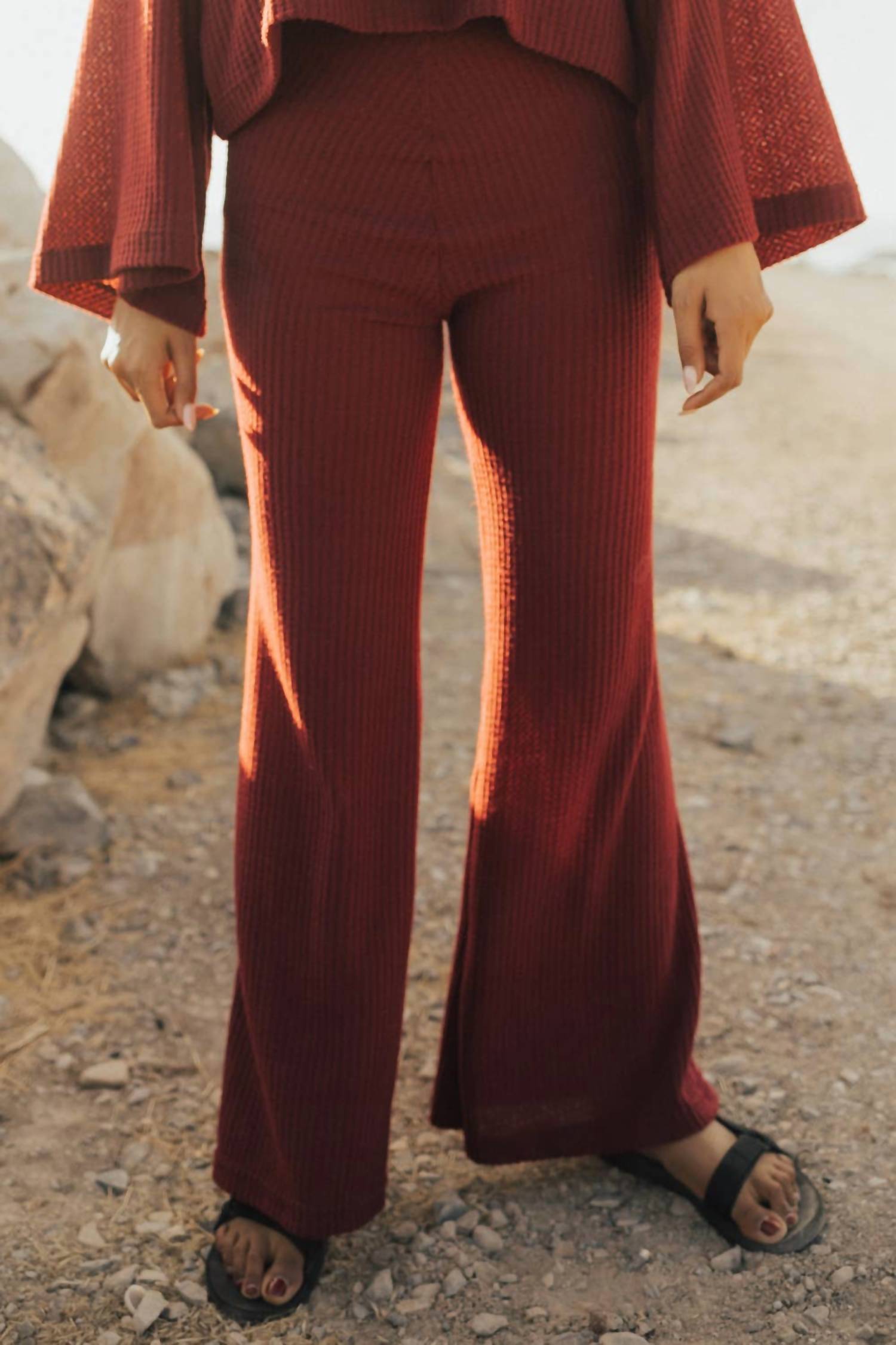 The legging you didn't know you needed and you won't want to take off. Experience comfort and sustainability with the Upcycled Cotton Flair Leggings by People of Leisure, perfect for a chic, textured look in deep cranberry red. Crafted entirely from upcycled cotton, these high-rise leggings feature a relaxed fit with a flared leg style, ideal for both day and evening wear. Made in the USA, these leggings offer a practical pull-on closure for ease and machine washability. Simply machine wash cold or warm and tumble dry on low for effortless care.