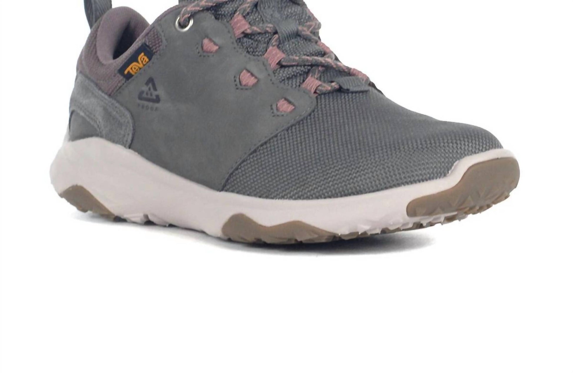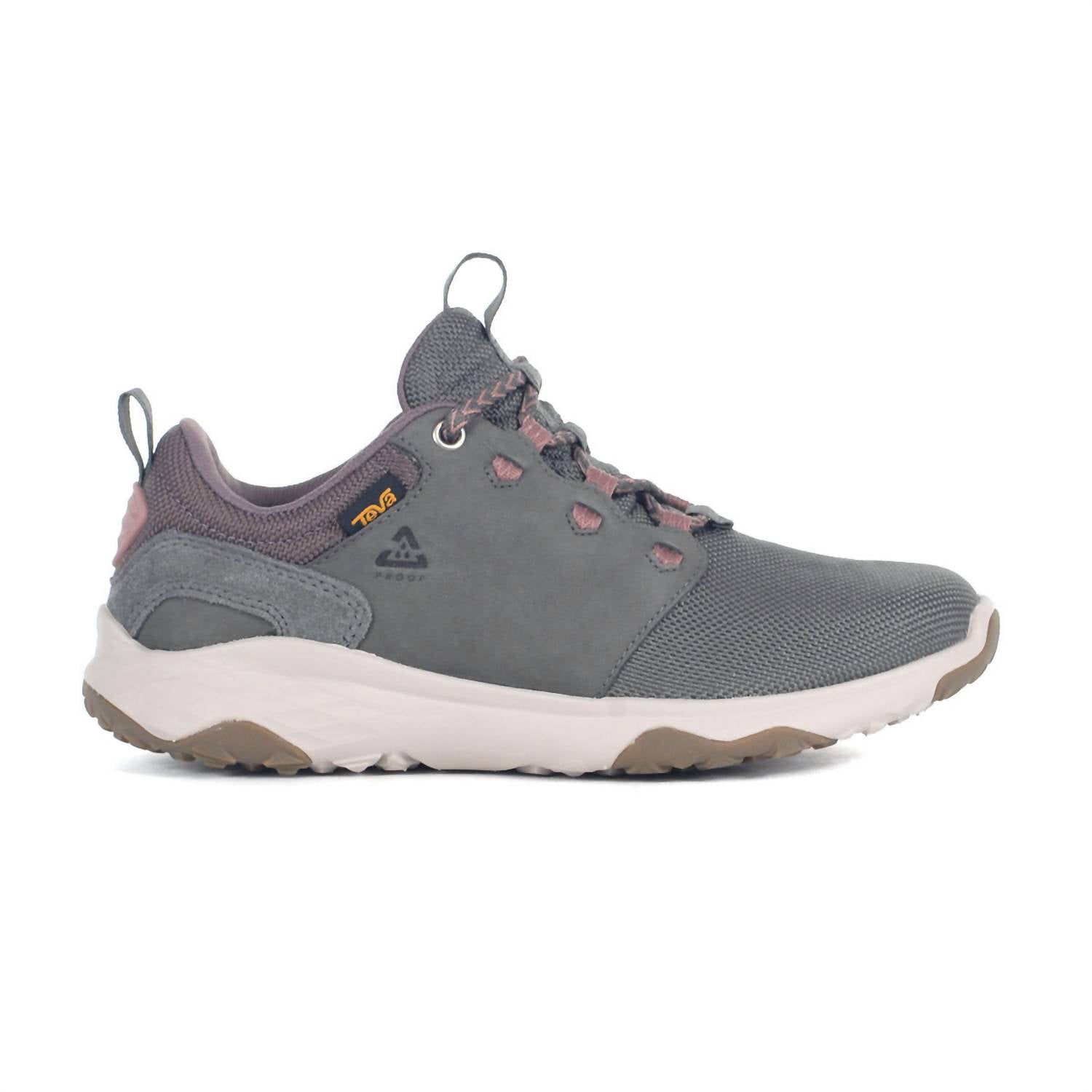 Workout in style with these adorable athletic sneakers. Meet the Teva Women's Canyonview Shoes, designed for both city sidewalks and rugged summits. Crafted in a stylish Dark Gull Grey/Burlwood color, these waterproof leather shoes ensure all-day comfort with a Float-Lite midsole, nylon shank for stability, and durable rubber outsole for traction on diverse terrains. Additional features include antimicrobial properties, microfiber lining, and adherence to the Leather Working Group's standards. Ideal for summer athleisure and fitness activities, these shoes exhibit a textured pattern and round toe with a flat heel for casual ease.