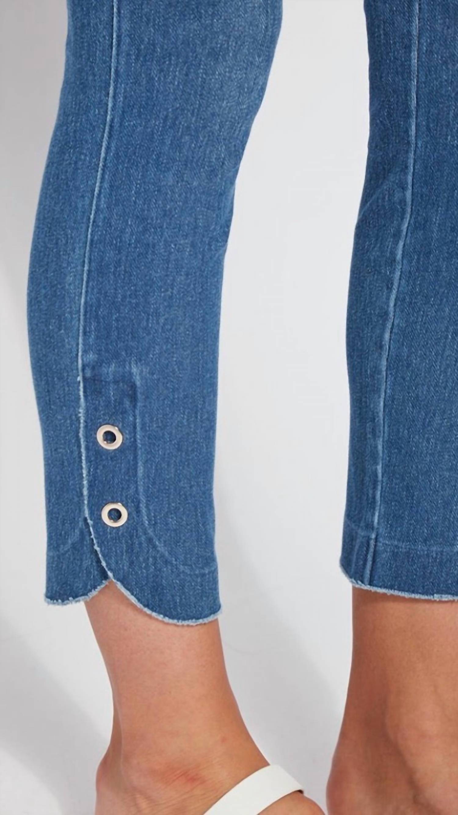 You'll be reaching for this best-selling legging all season long. Introducing the Rye Crop Legging by Lysse, crafted in a stretch knit Denim featuring a concealed patented waistband for a flattering fit. Made of a durable cotton blend comprising 95% Cotton and 5% Spandex, these leggings offer a body-hugging fit and 4-way stretch for maximum comfort. With a straight leg design and a high-rise waist, these mid wash leggings feature a pull-on closure and offer versatile styling. They have an inseam of 26 inches and come in a classic solid pattern, ideal for minimalist looks. Care: Machine wash and tumble dry. Model is 5'10" and wears a size S.