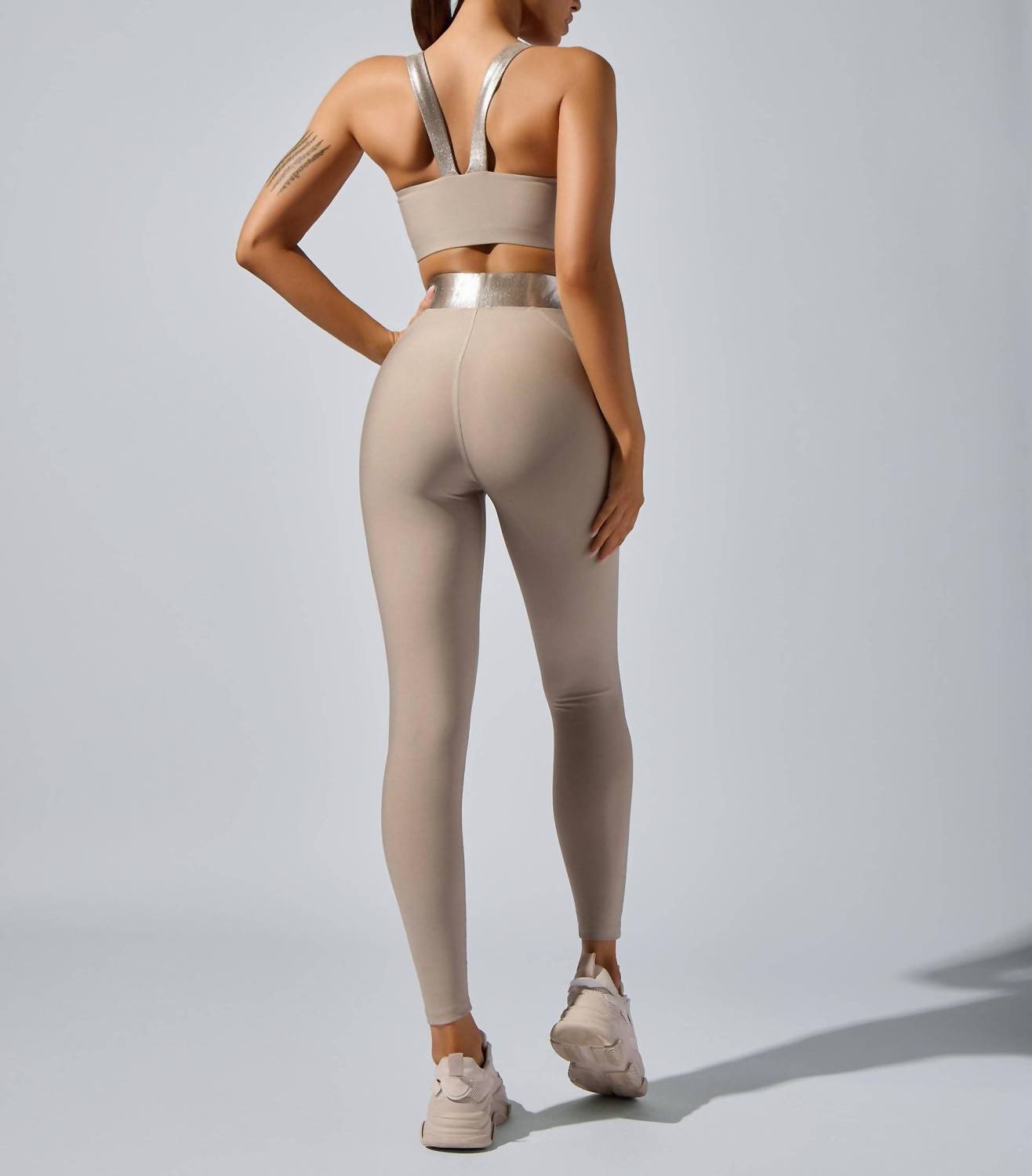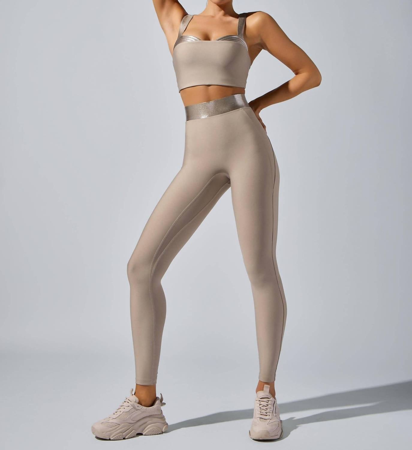 You'll be reaching for this best-selling legging all season long. Elevate your workout wardrobe, crafted for both style and performance. High-rise leggings feature a slimming side seam and a wide metallic waistband, ensuring a flattering fit with optimal support. Made from 83% recycled polyester and 17% spandex. Offer a four-way stretch and luxurious feel. Originating from US. Come with a pull-on closure. Machine washable inside out on a delicate cycle, with low tumble drying recommended. Model is wearing a size small.