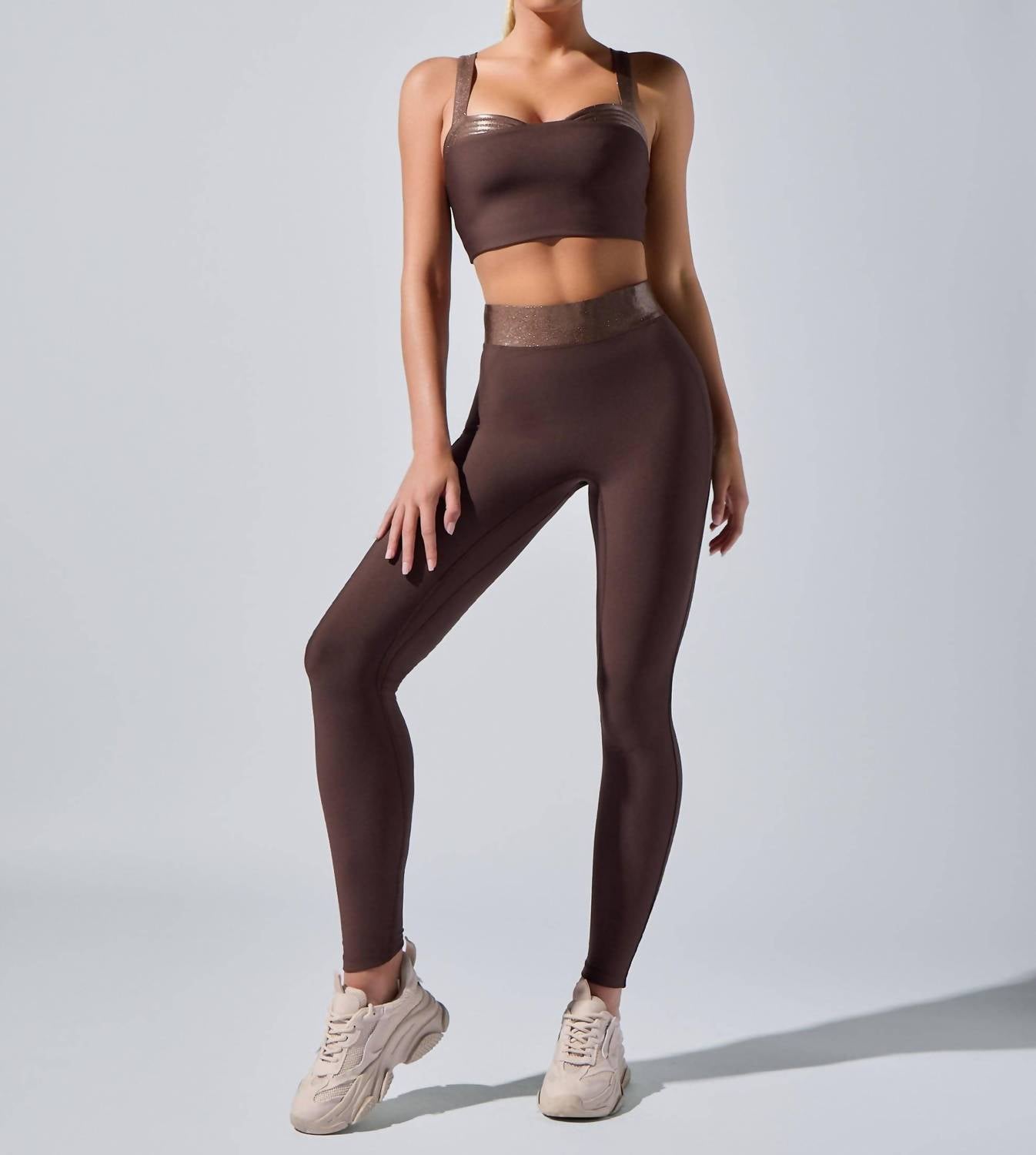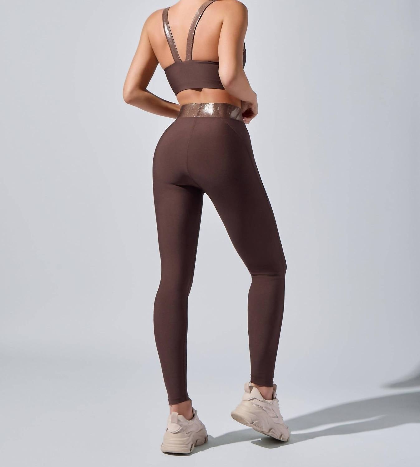 You'll be reaching for this best-selling legging all season long. Elevate your workout wardrobe, crafted for both style and performance. High-rise leggings feature a slimming side seam and a wide metallic waistband, ensuring a flattering fit with optimal support. Made from 83% recycled polyester and 17% spandex. Offer a four-way stretch and luxurious feel. Originating from US. Come with a pull-on closure. Machine washable inside out on a delicate cycle, with low tumble drying recommended. Model is wearing a size small.