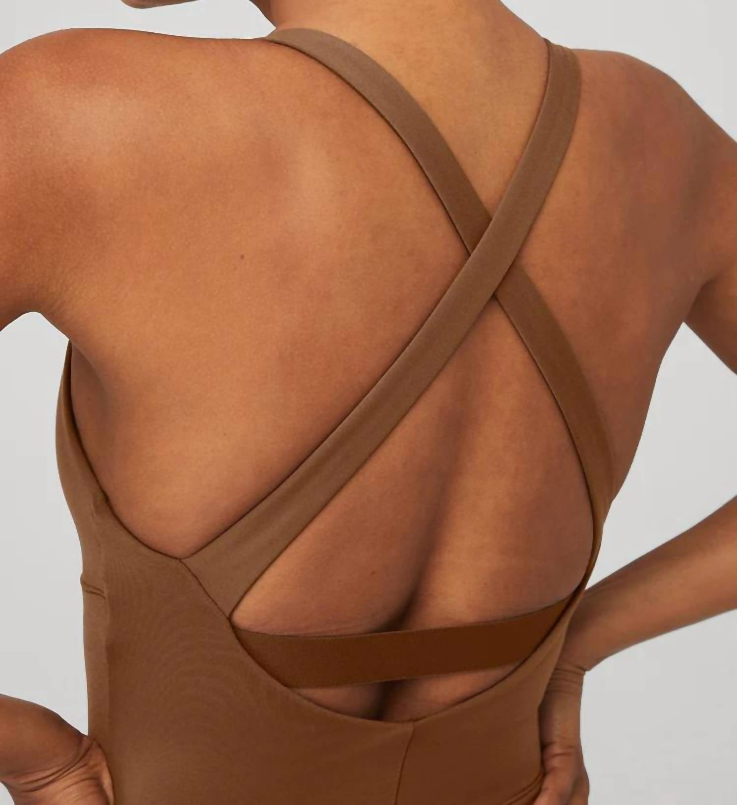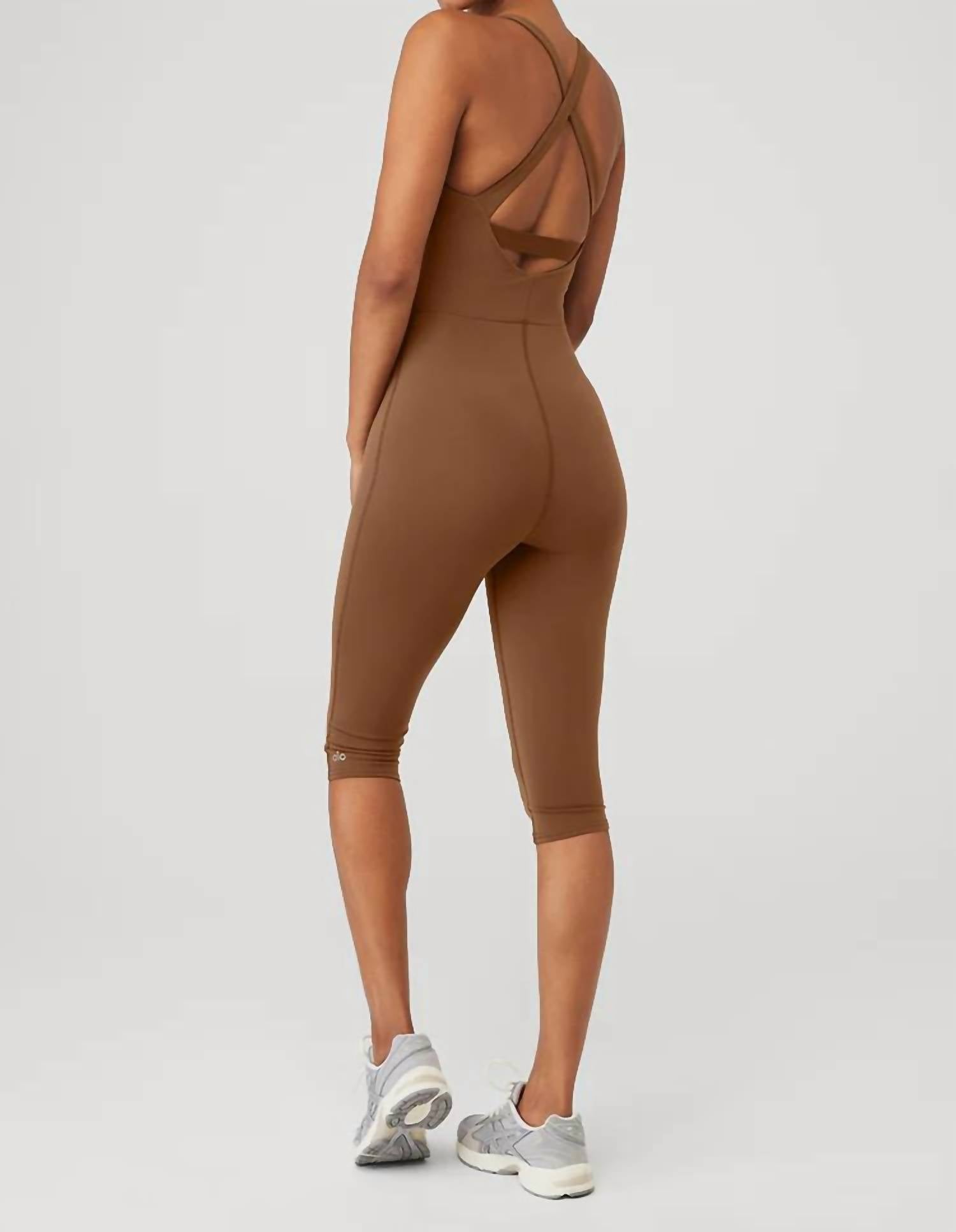 Throw it on and go! Experience the Airbrush Physique Onesie by ALO YOGA in a captivating Cinnamon Brown hue, perfect for your athleisure wardrobe. Made without pockets for a sleek silhouette, this capri-length onesie features crisscross straps and contouring seams, offering a body-skimming fit with a built-in bra and removable cups. Designed for light-to-medium support, it's expertly crafted for both studio and street, with an inseam of 16.5" for a flattering finish. Closure: Pull-on. Care: Machine wash and tumble dry.